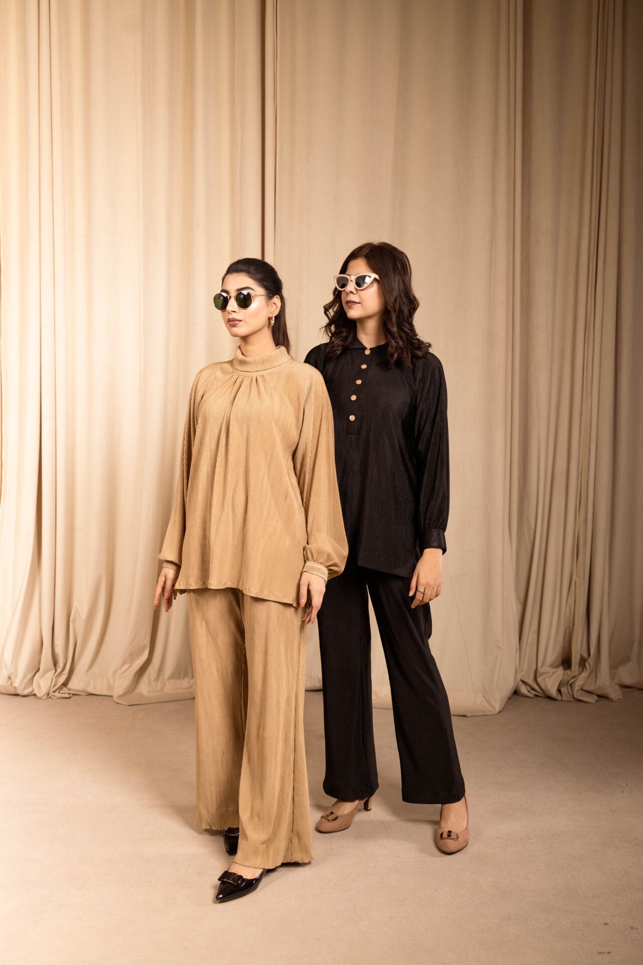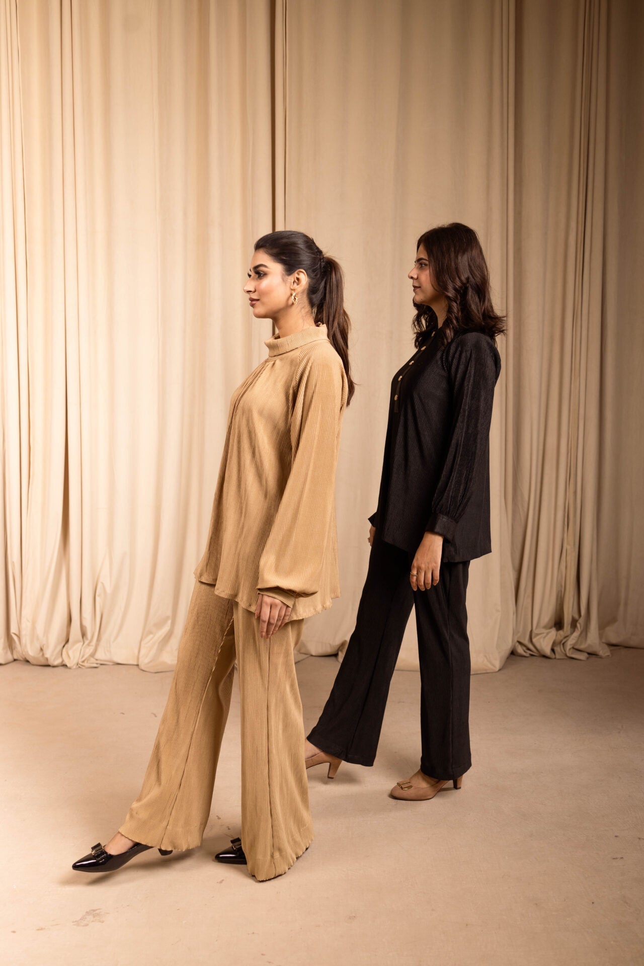 Our newest ever matching separates are a go to this winter season, paired with a coat! The shirt features a high neck blended with pleats and loose puffy sleeves. The cut of the trousers is slightly bell-bottom.