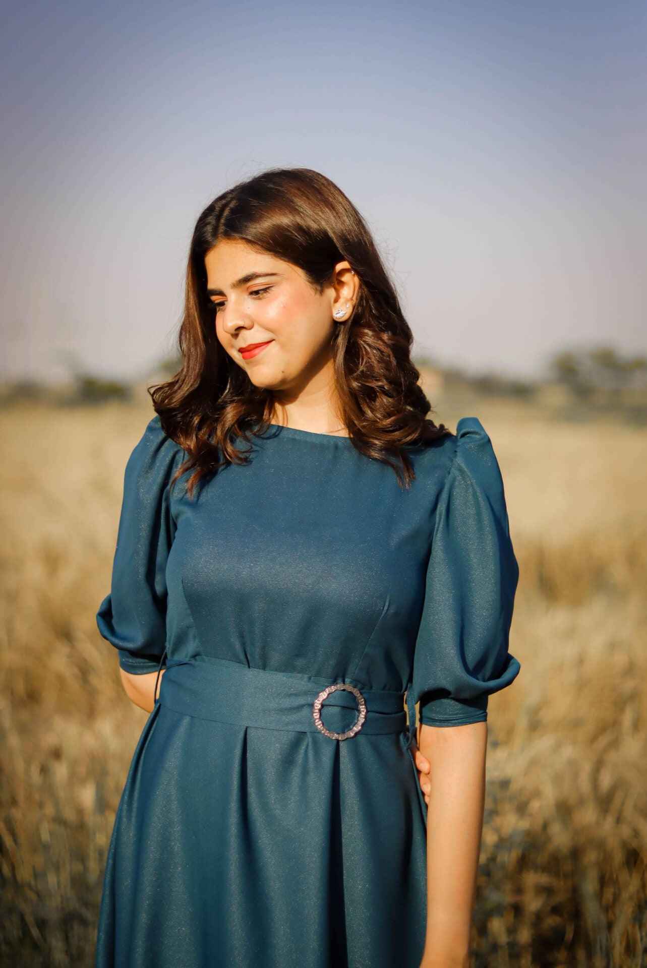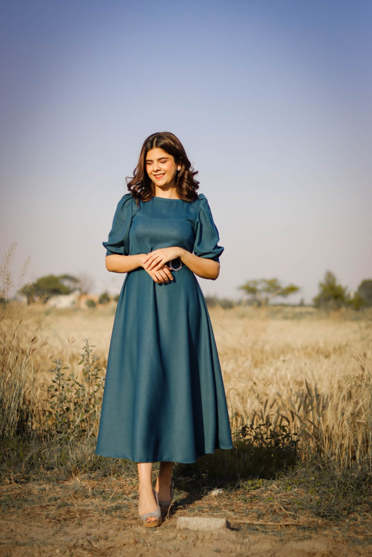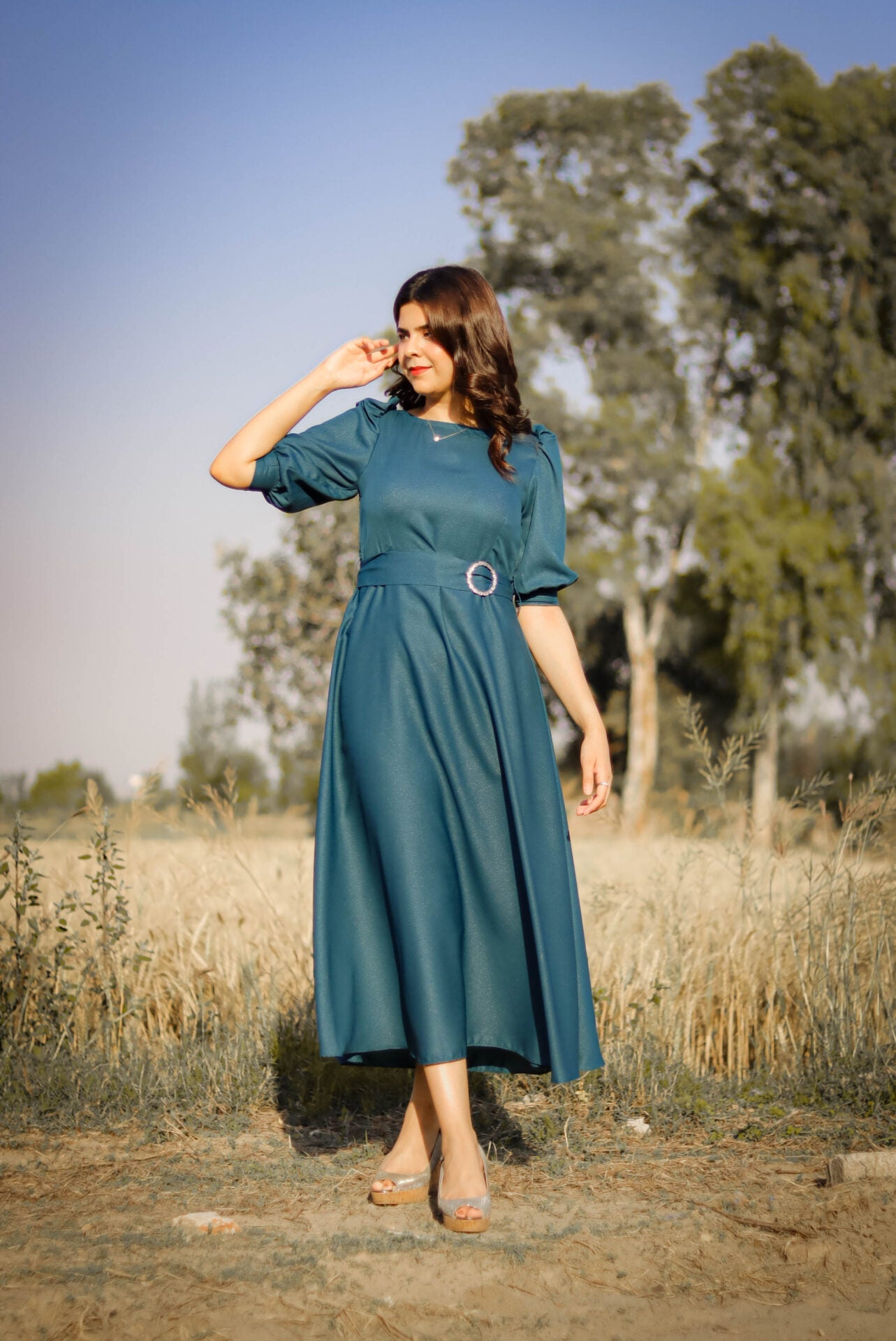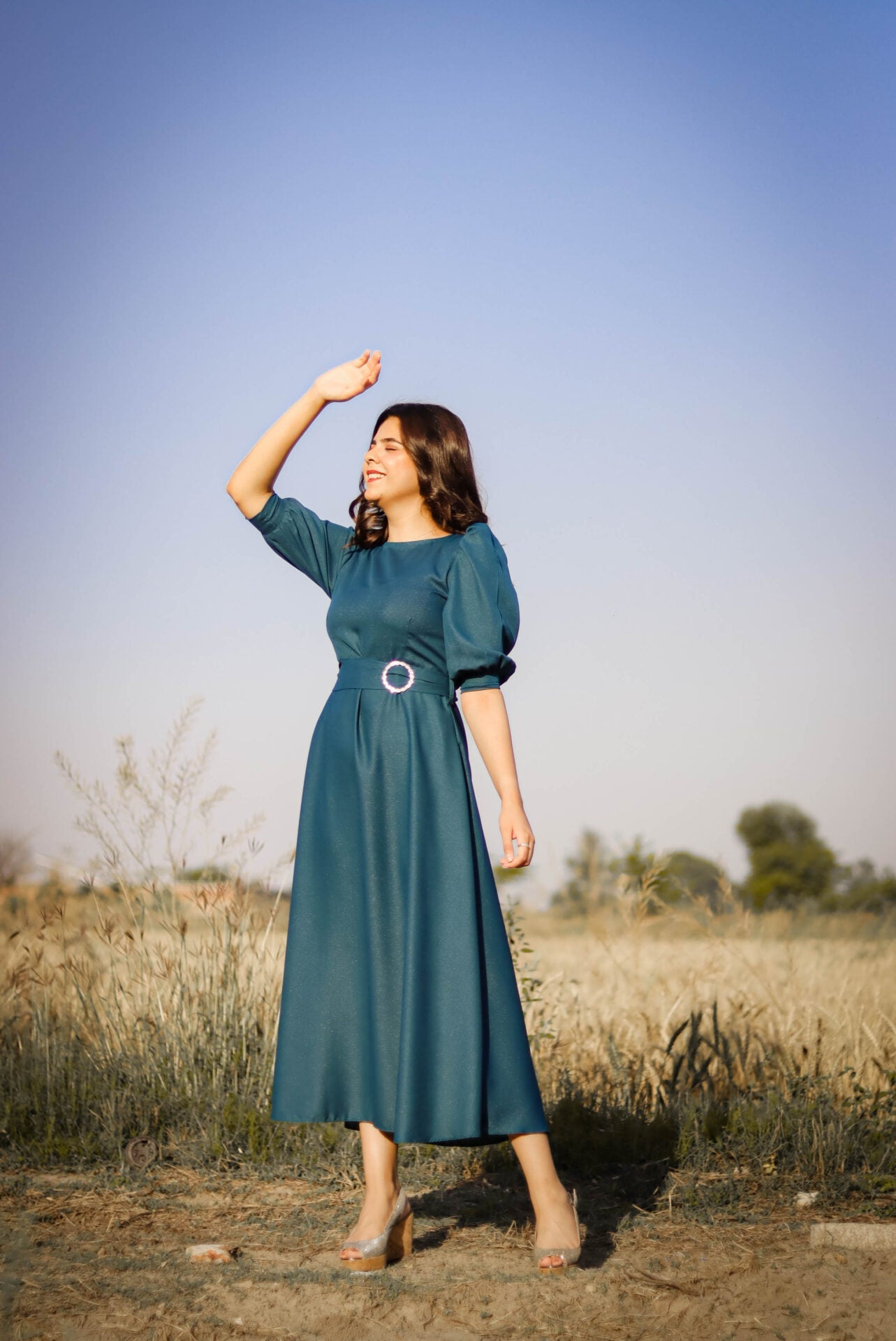 - A bright shiny zinc dress which is embellished with a boat neck, our signature puffy sleeves and a silver buckled belt.