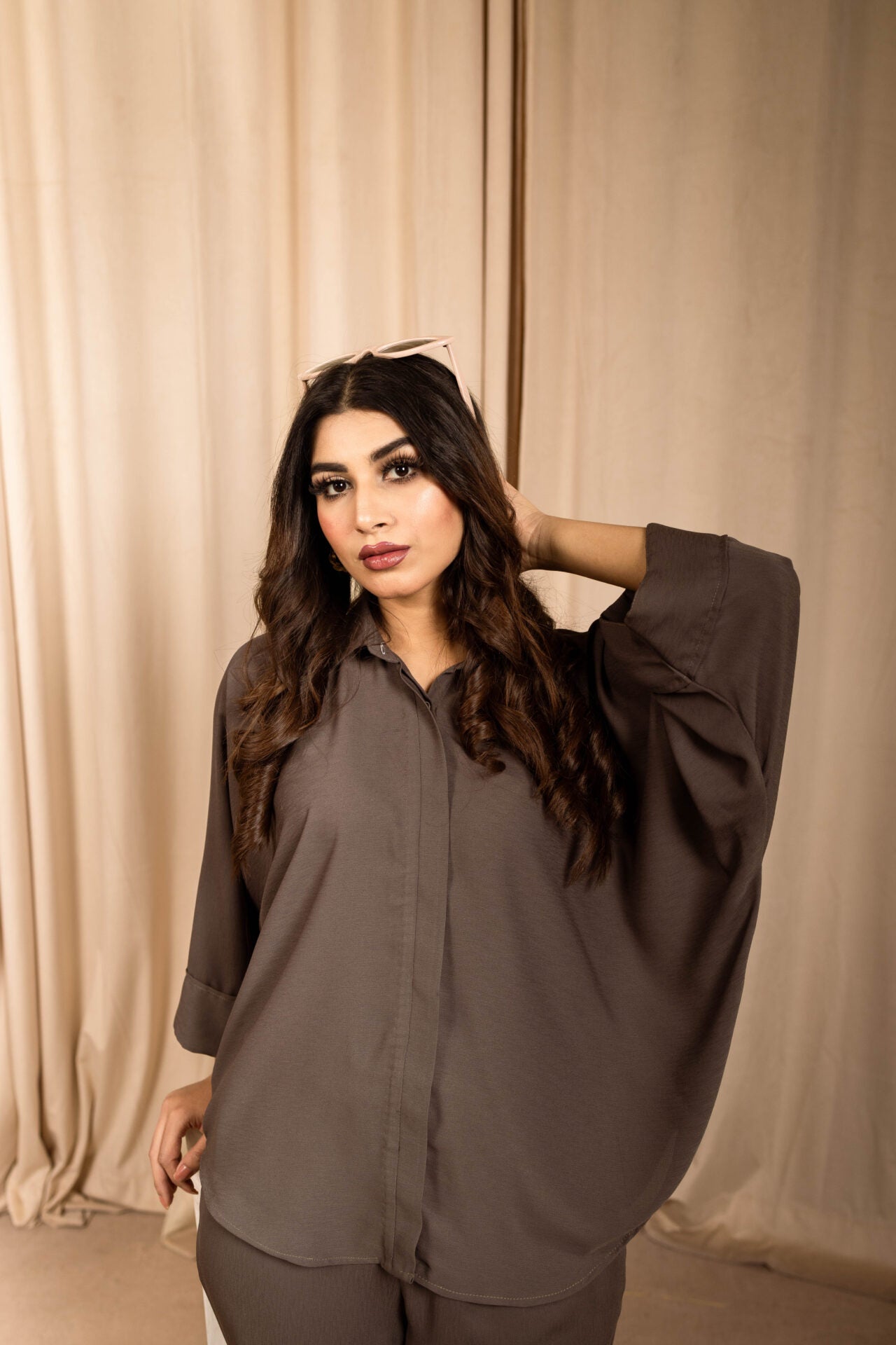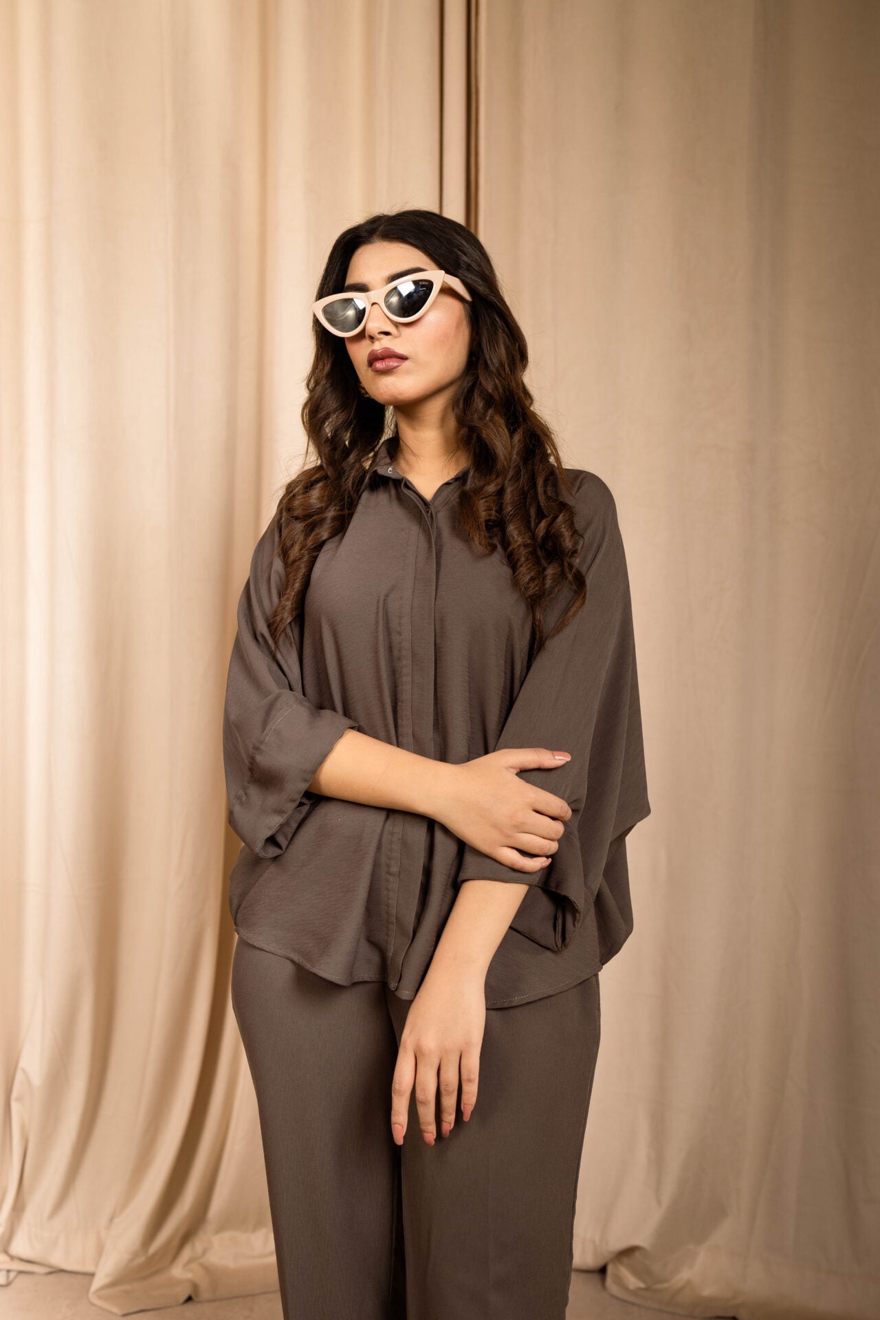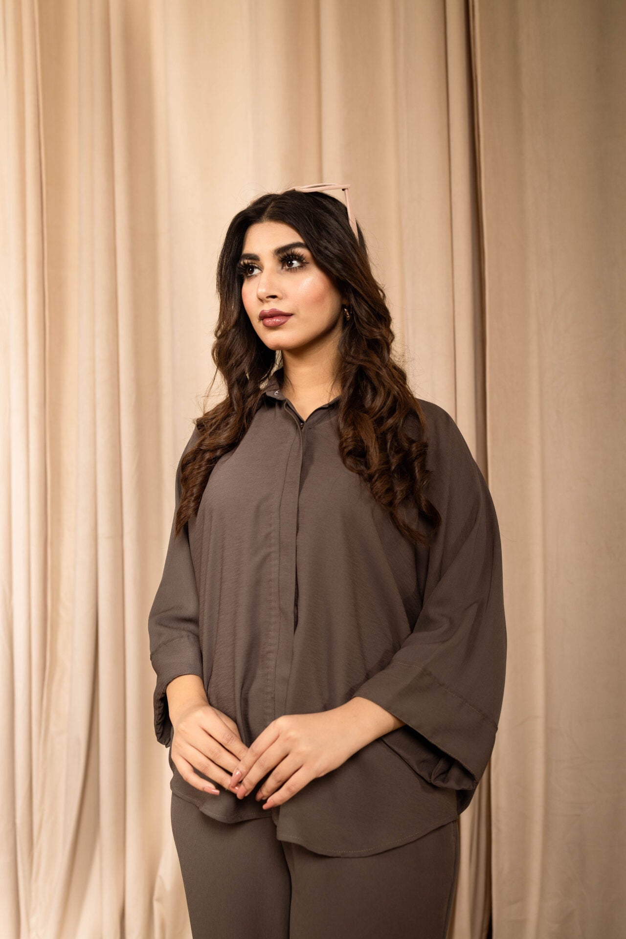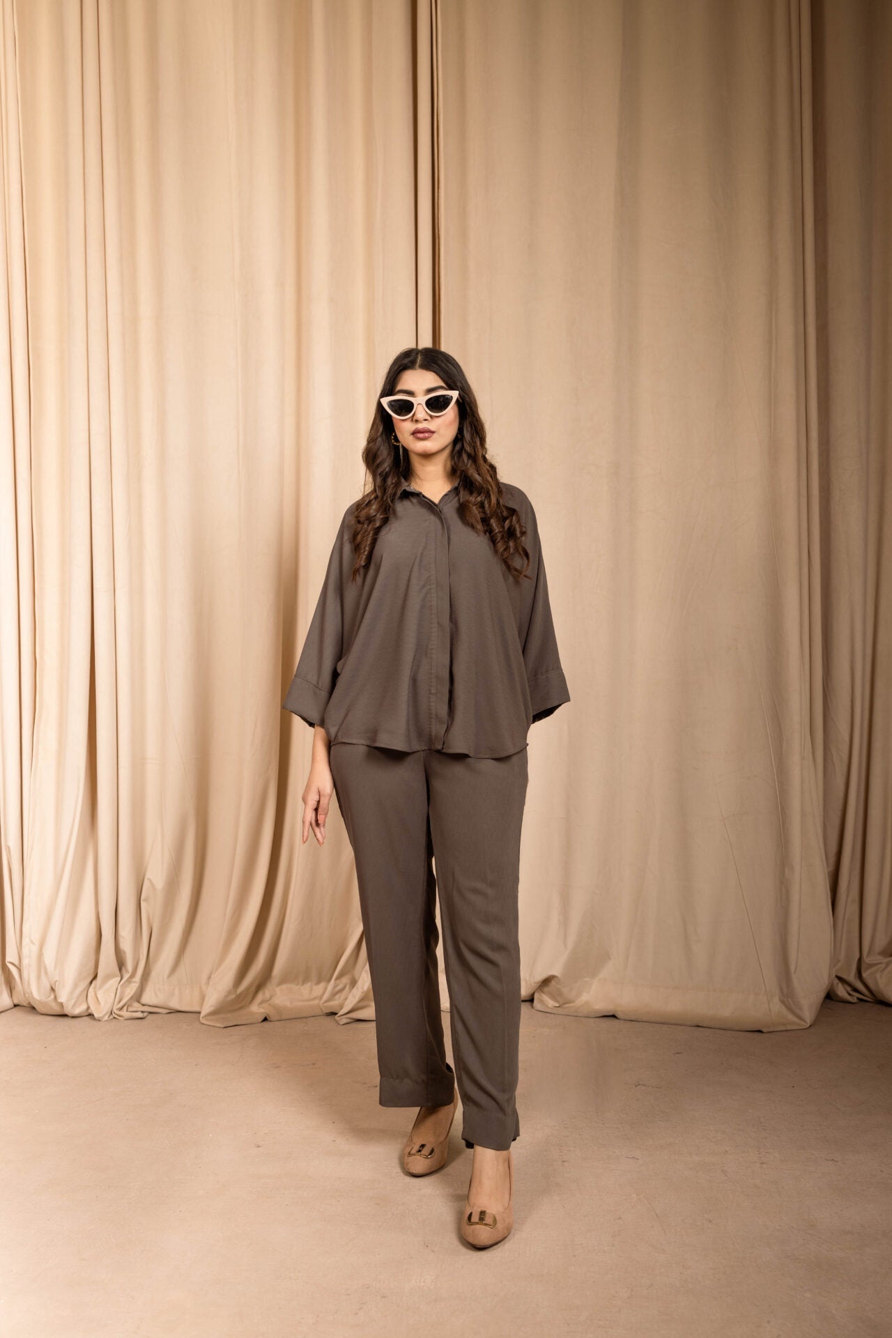 Britney - An olive green matching separates featuring a button down baggy shirt and straight trousers.