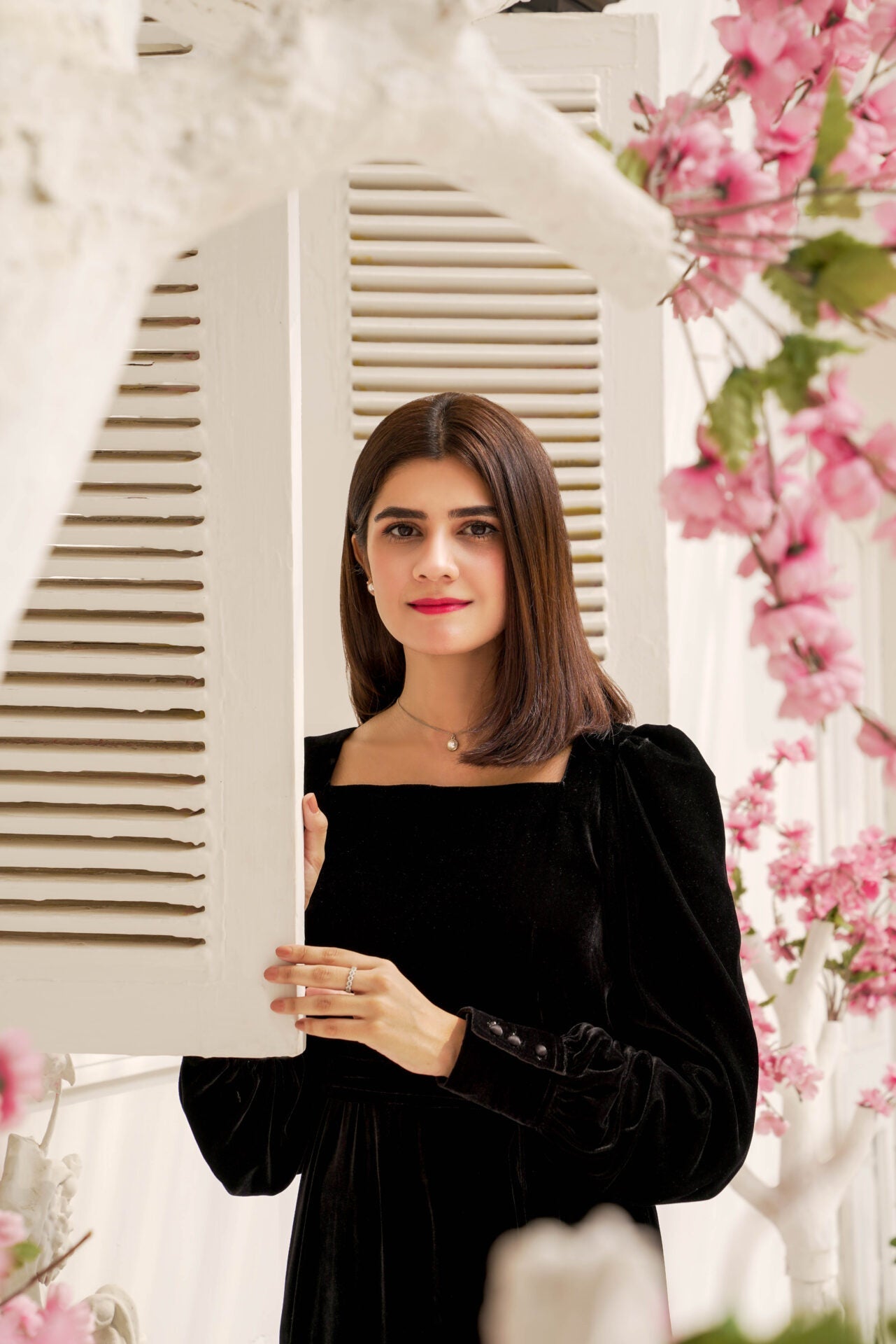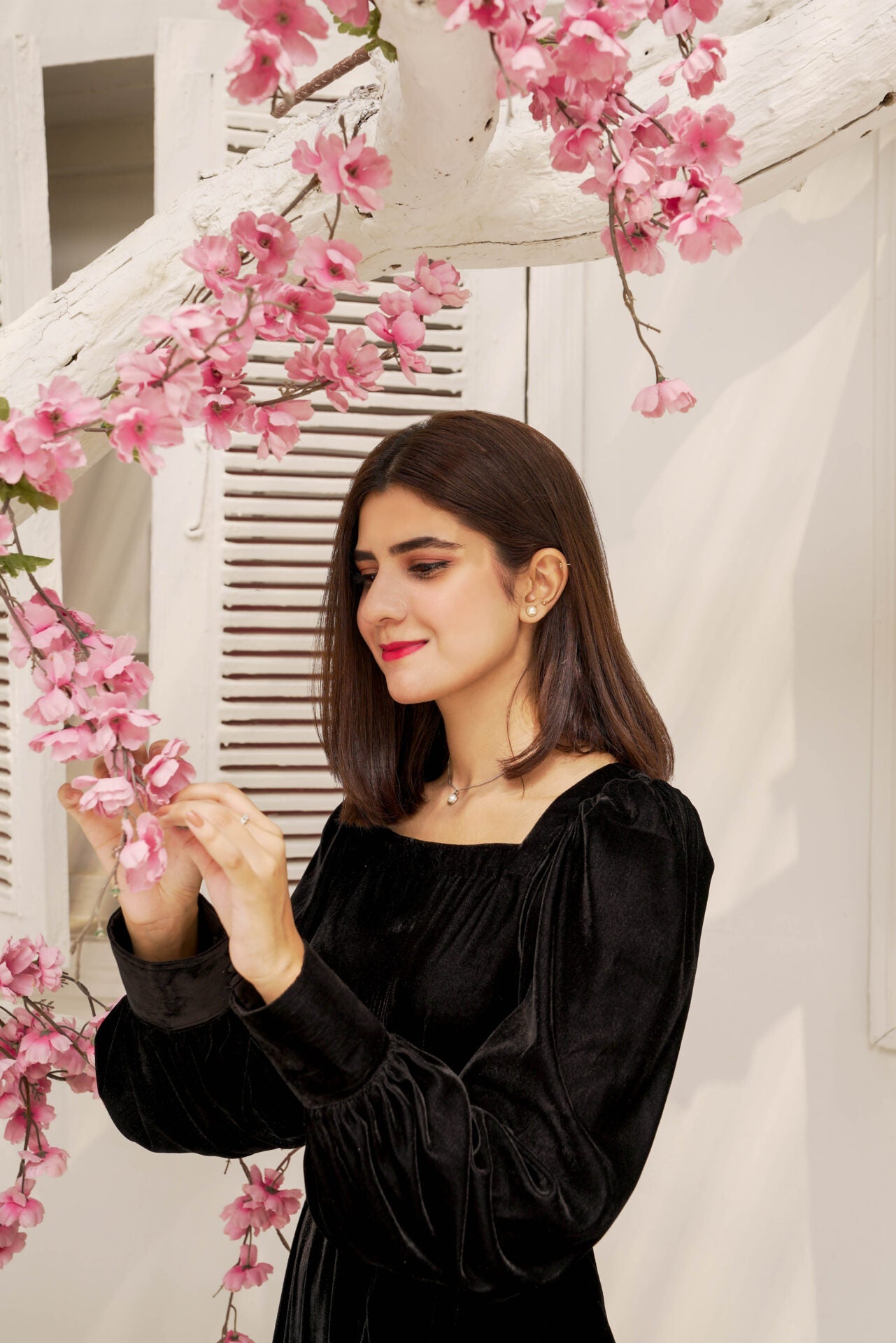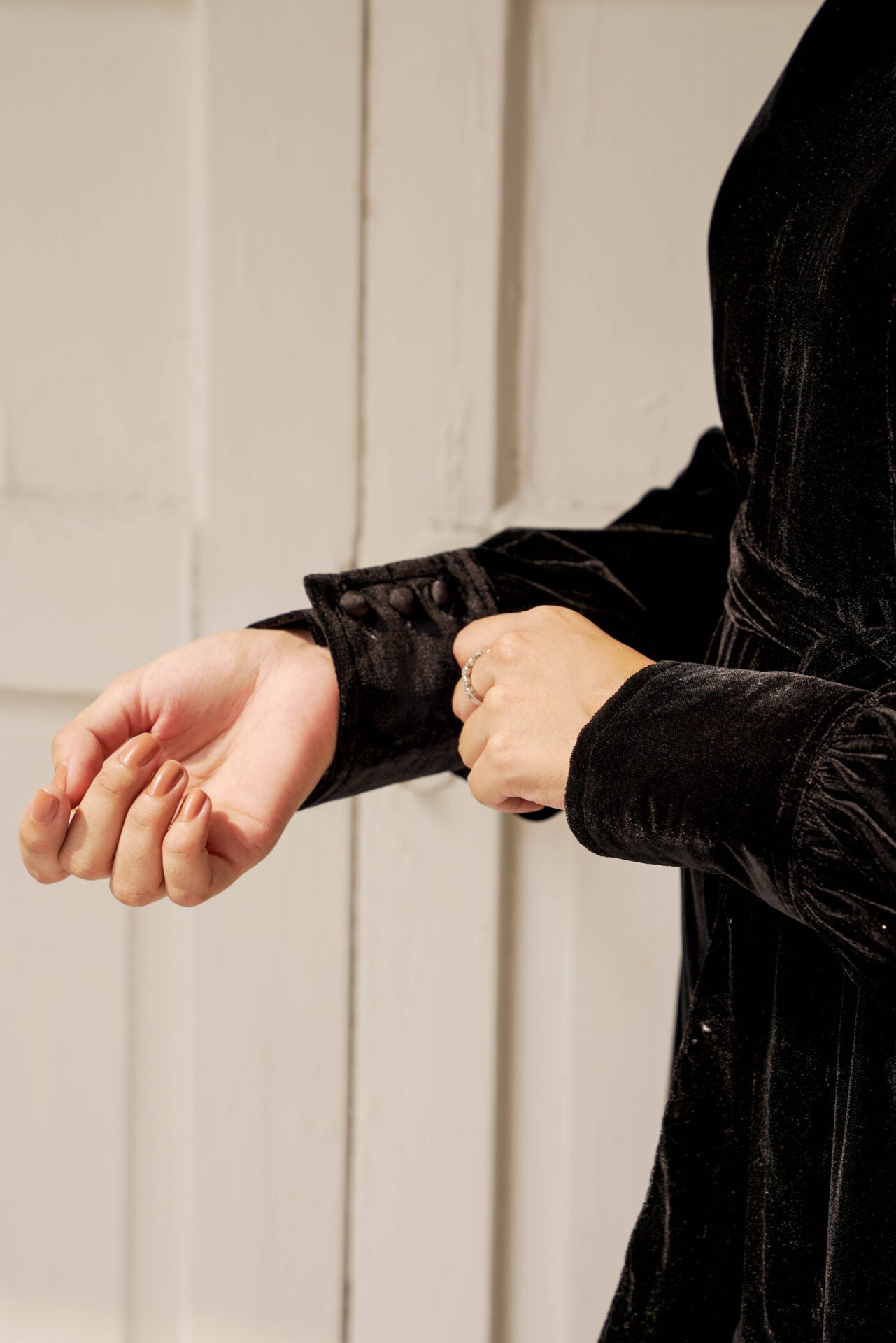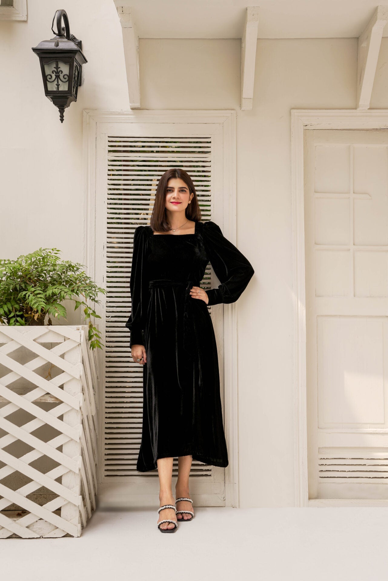 A classic black dress with dreamy velvet fabrication. With a square neckline, our signature puffy cuff sleeves and a fitted bodice, this velvet dress is perfect for all your outings this winter!Fabric: Micro-velvet (non-stretchable)
