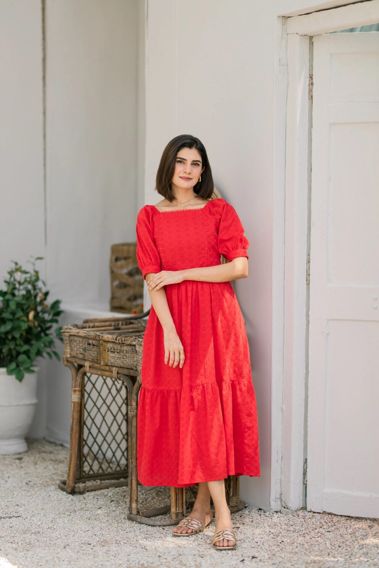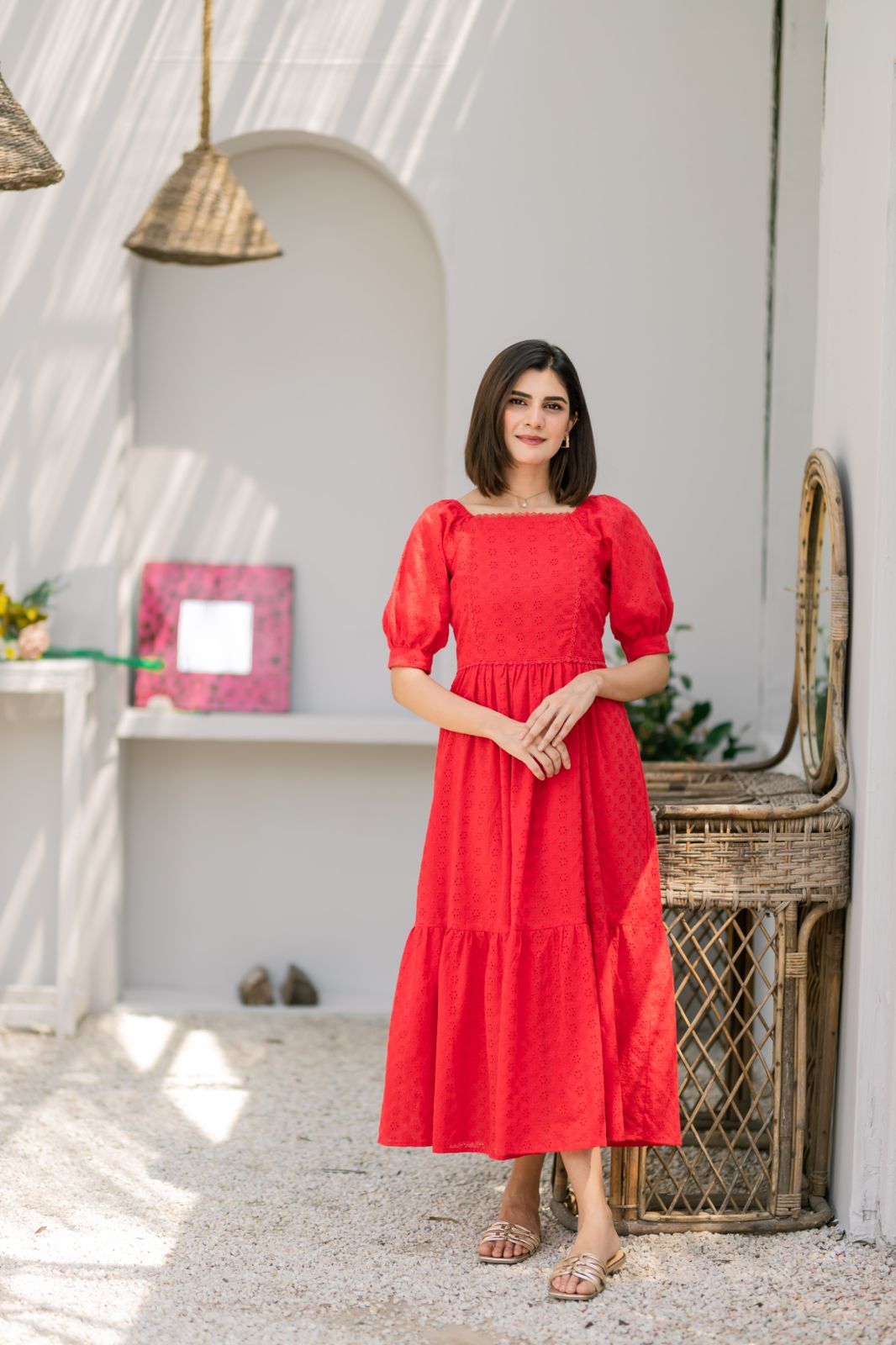 - A gorgeous carrot red dress complimented with a two-tiered skirt. The dress has lace detailing on the neckline and the body. The dress has a square neckline with puffy sleeves. It can also be worn as an off-shoulder dress.