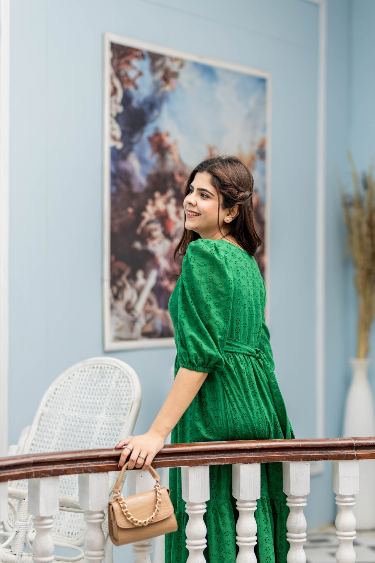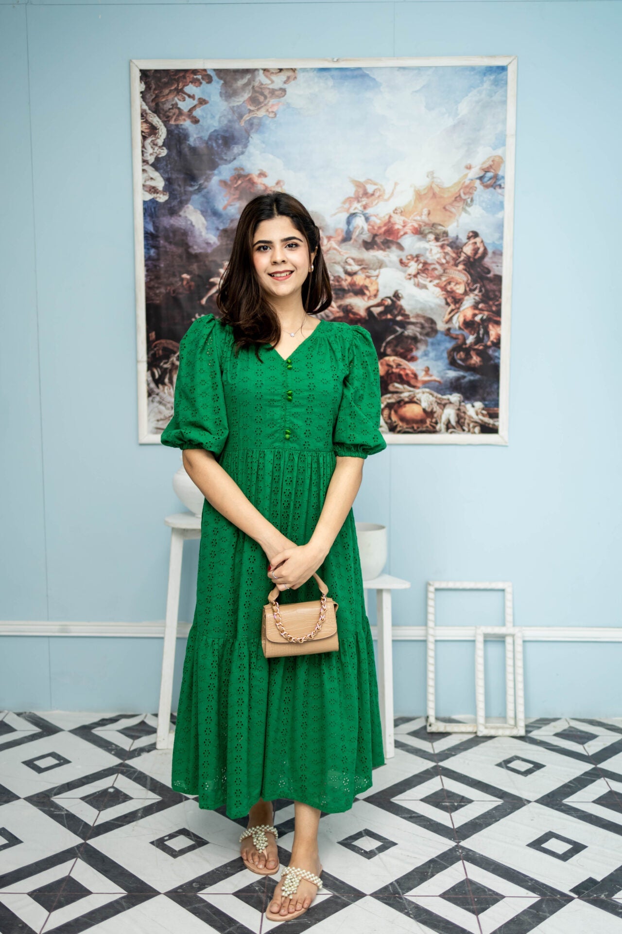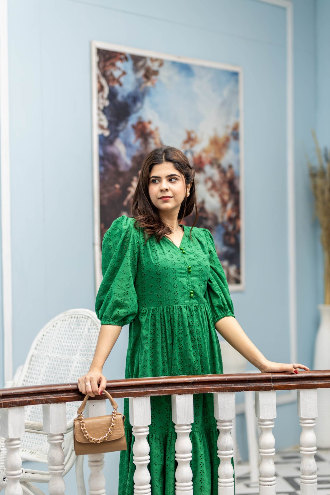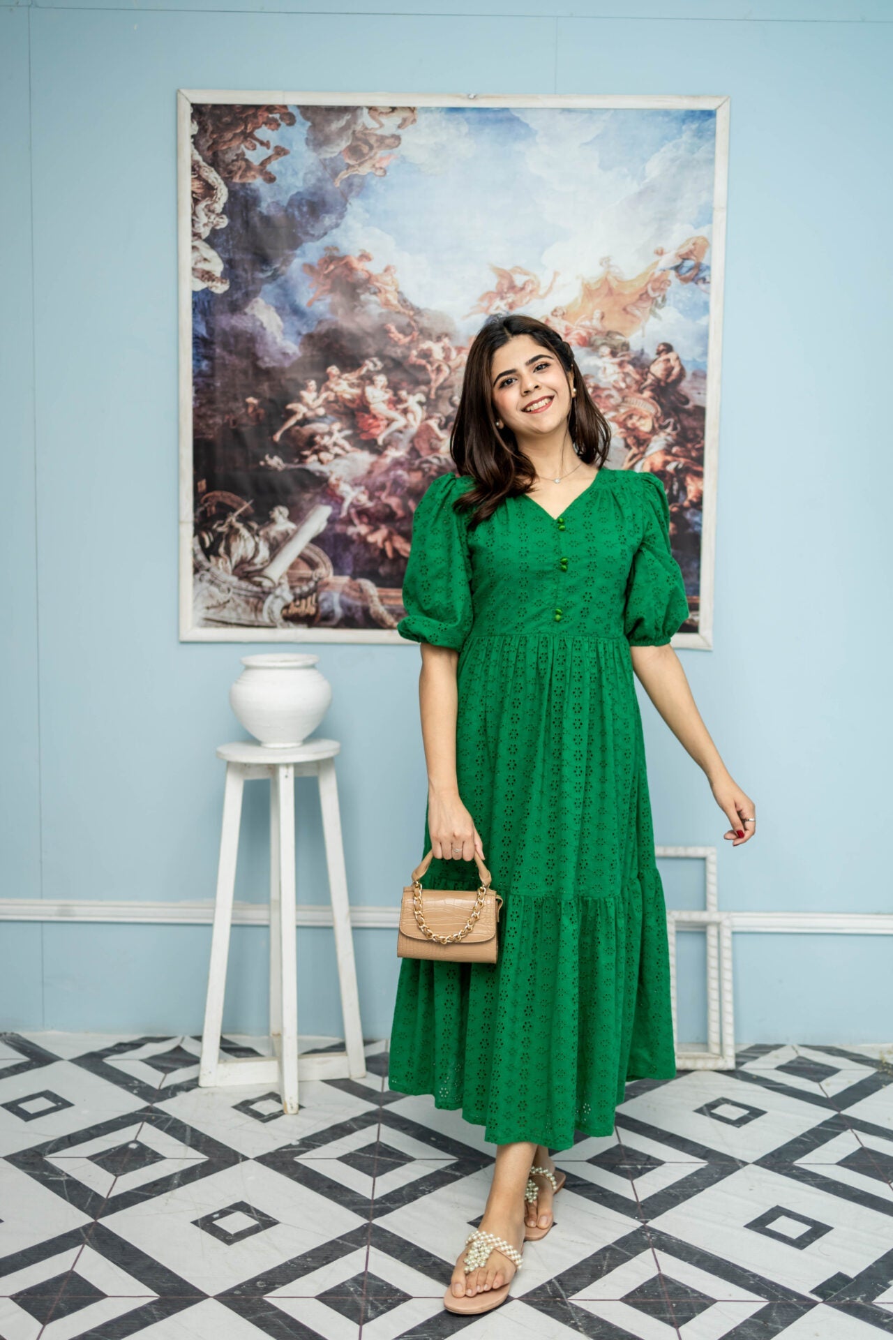 - This timeless eyelet dress is embellished with a V-cut neckline with buttons, puffy sleeves, and a bottom long frill.