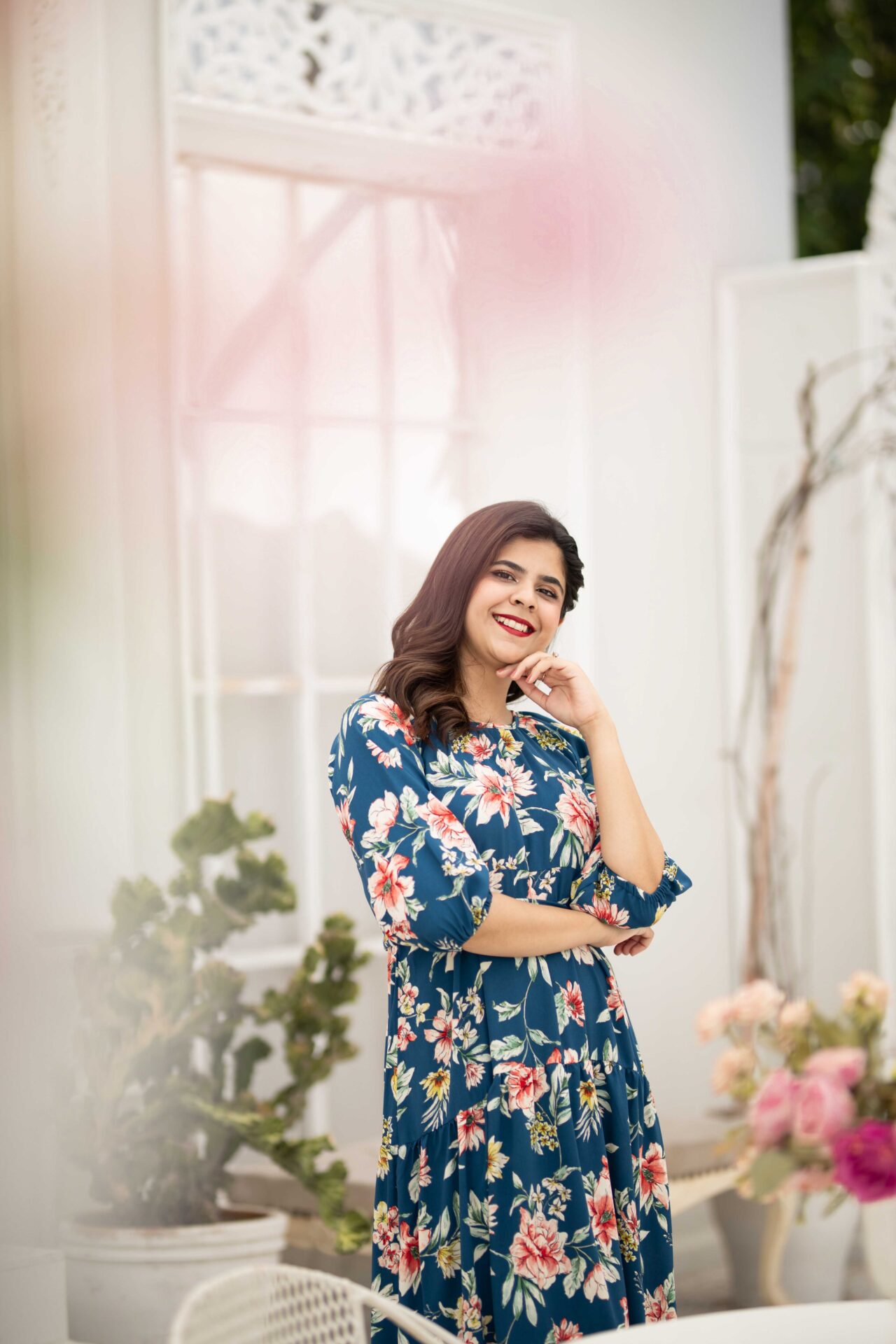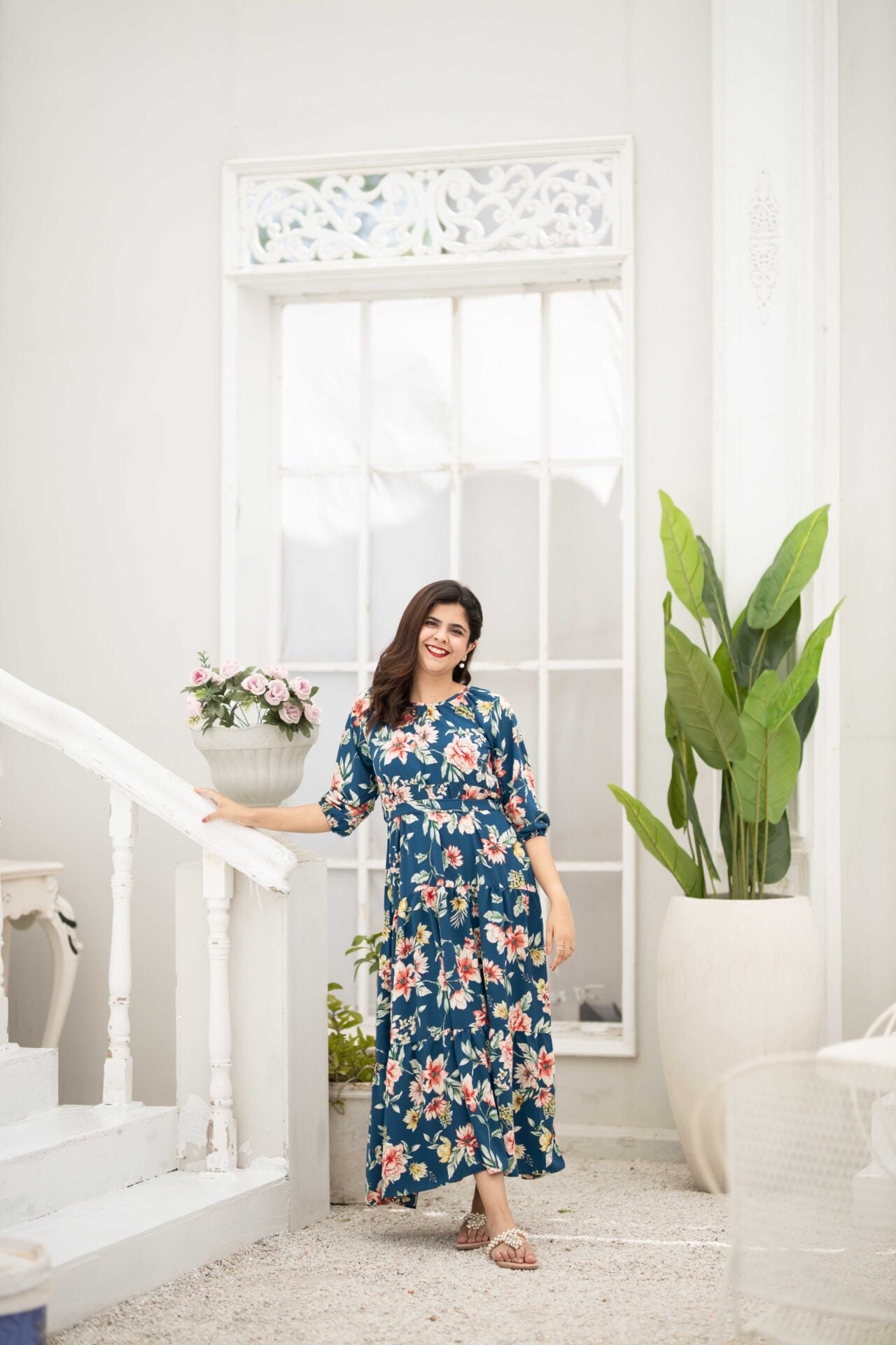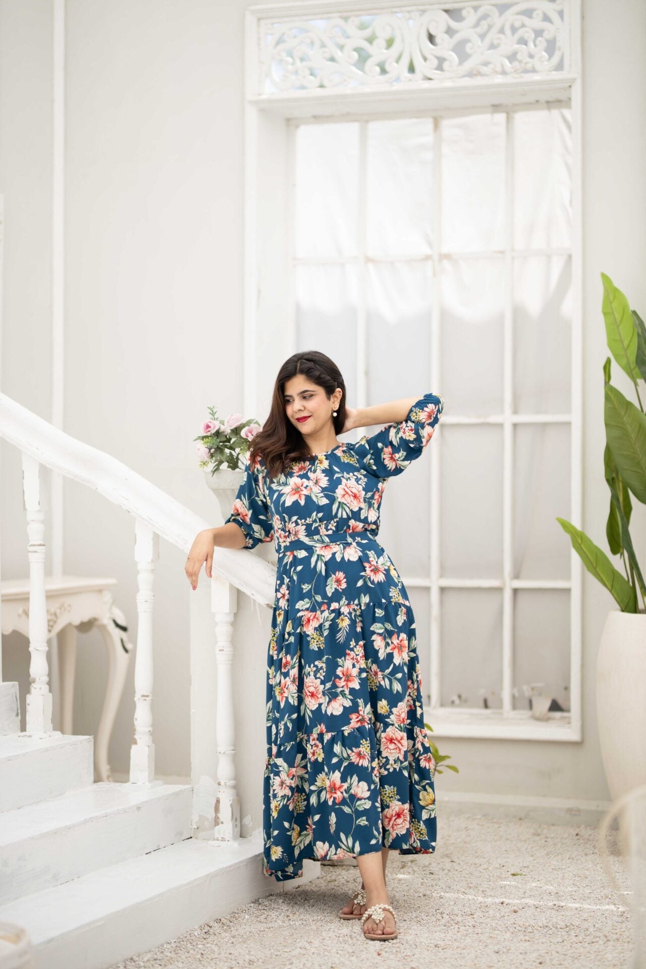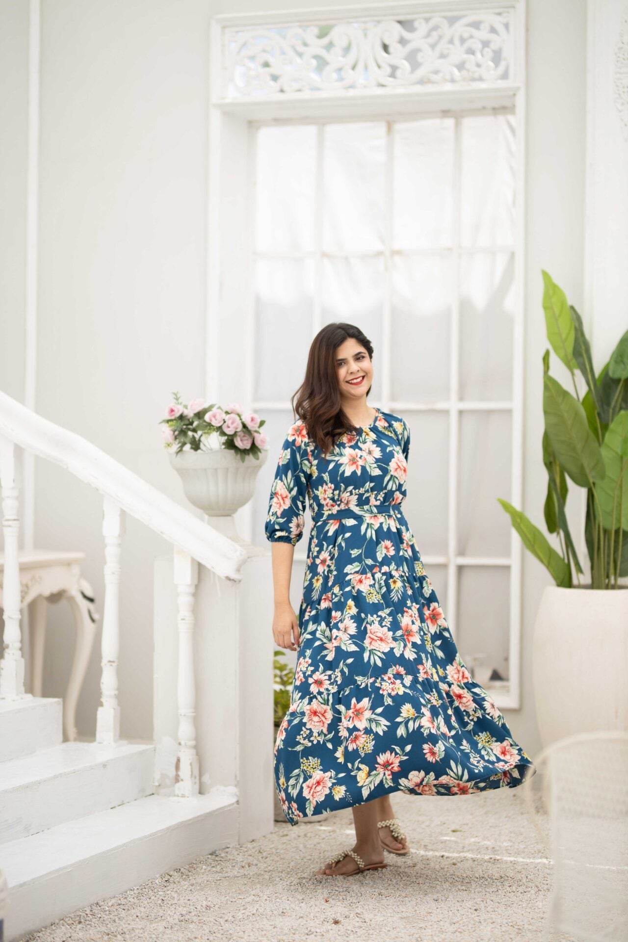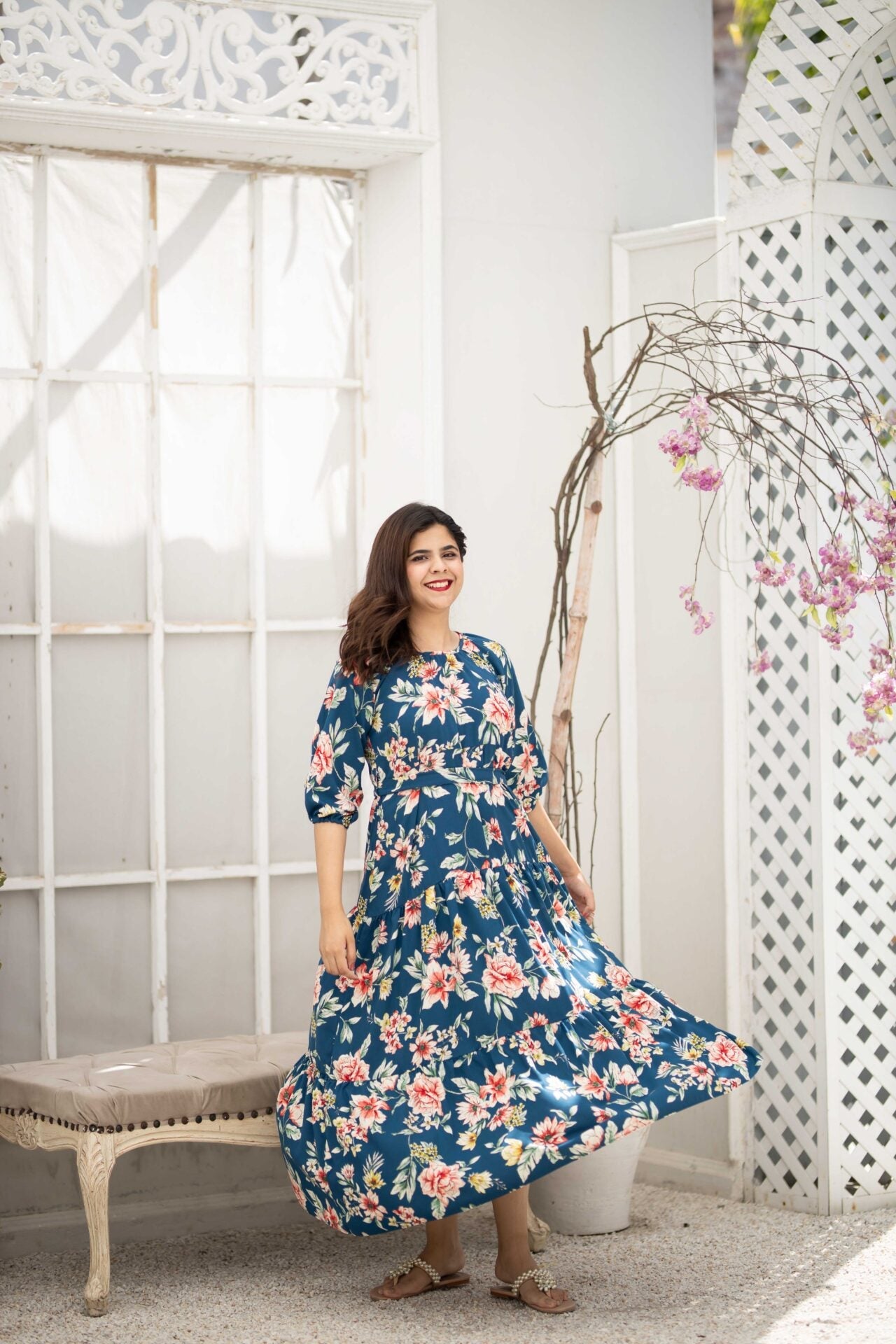 - An elegant blue floral dress featuring a round neckline, elastic sleeves and a two-tiered dress that further adds to the flare of the dress.