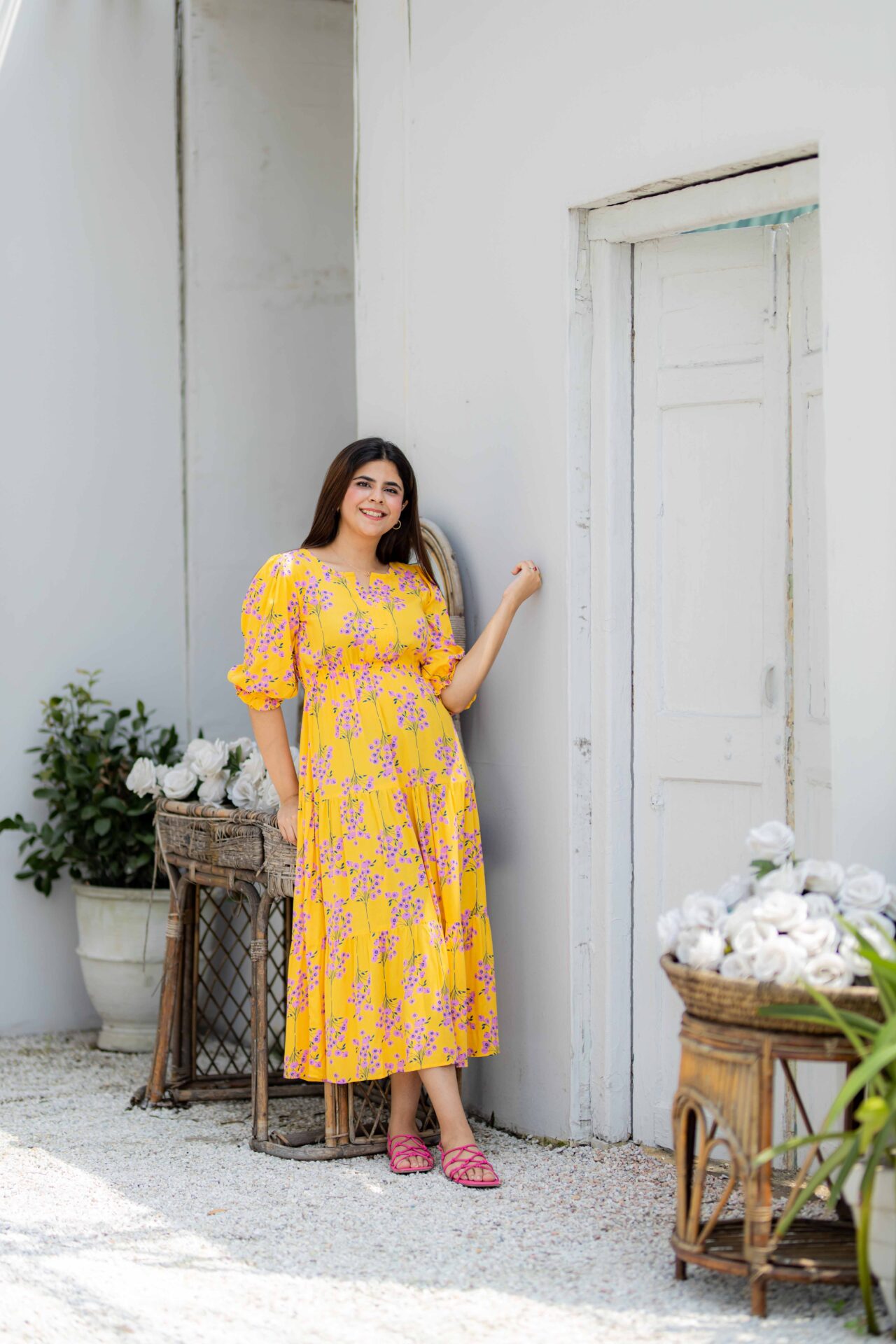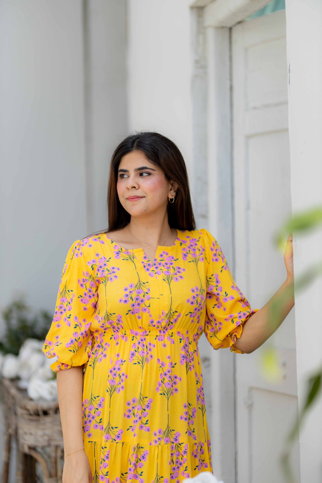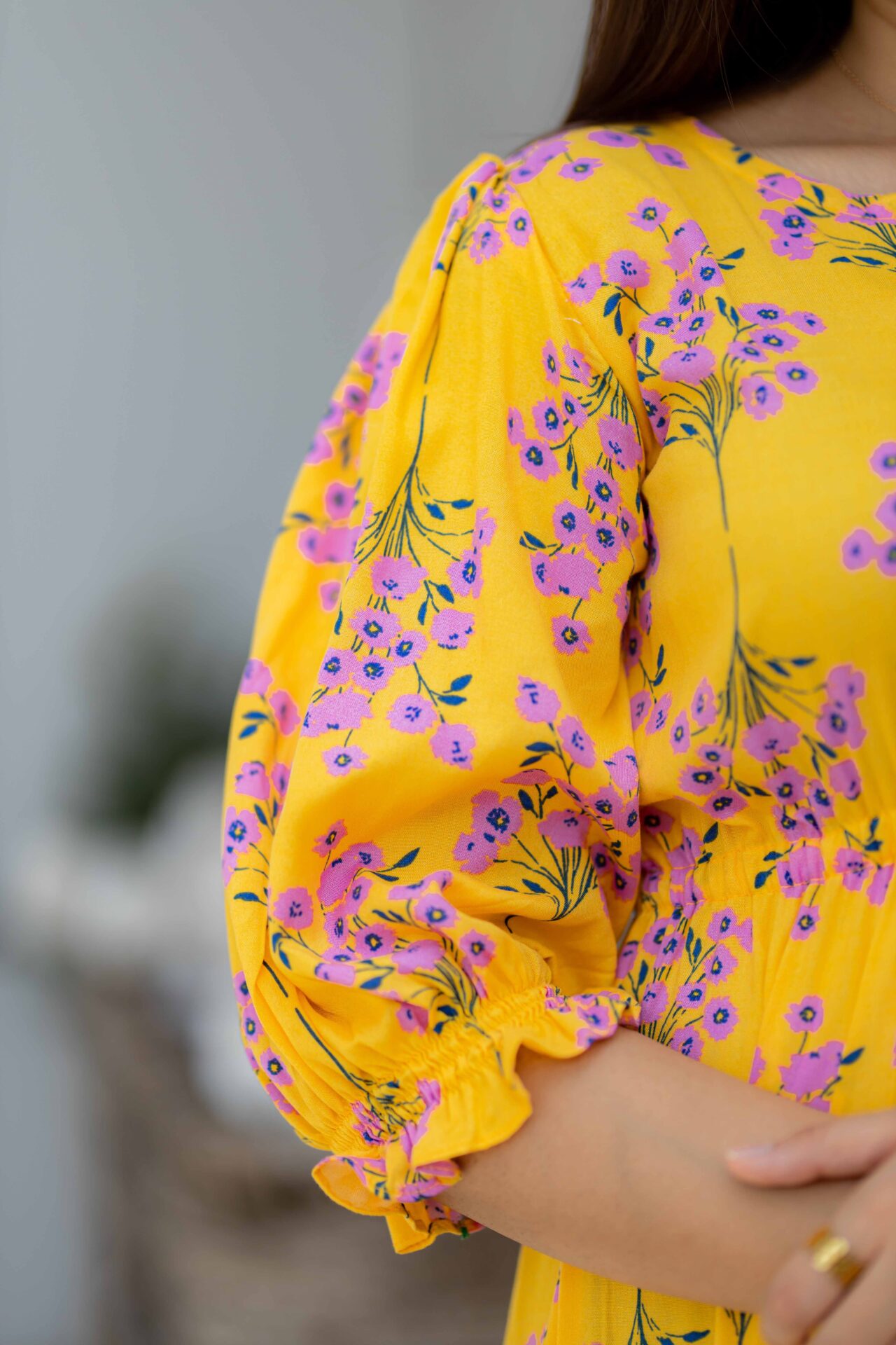 A bright yellow sunshiny dress featuring a vibrant pink floral print! The dress has a three tier skirt and our signature puffy elastic sleeves.