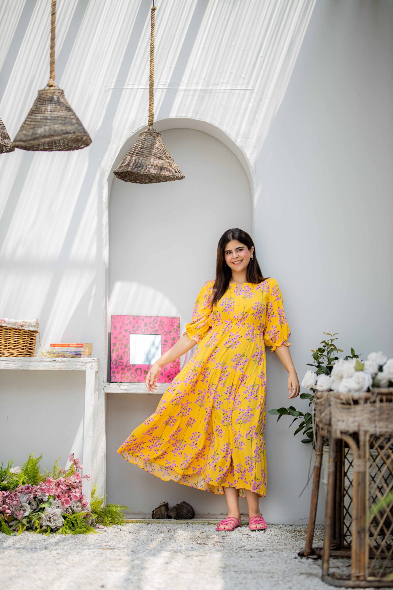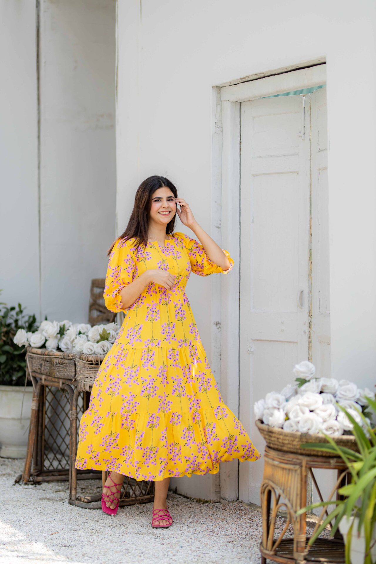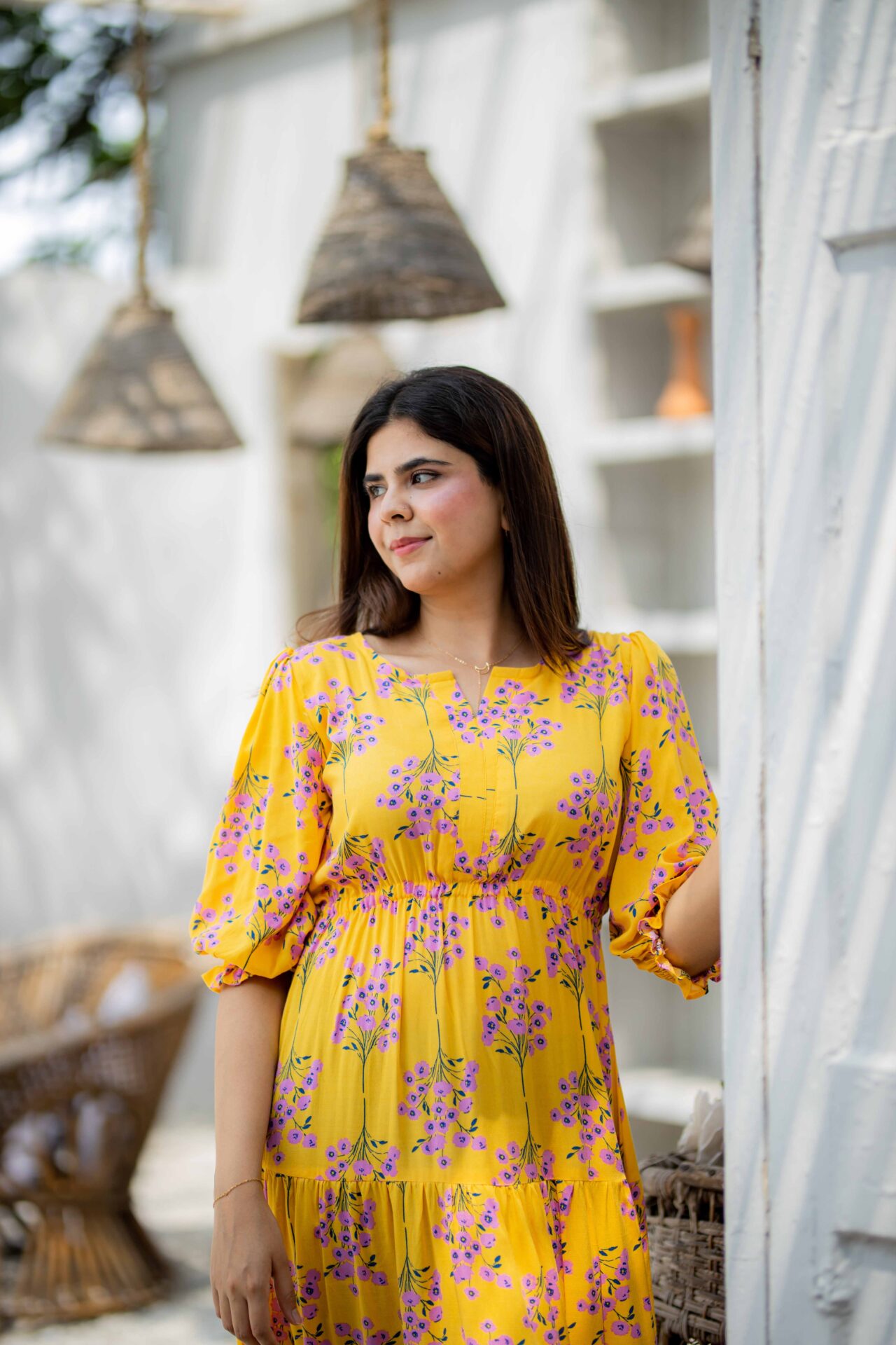 A bright yellow sunshiny dress featuring a vibrant pink floral print! The dress has a three tier skirt and our signature puffy elastic sleeves.