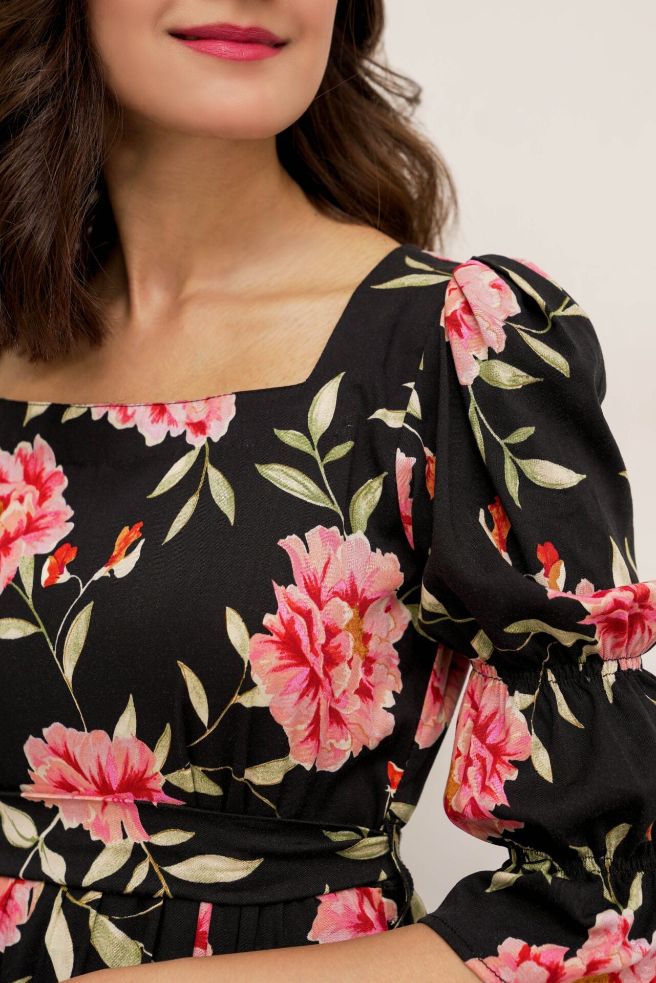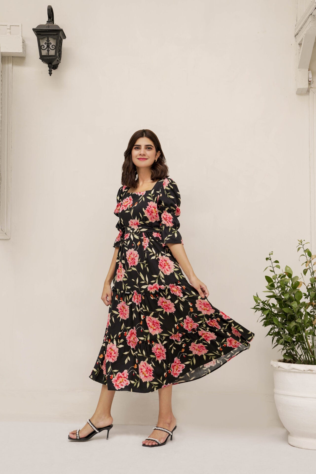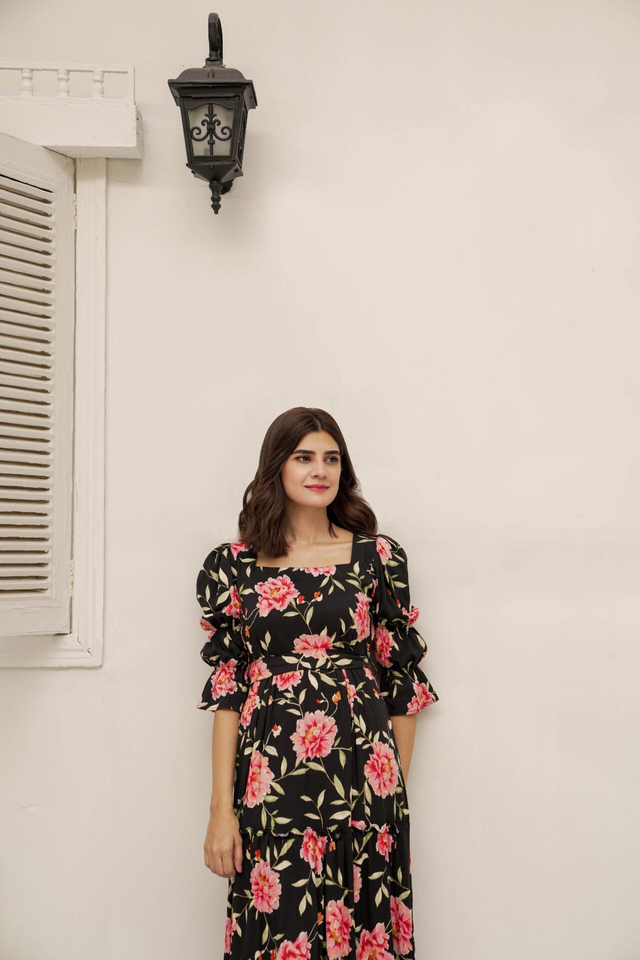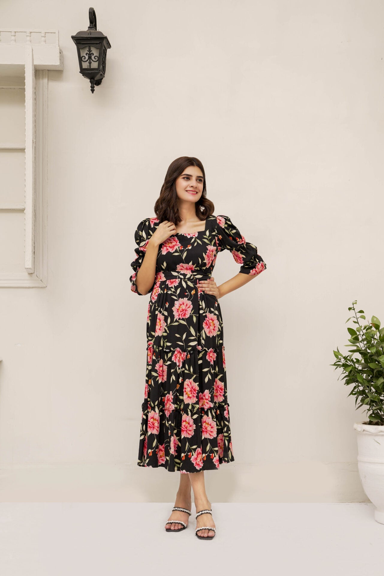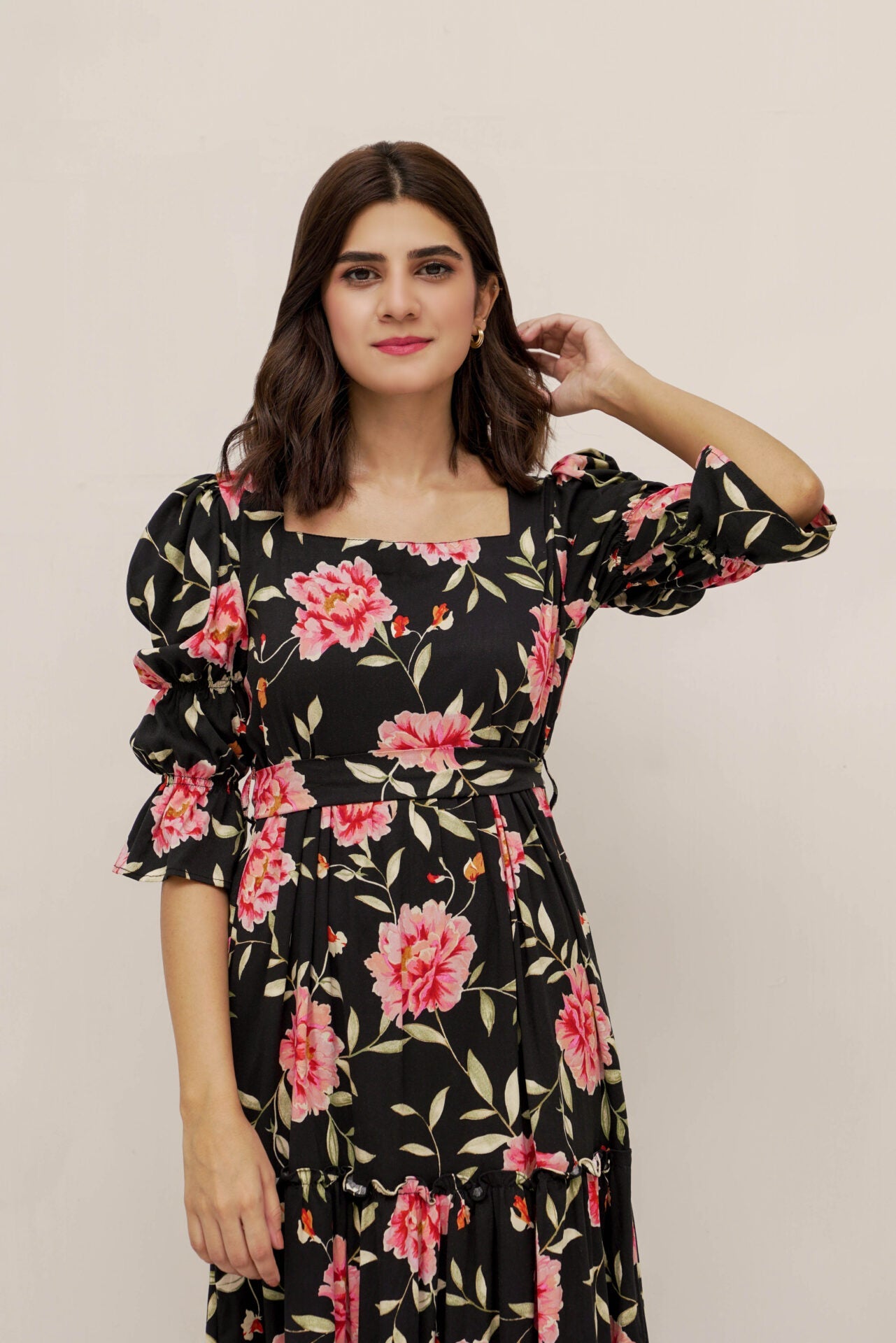 Everyone's all-time winters favorite color black featured in a gorgeous floral print. The dress is adorned with a clean-cut square neckline, darling ruffles on the two tiers of frill and our signature puffy sleeves with smocked lines.