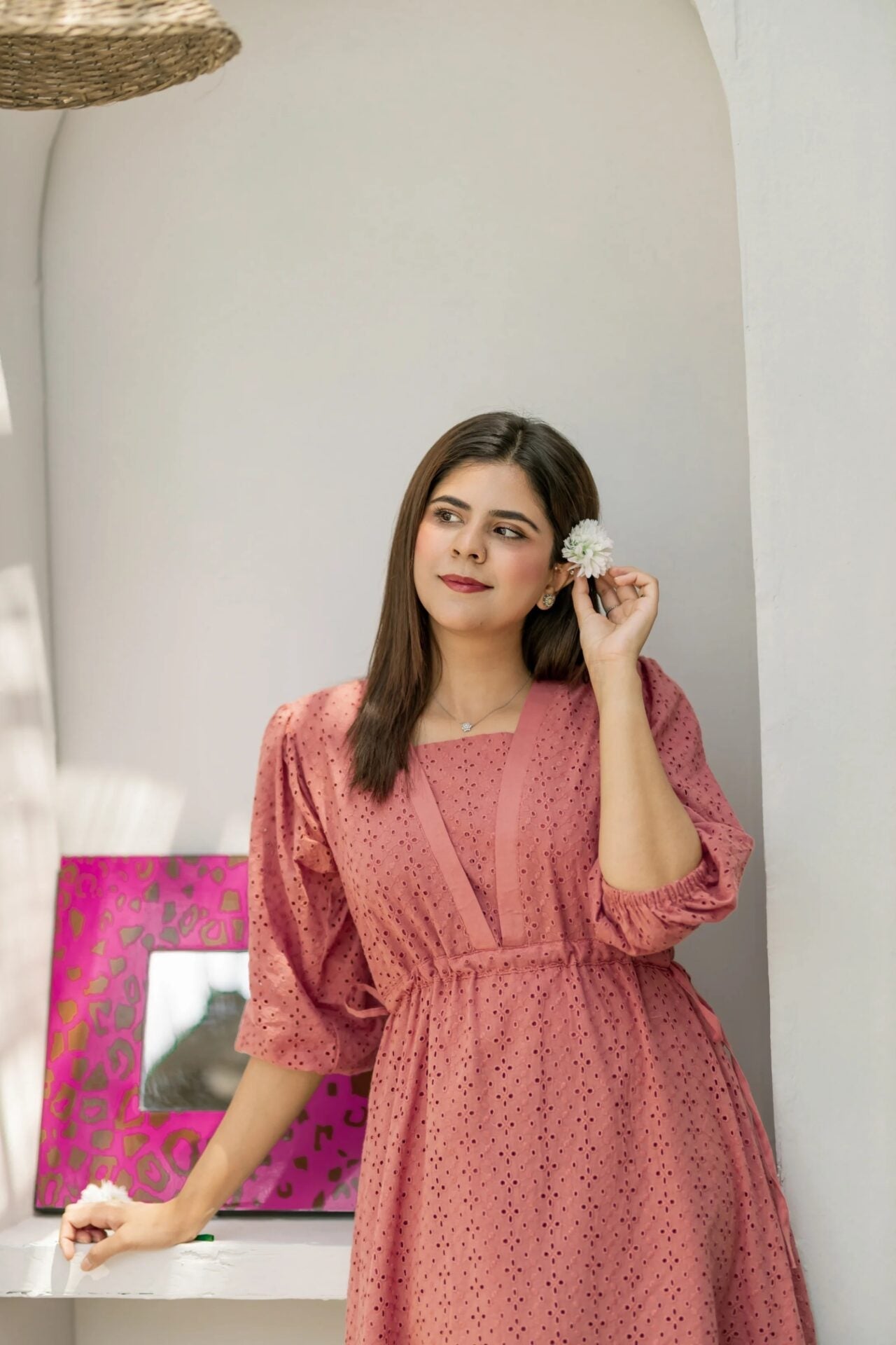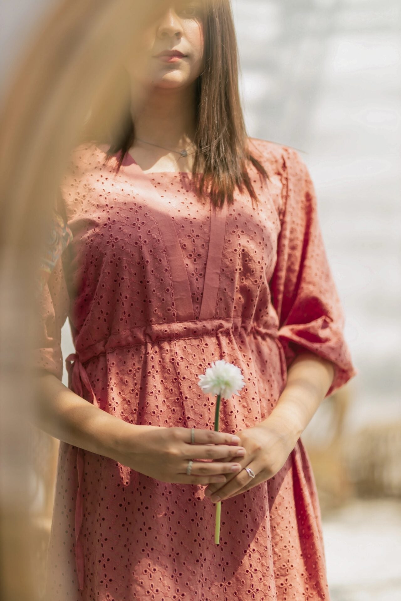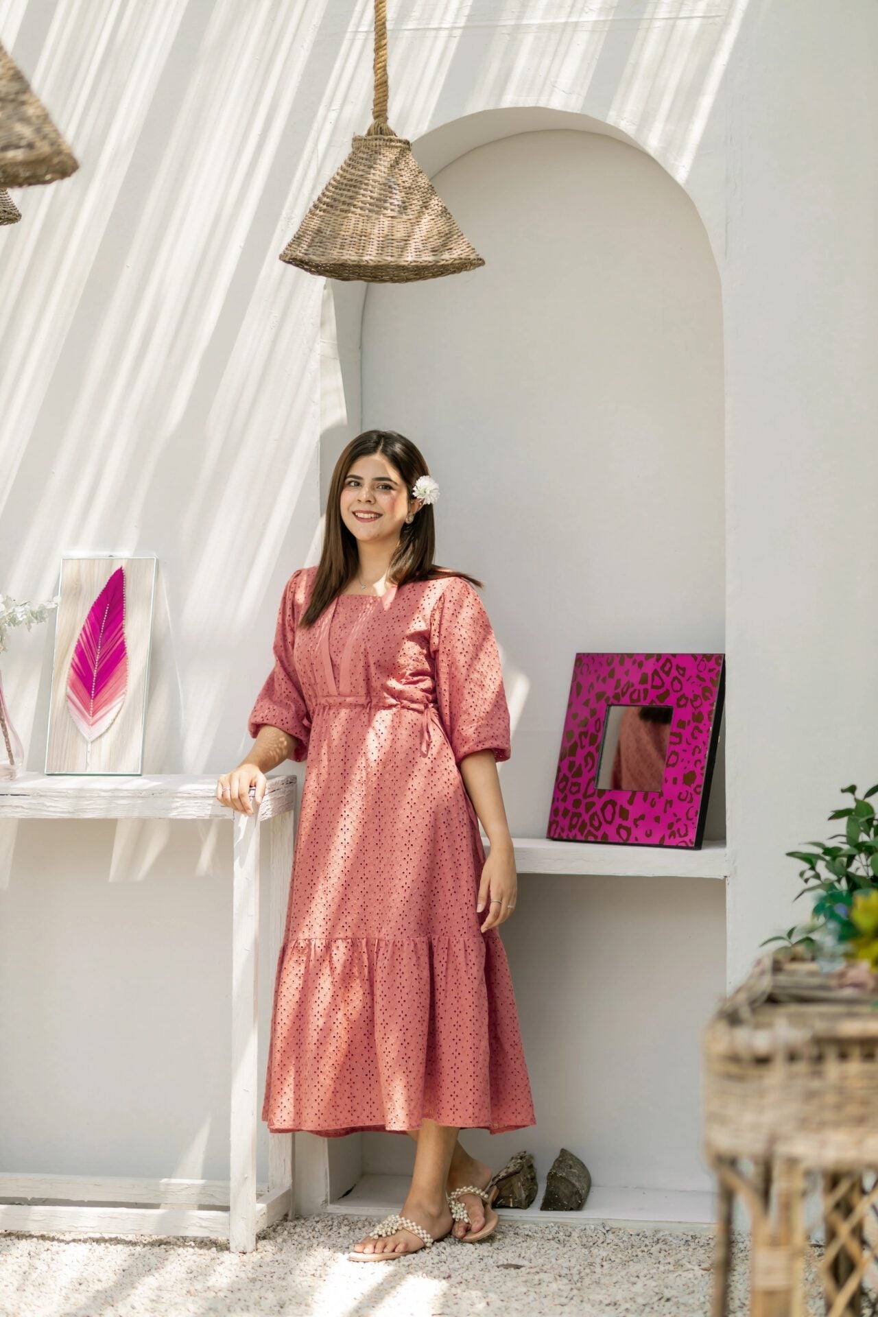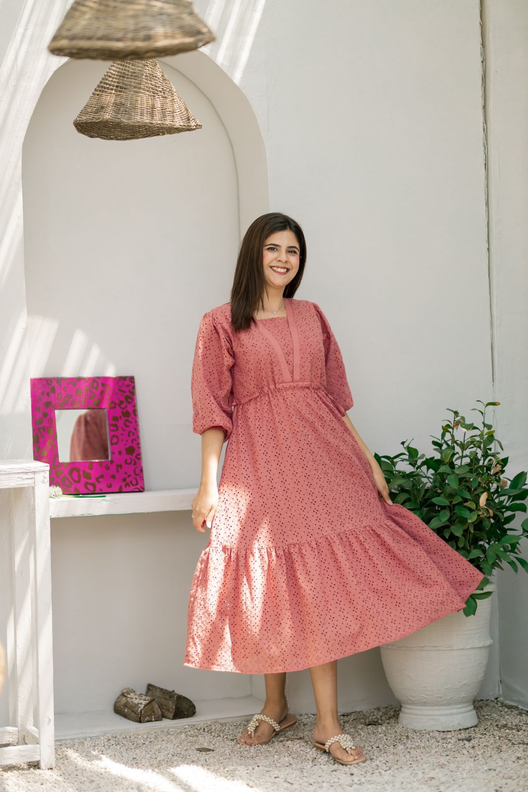 - A flowy peach/pink eyelet dress featuring a long bottom frill, puffy elastic sleeves, fixable drawstrings in the waist and a V-cut neckline.
