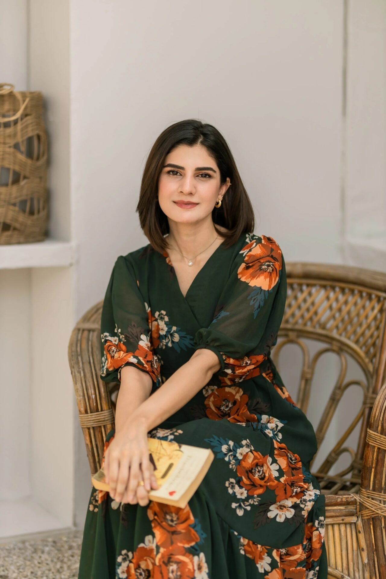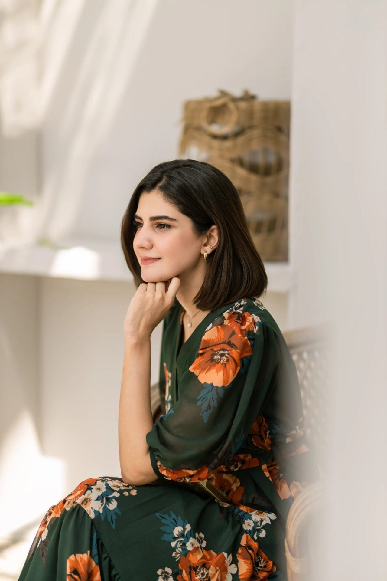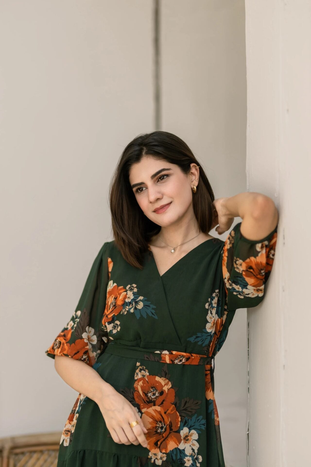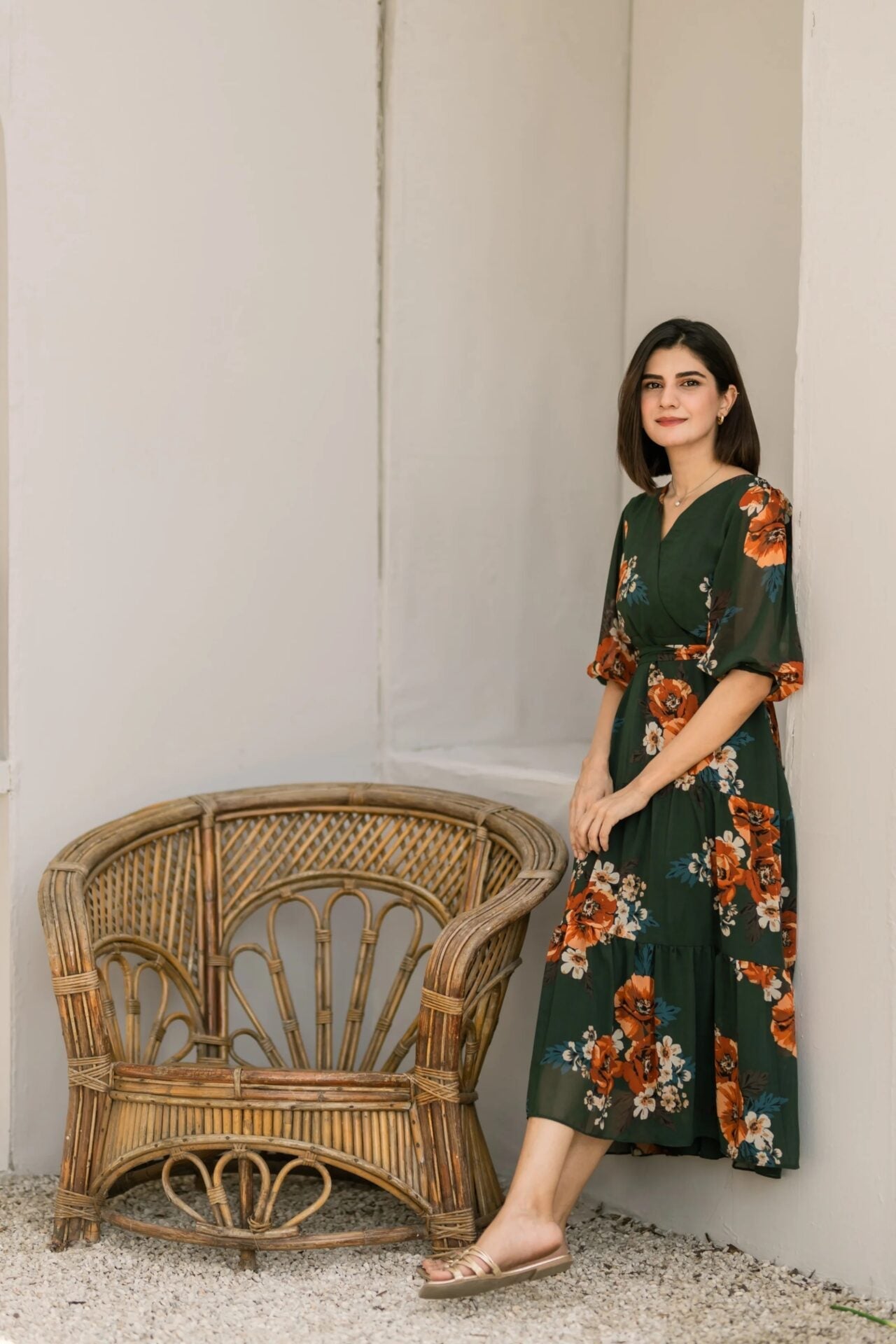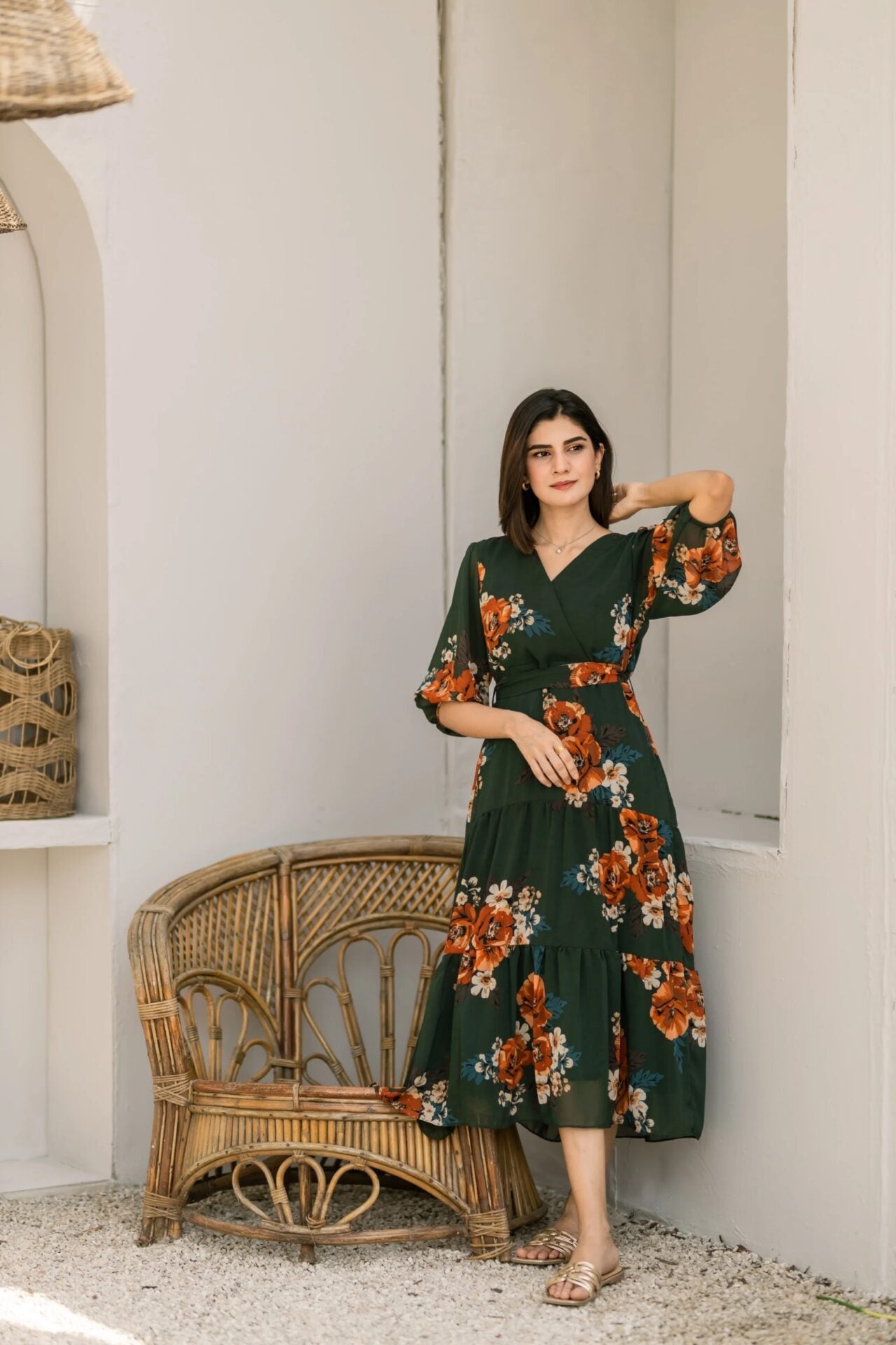 - An elegant bottle green floral dress featuring an overlapping neckline, puffy sleeves and a two-tiered dress that further adds to the flare of the dress.