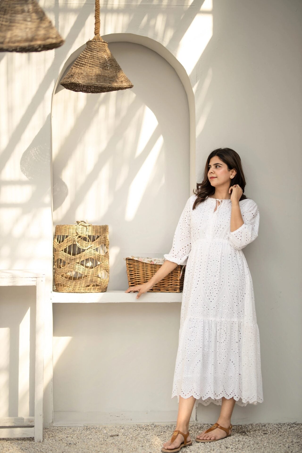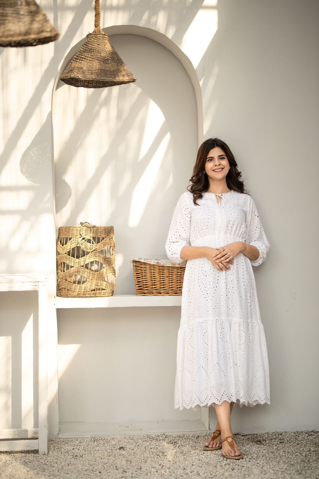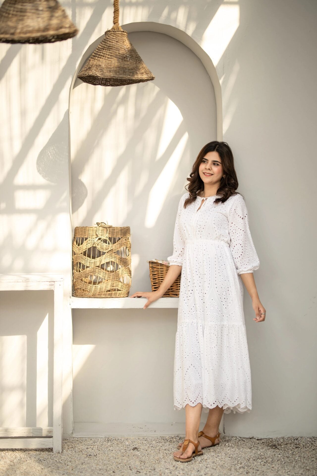 - A gorgeous white eyelet dress featuring our all-time favorite long bottom frill with scallops. There’s elastic in the waistline and a V-cut neckline with a tie.