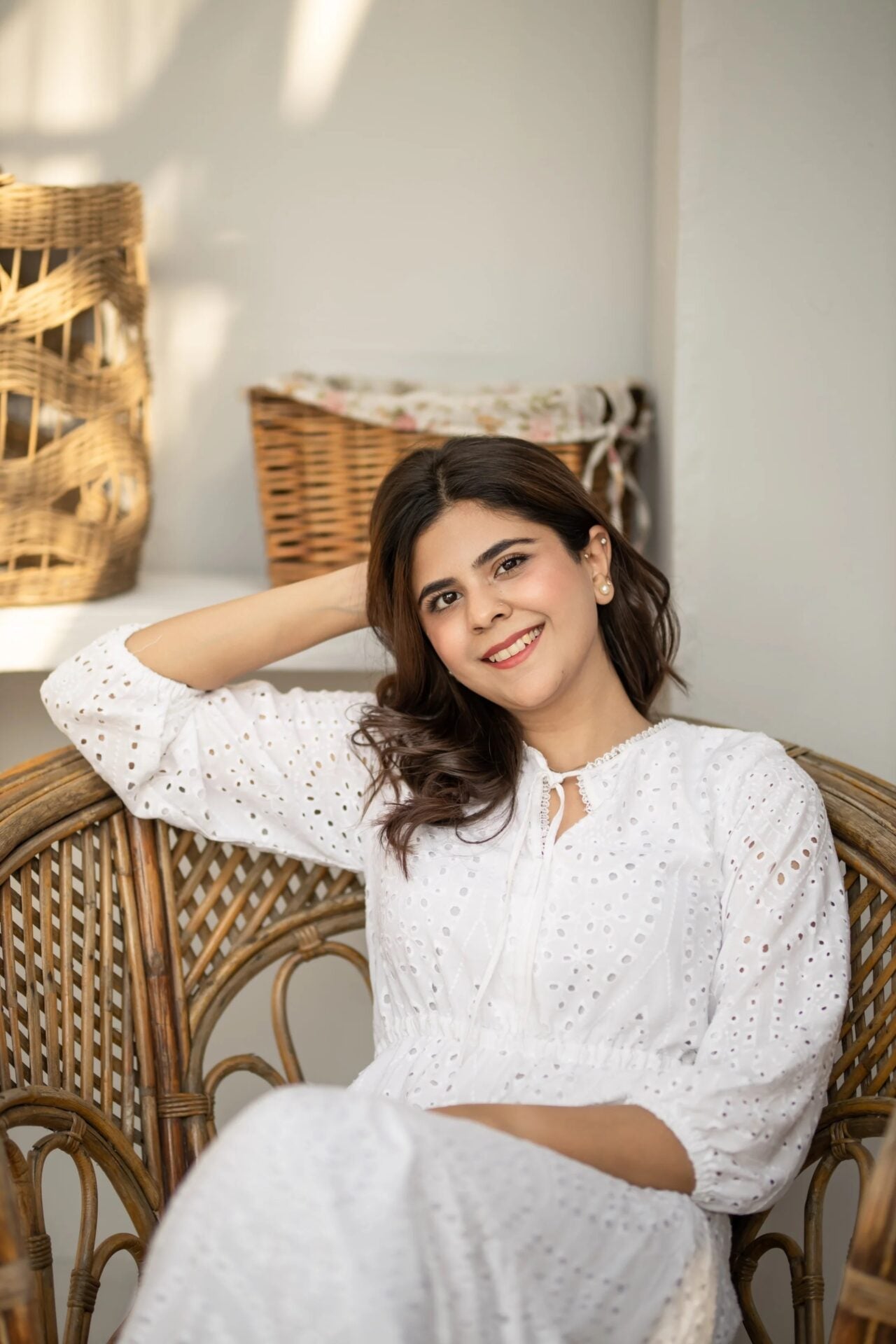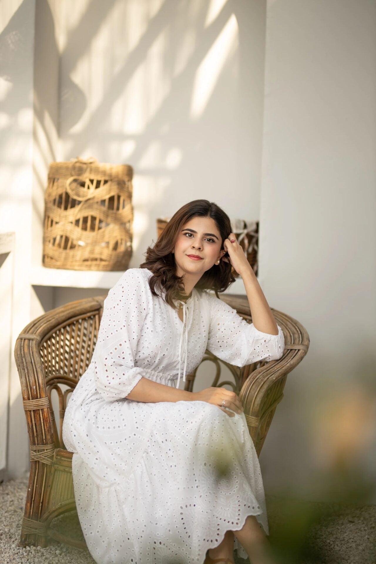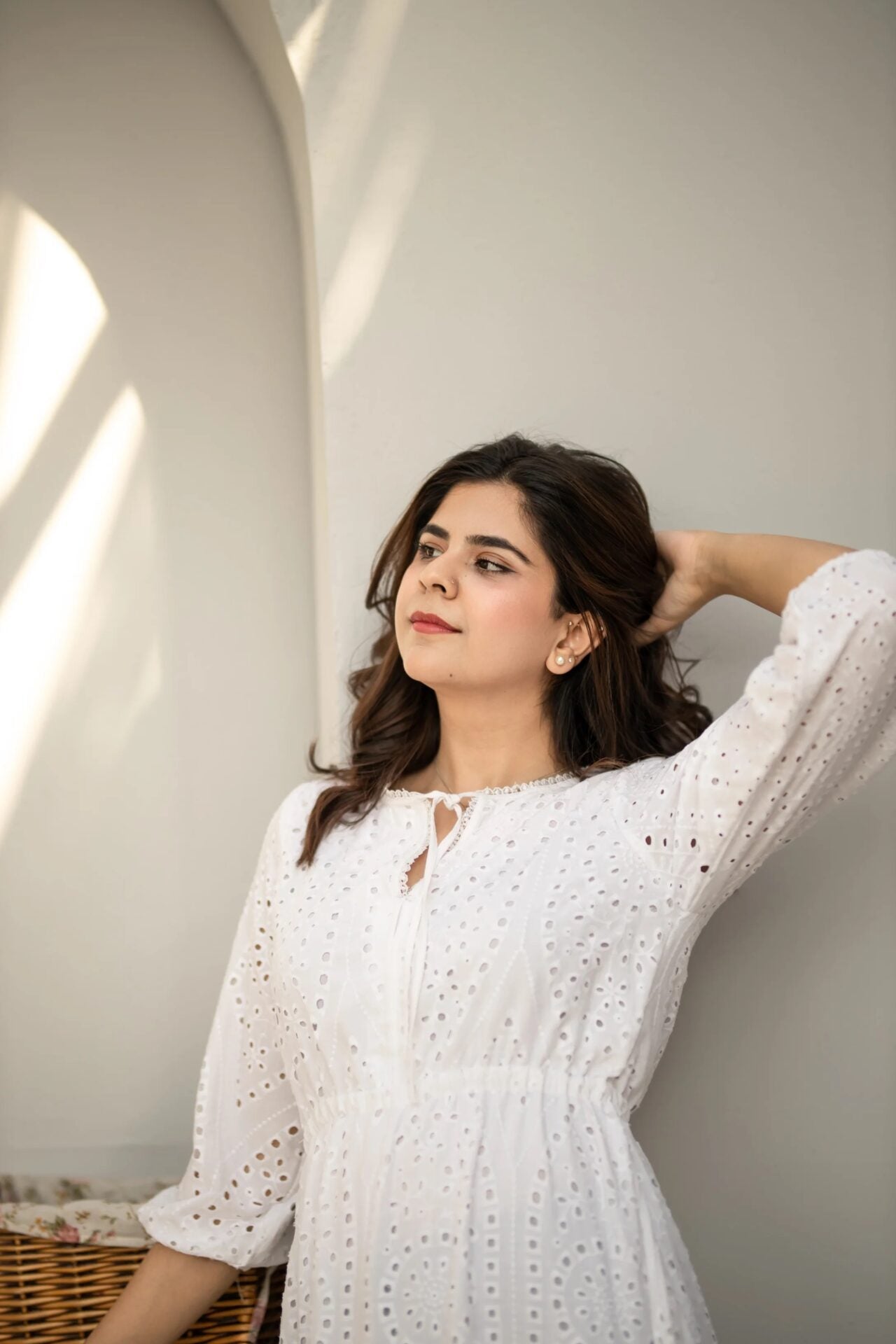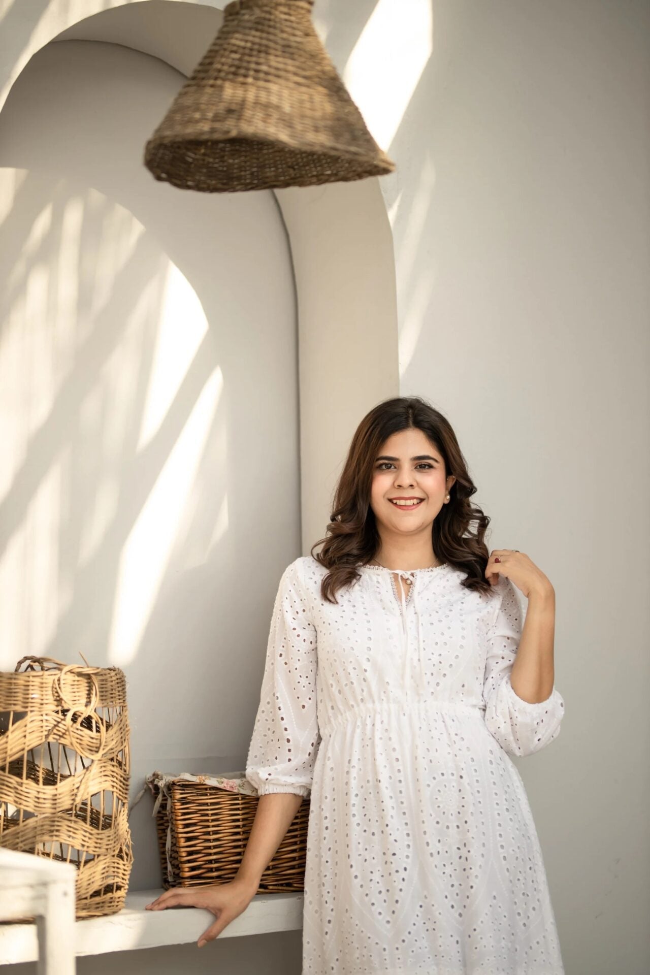 - A gorgeous white eyelet dress featuring our all-time favorite long bottom frill with scallops. There’s elastic in the waistline and a V-cut neckline with a tie.