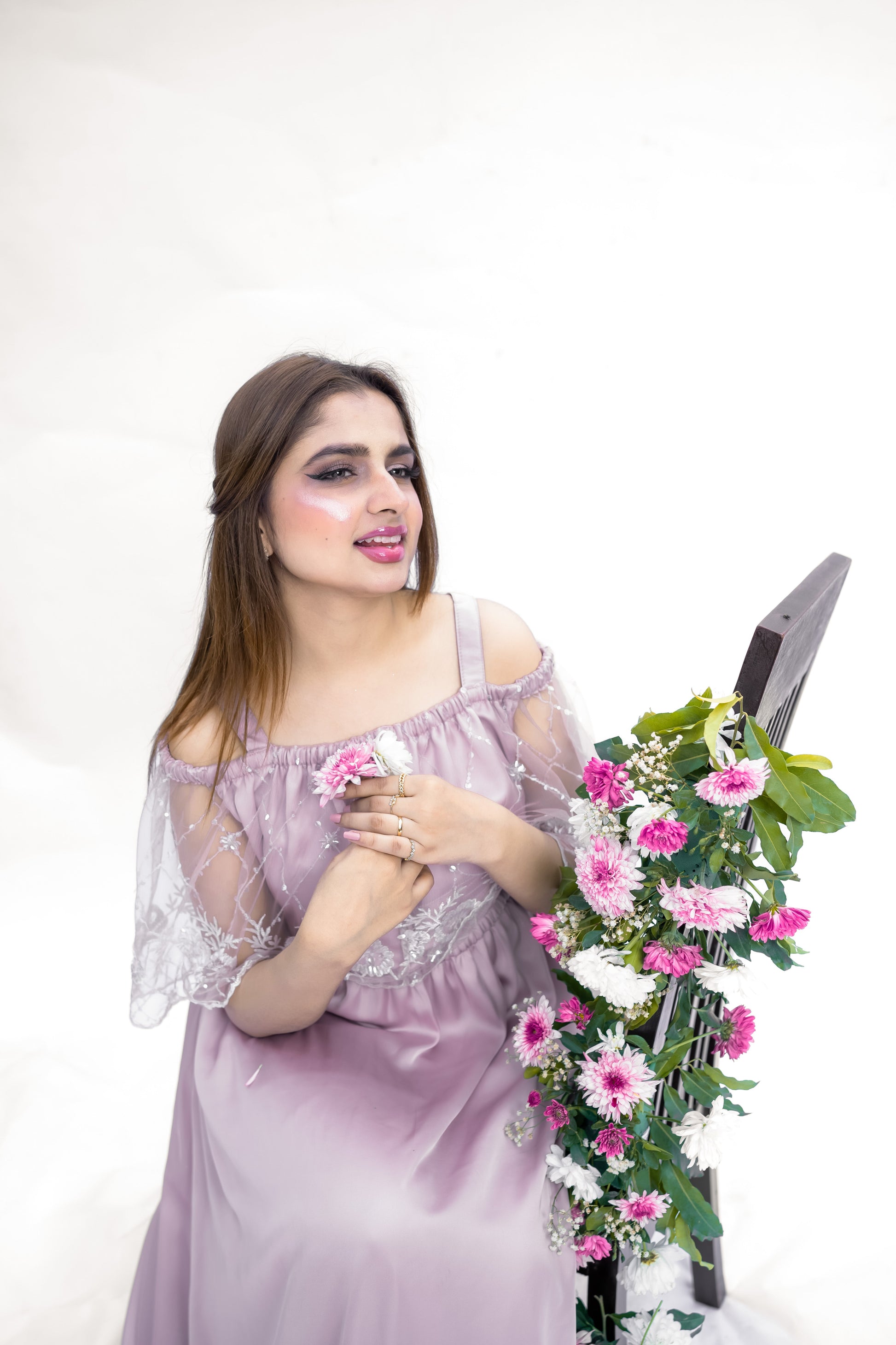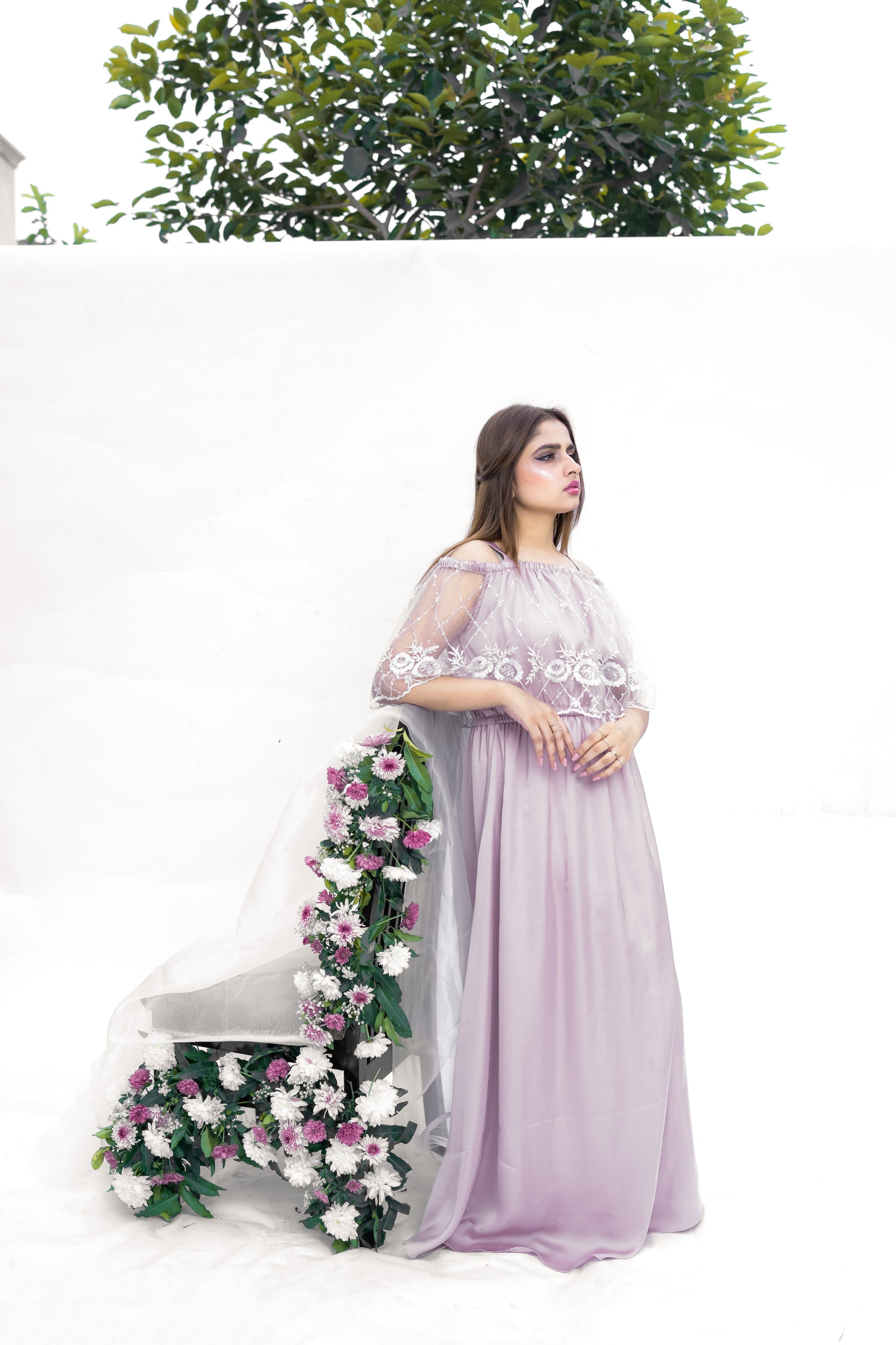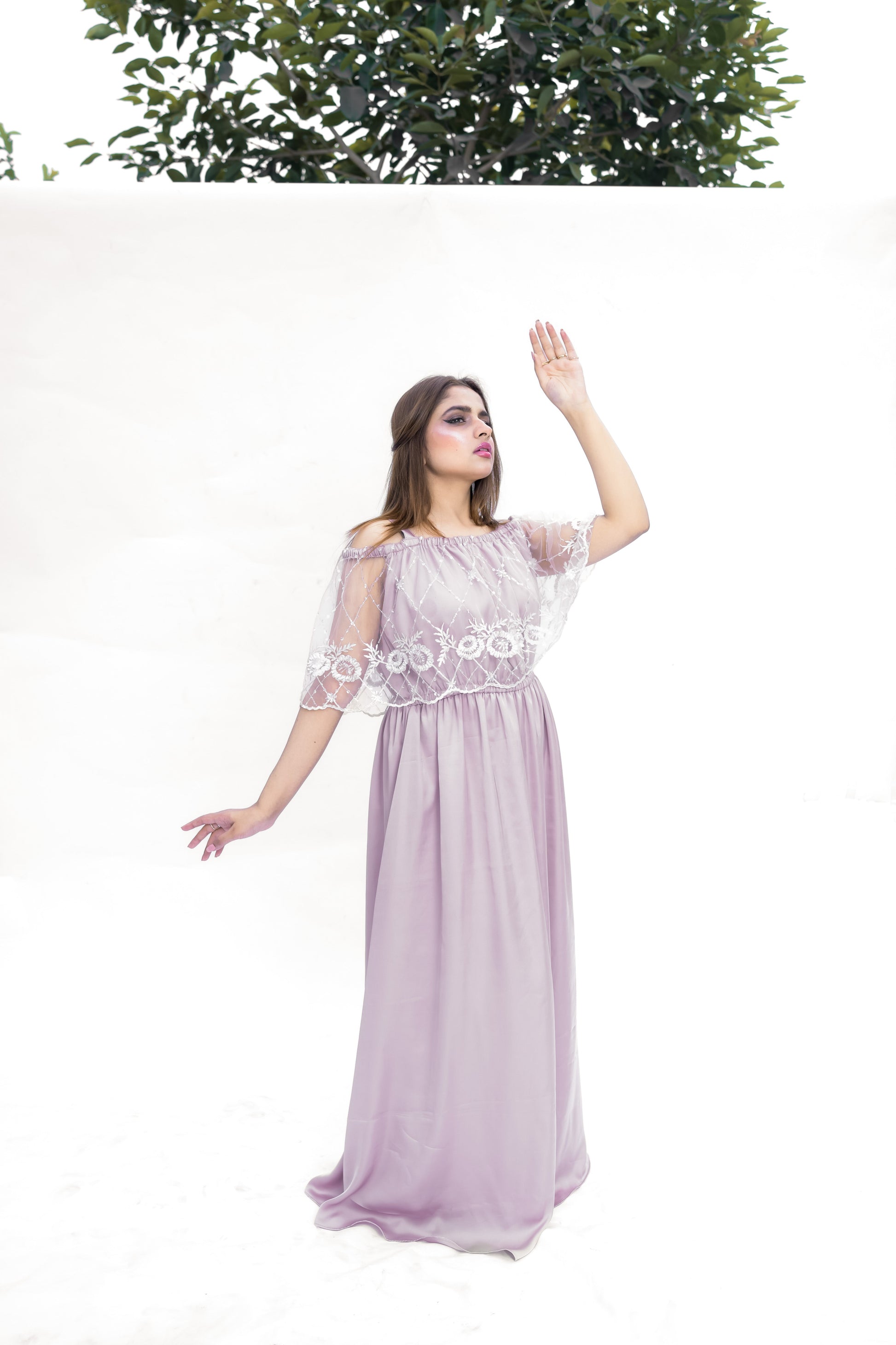 A beautiful pastel silk dress in a off-shoulder cape design. The cape is made of an intricate sequin net and adds further beauty to the dress