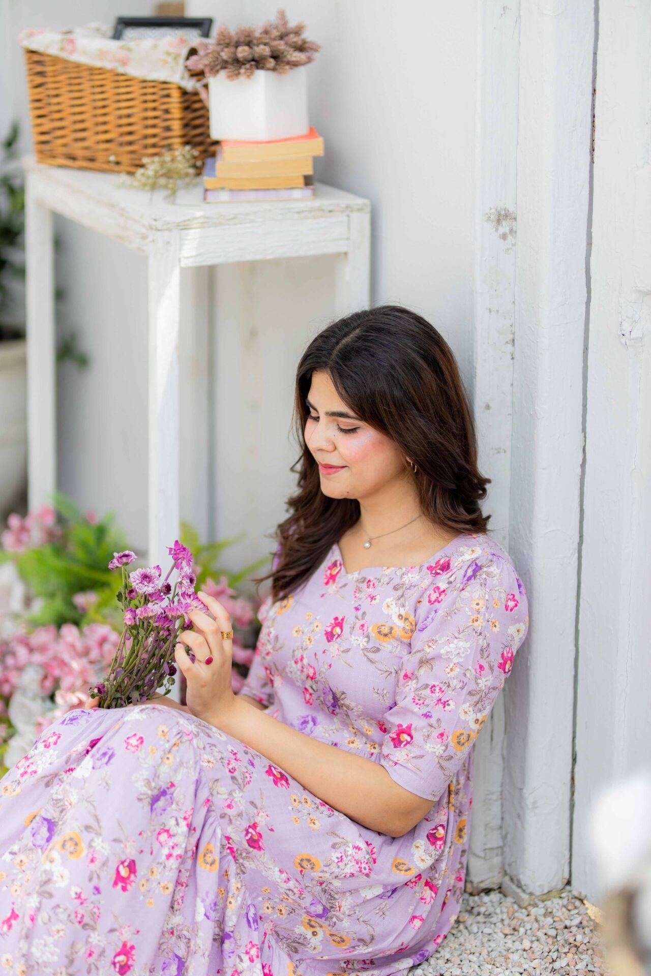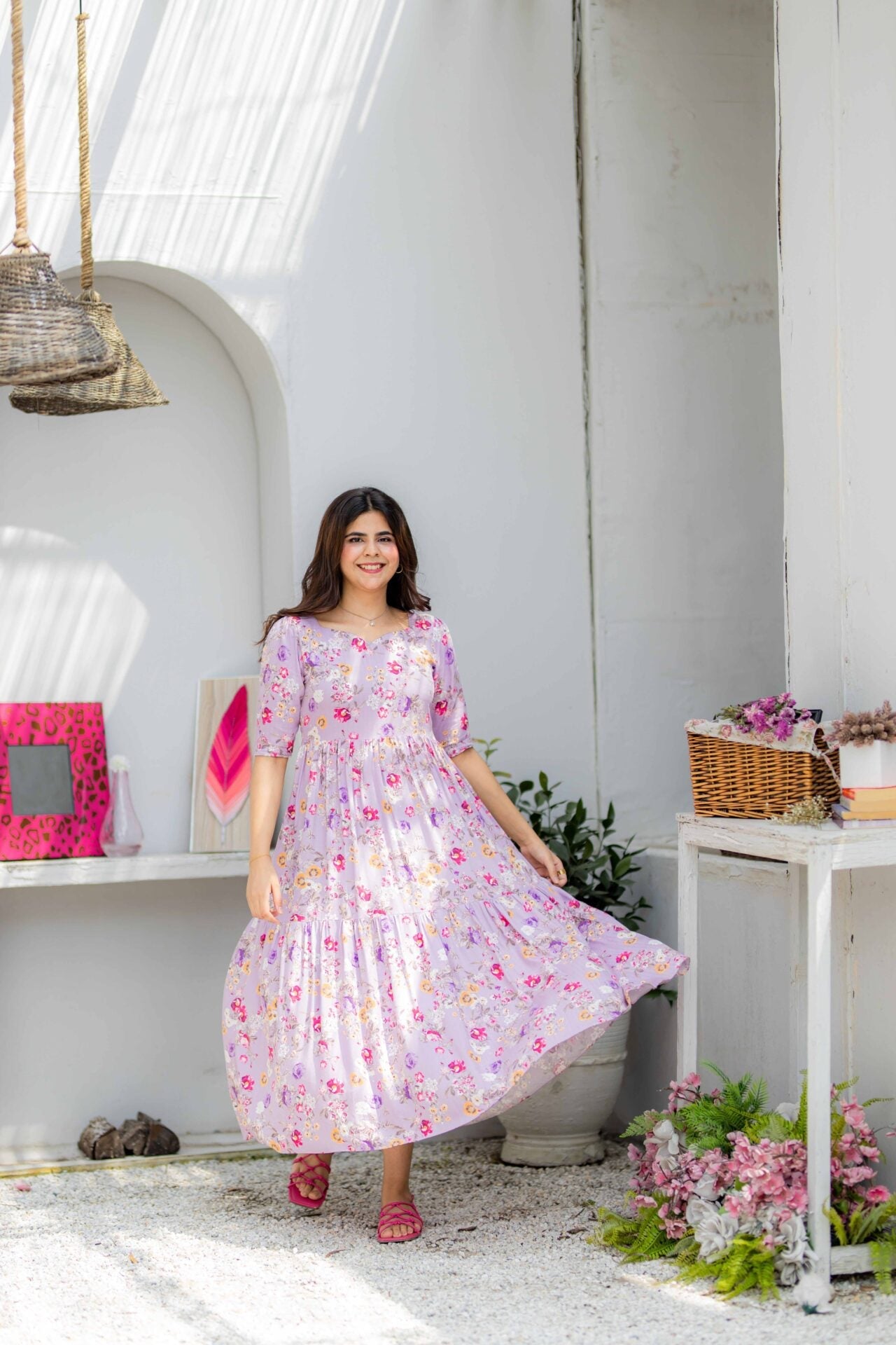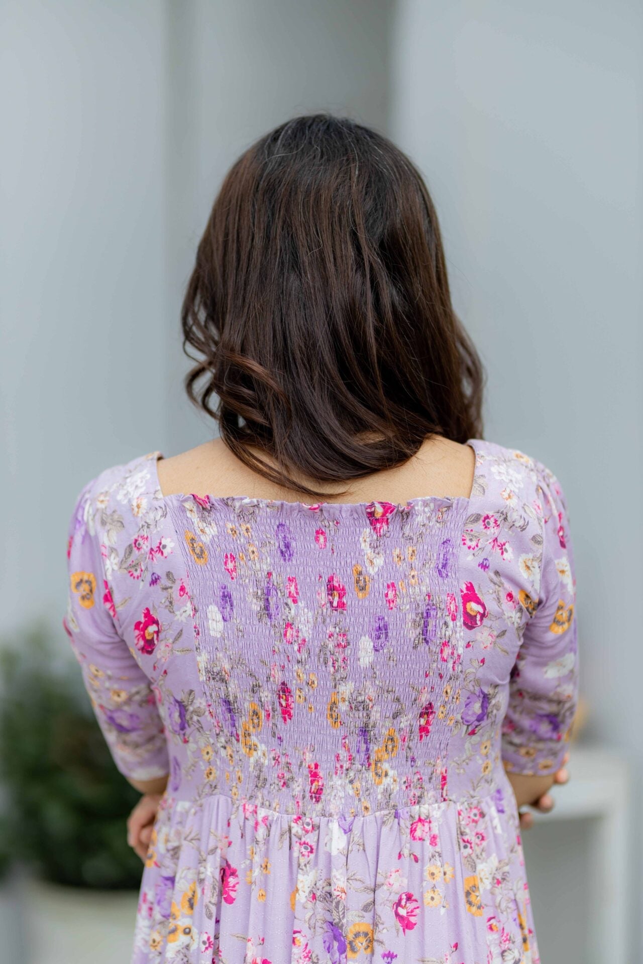 A gorgeous lilac dress giving all the rapunzel vibes! A perfect fusion of sweetheart neckline, two-tiered frill and smocking at the back.