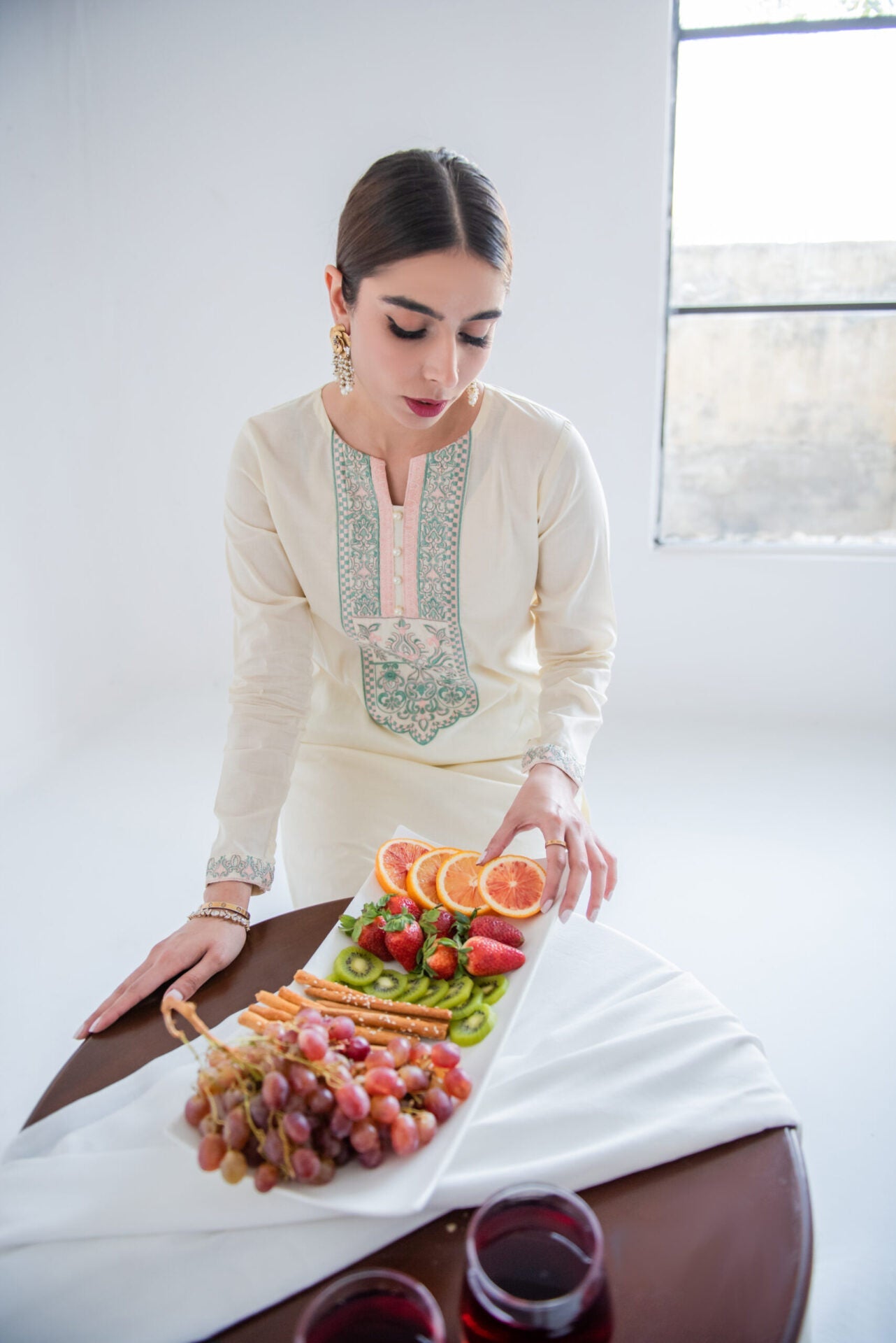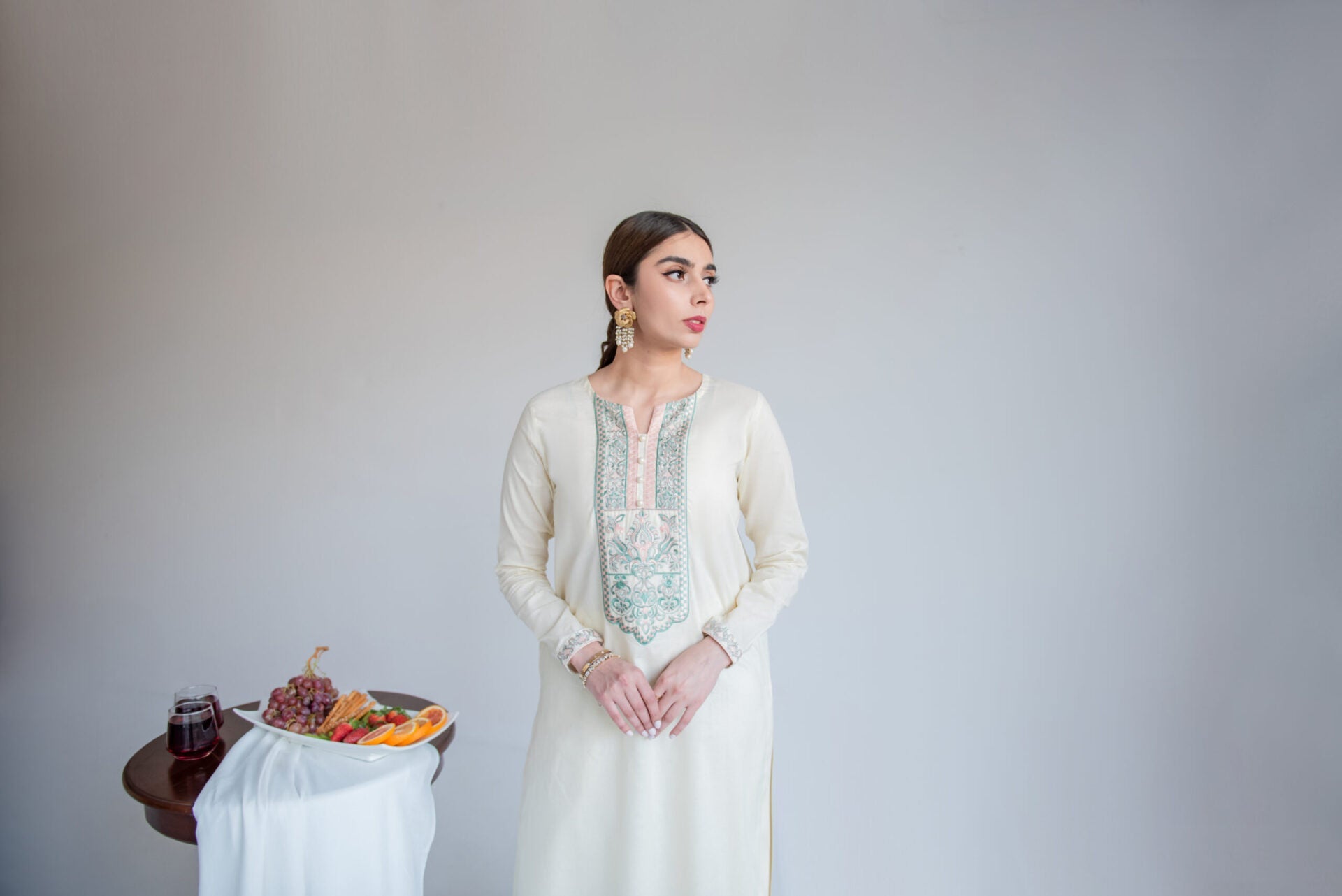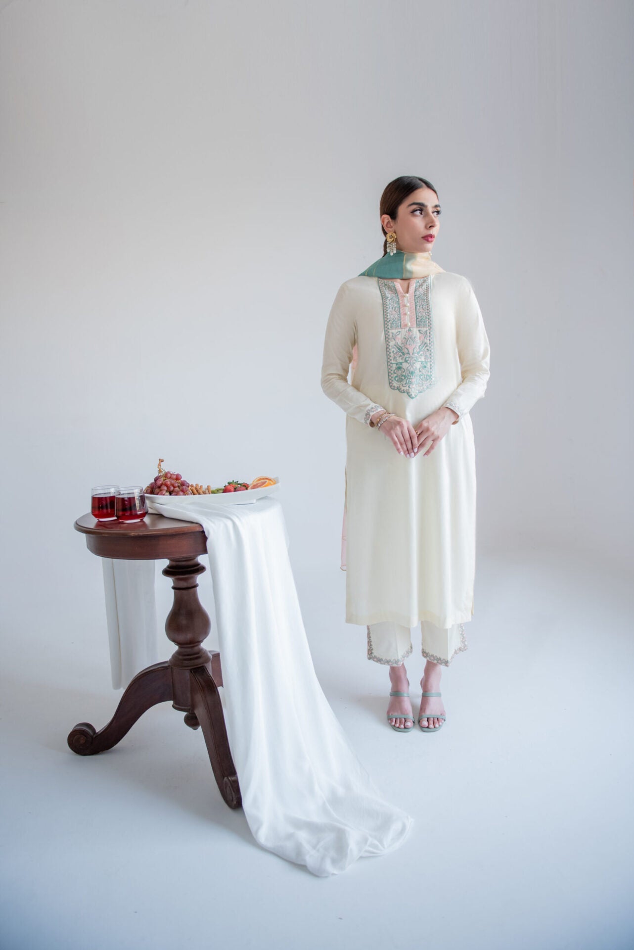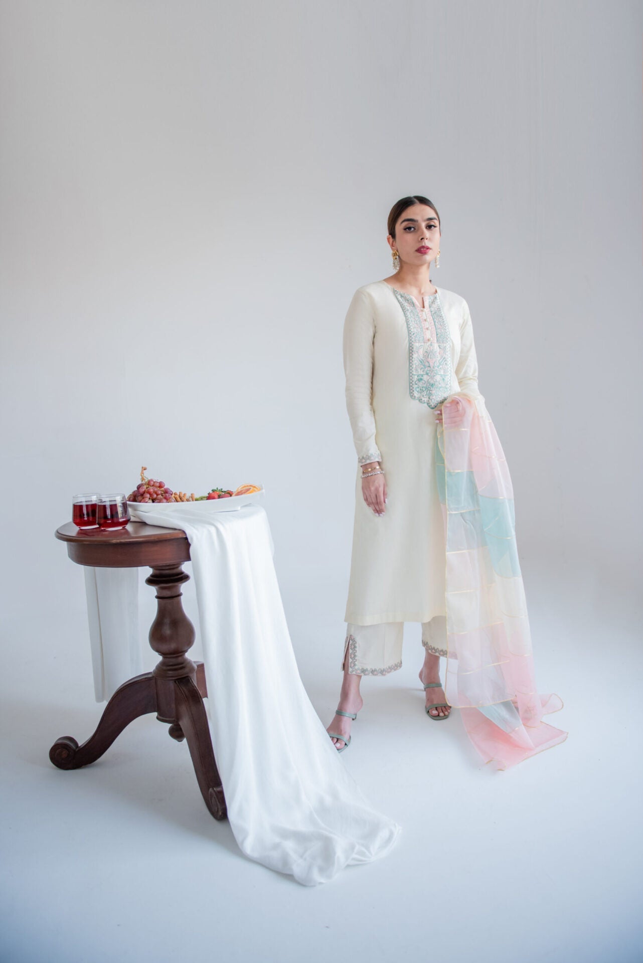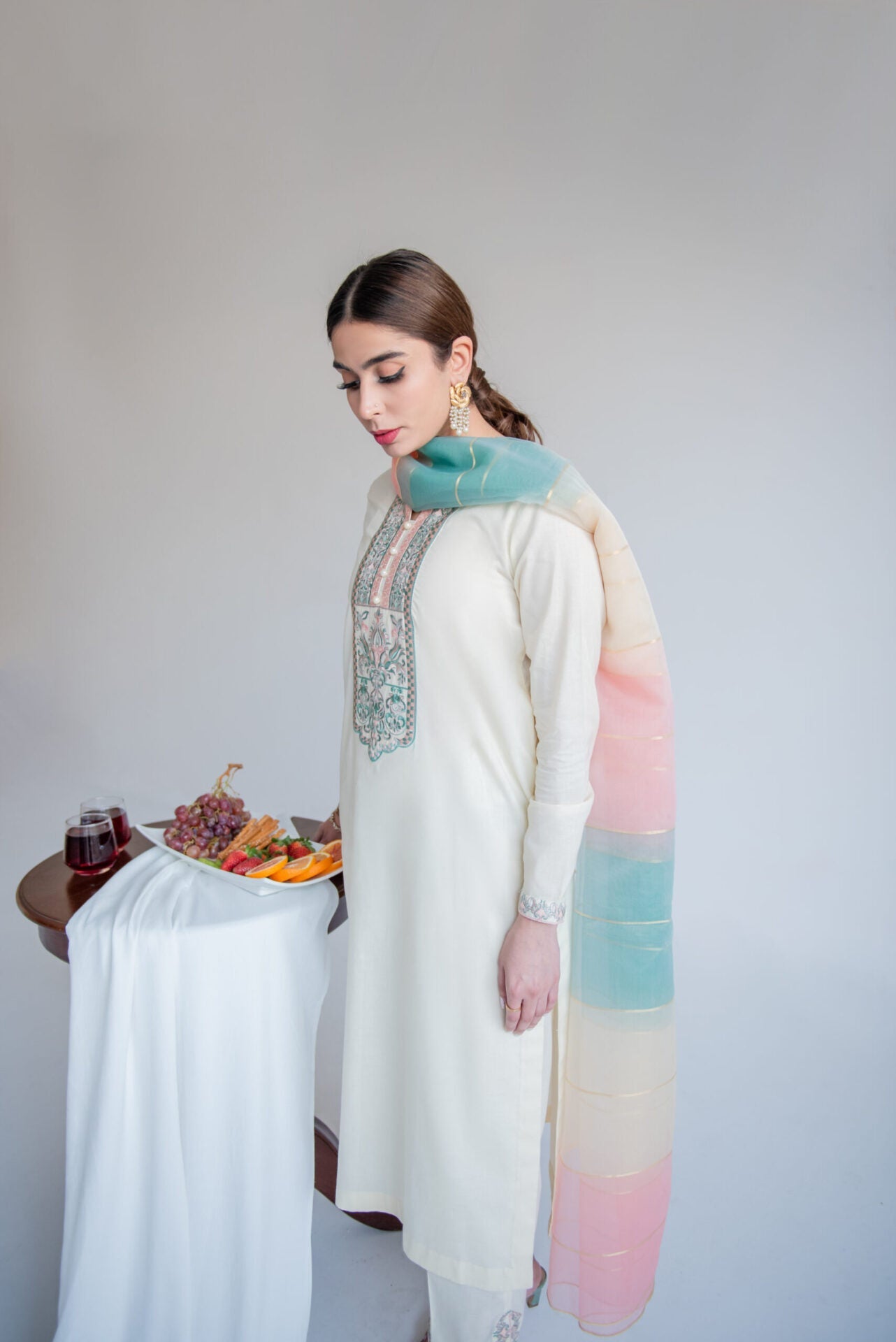 Welcome the festive season with a celestially splendid silhouette with our Vanilla Glaze. The cotton shirt is adorned with an embroidered neckline and sleeves paired with a cotton trouser. The look is completed with a multi colored organza dupatta with gold borders.