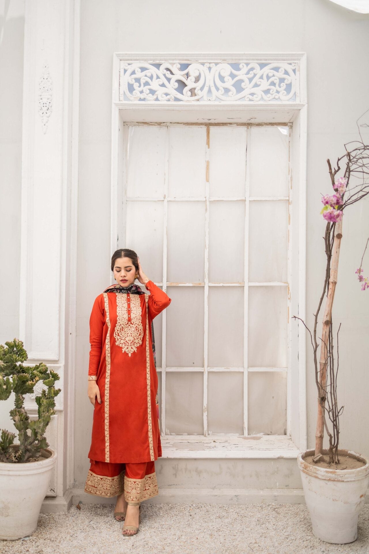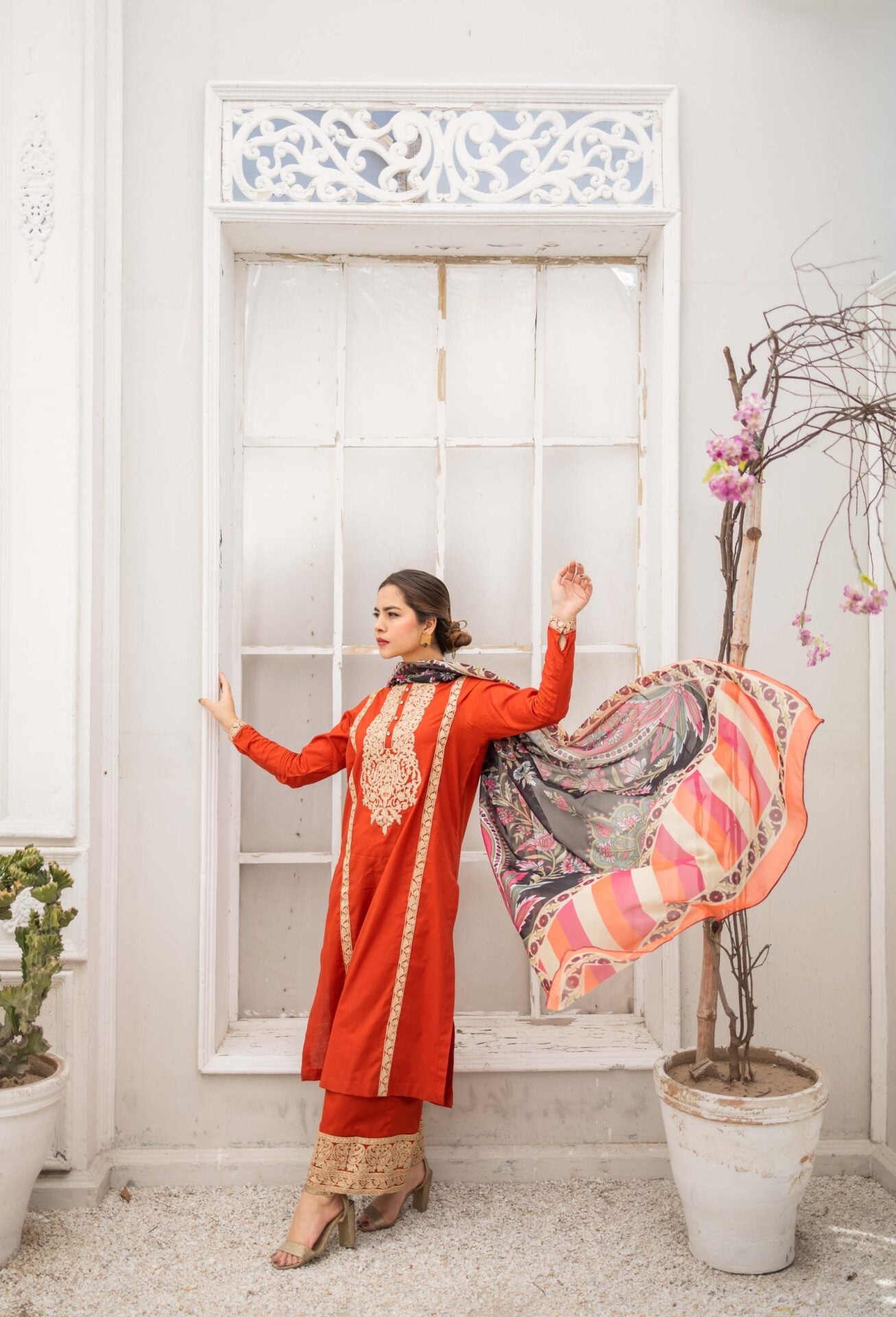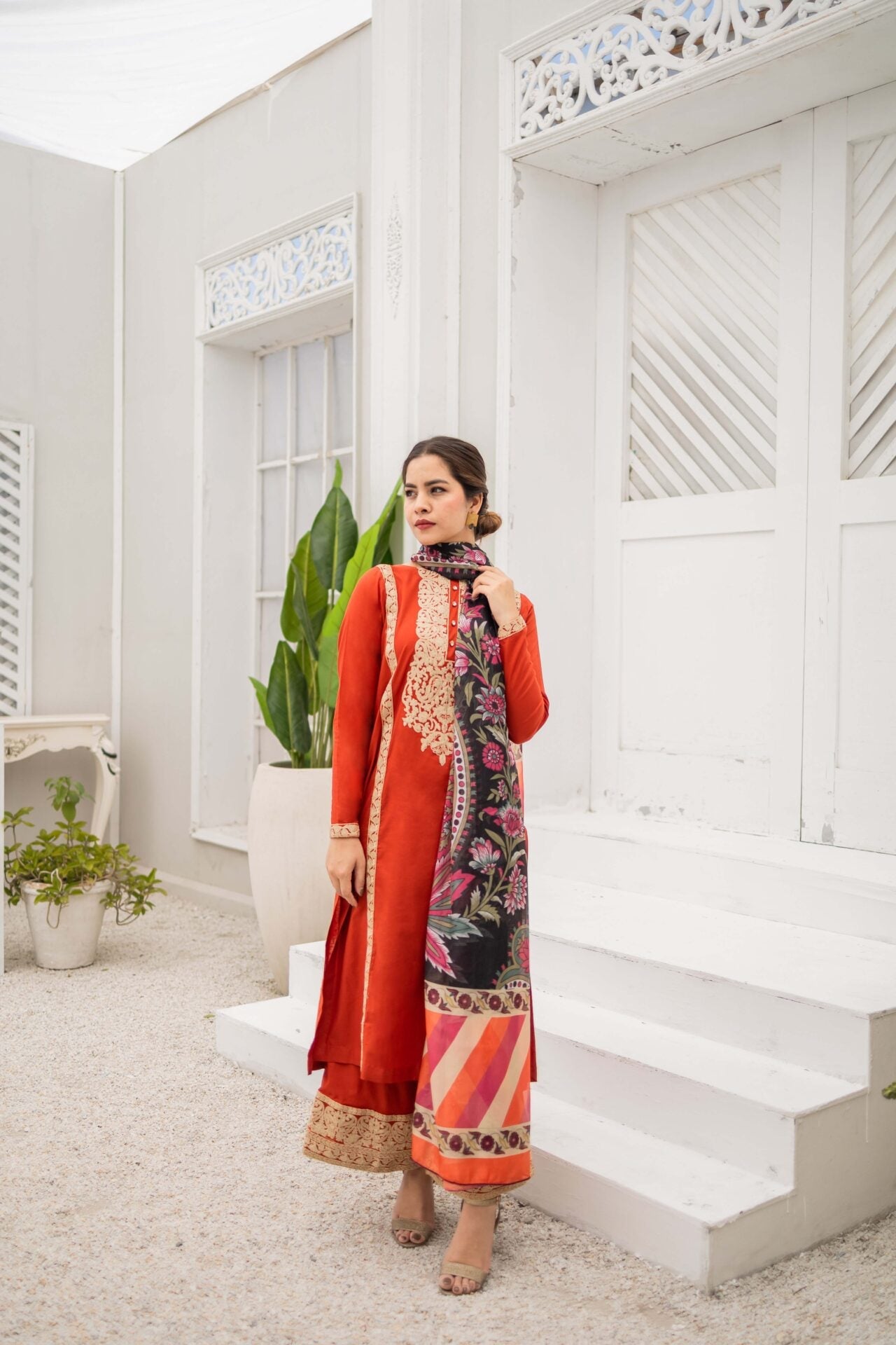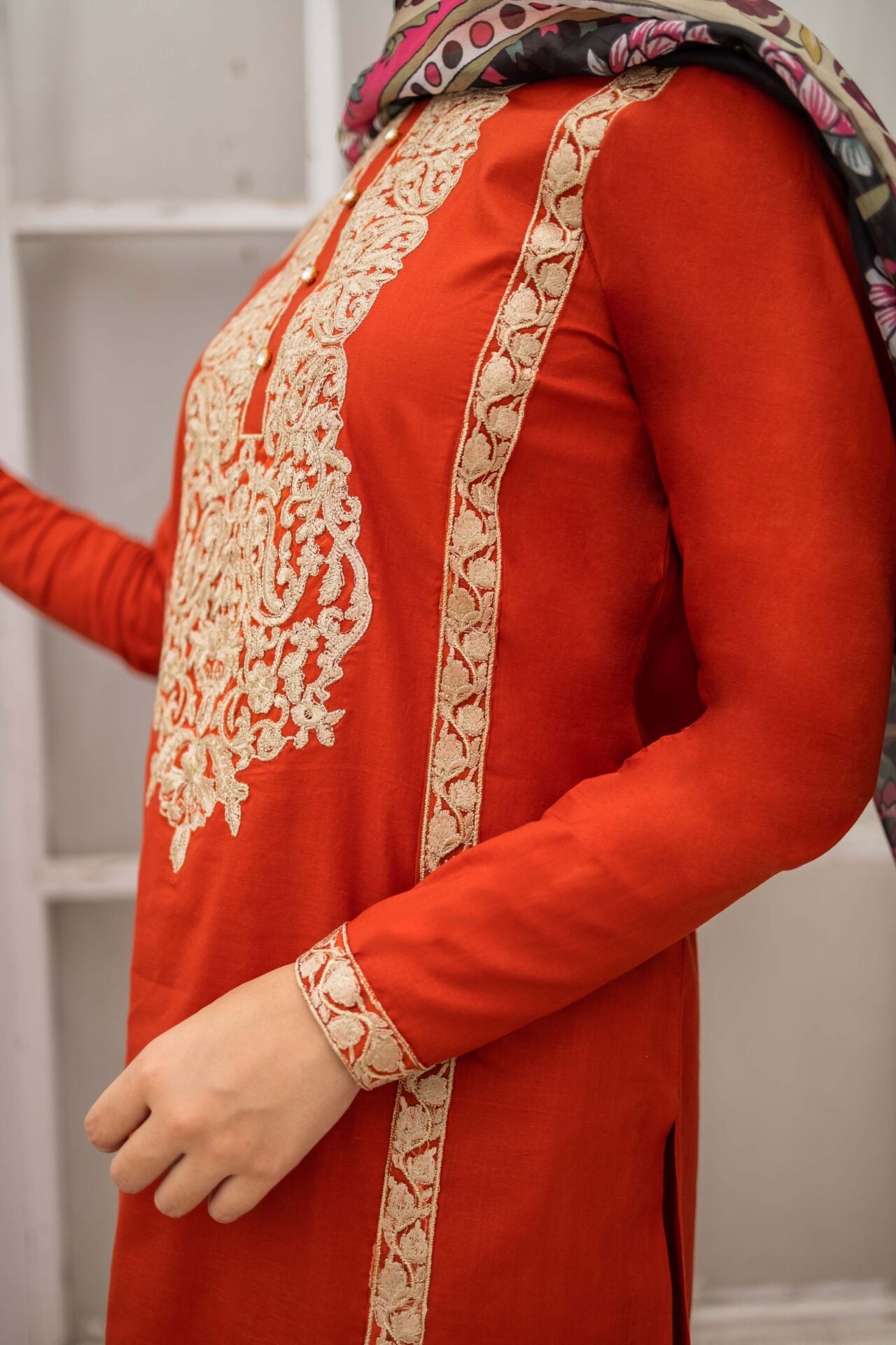 Vivid Sunrise is a bright rust three piece suit featuring gold and off-white embroidery all over the rich cotton shirt, paired with a heavily embroidered cotton culotte trouser. The suit is complimented with a printed silk dupatta.