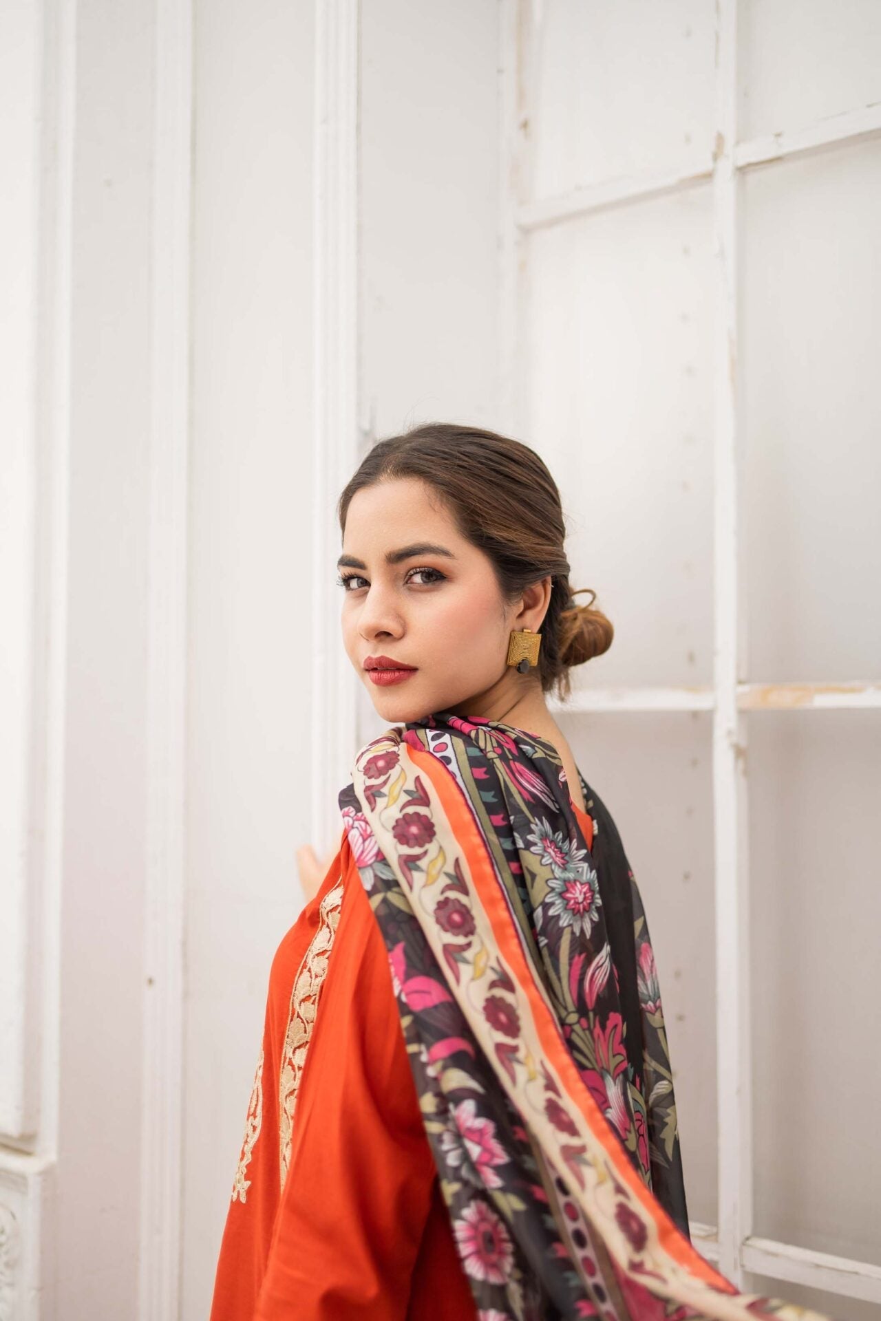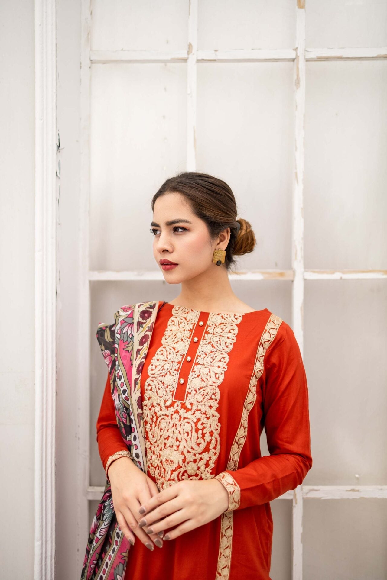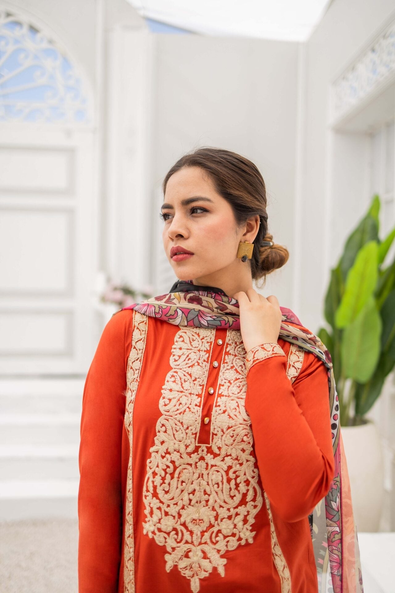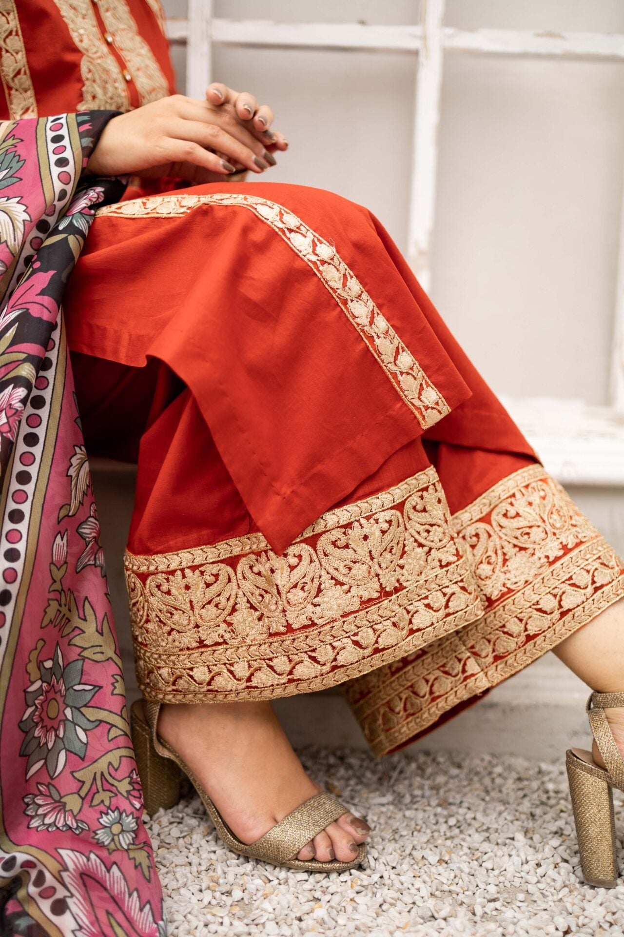 Vivid Sunrise is a bright rust three piece suit featuring gold and off-white embroidery all over the rich cotton shirt, paired with a heavily embroidered cotton culotte trouser. The suit is complimented with a printed silk dupatta.