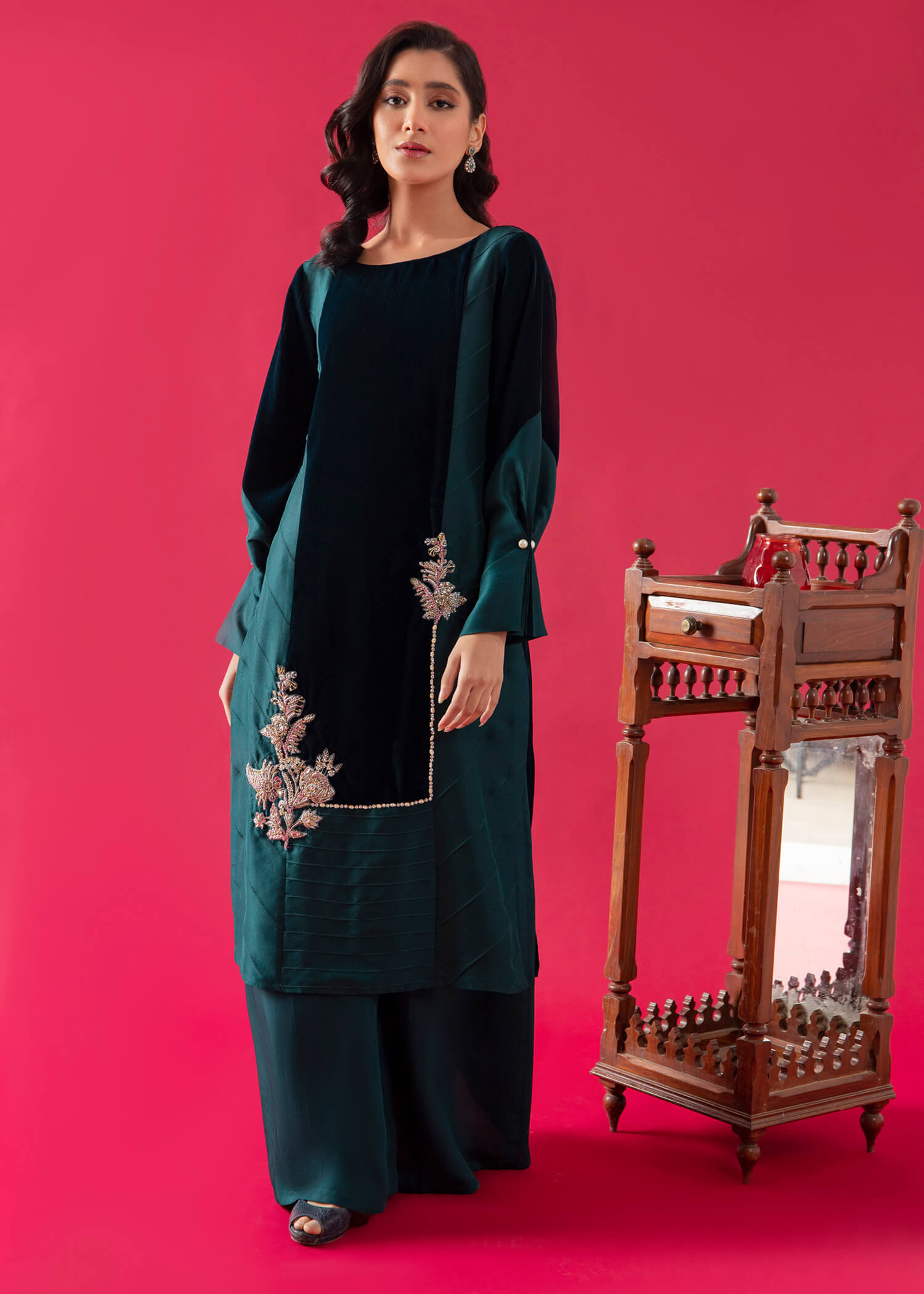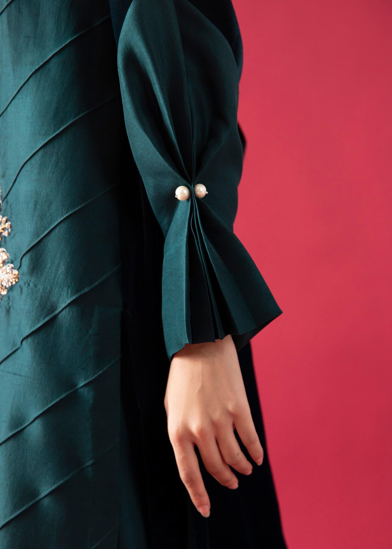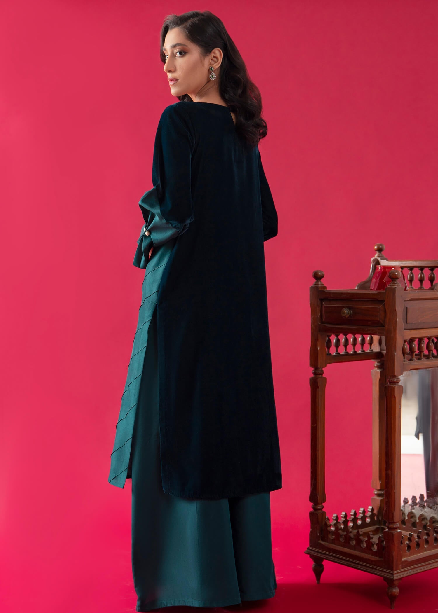A silk paneled velvet shirt matched with pants of silken viscose and pleated details on sleeves.