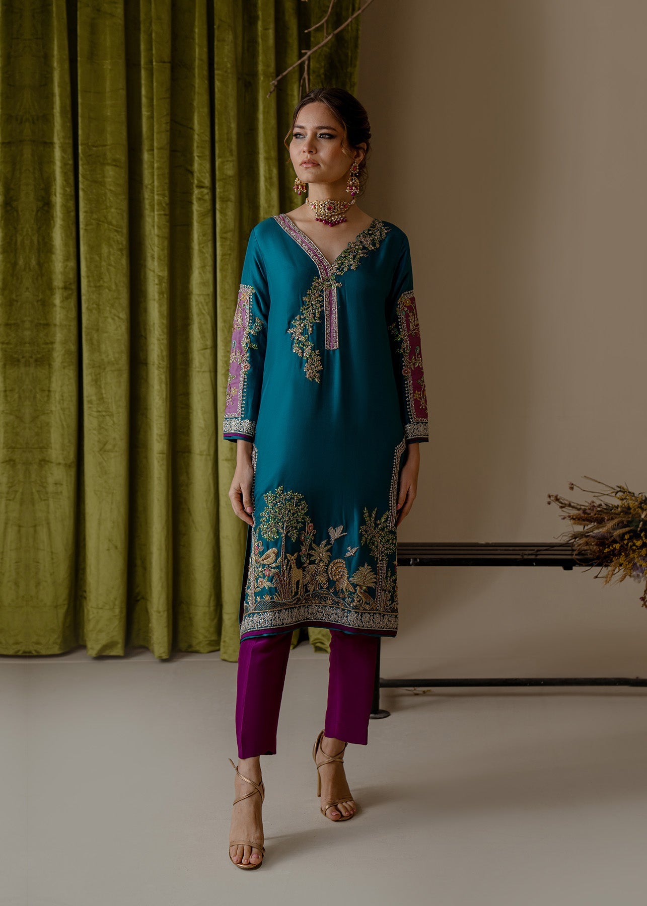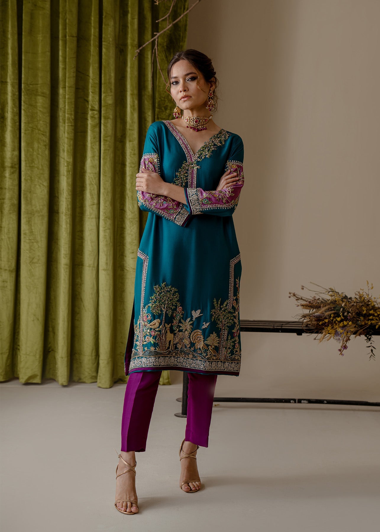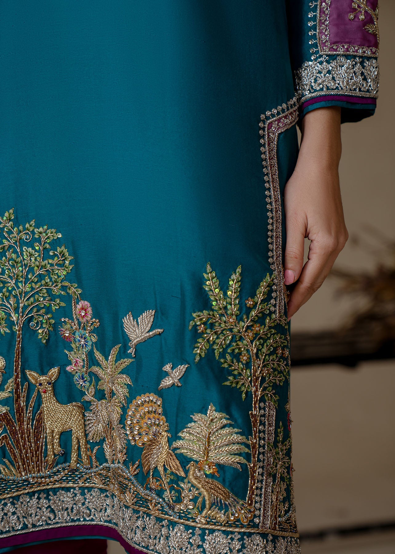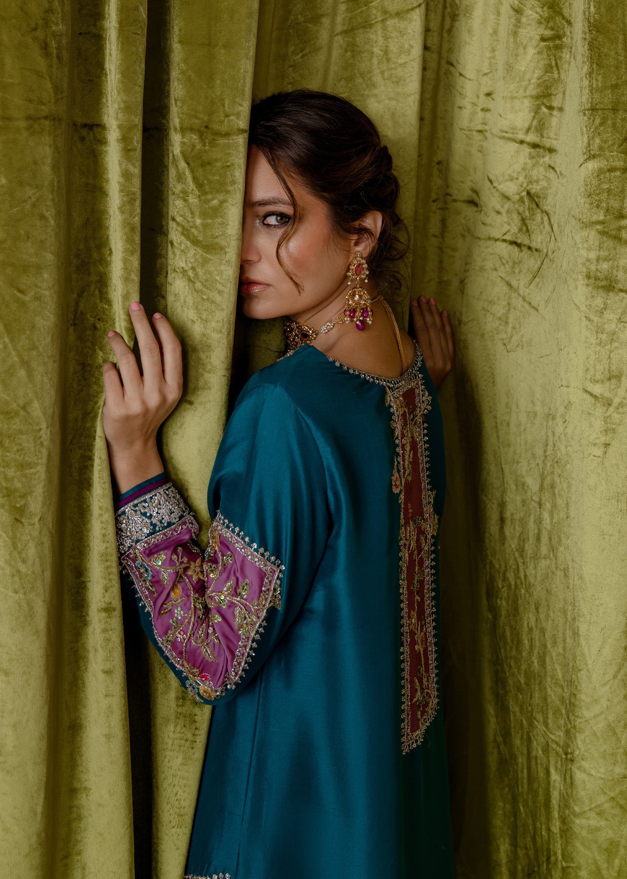An elegant azure tone rawsilk dress delicately embellished with zardoze and resham work featuring oriental elements. The look is paired with a matching organza kamdani dupatta and is perfect to be styled for any festive occasion.