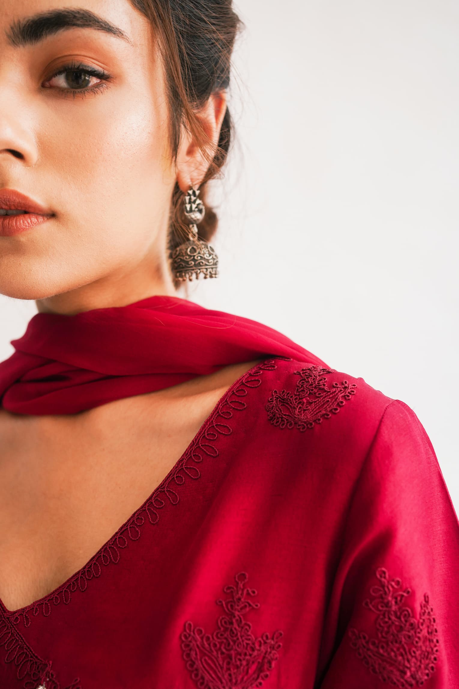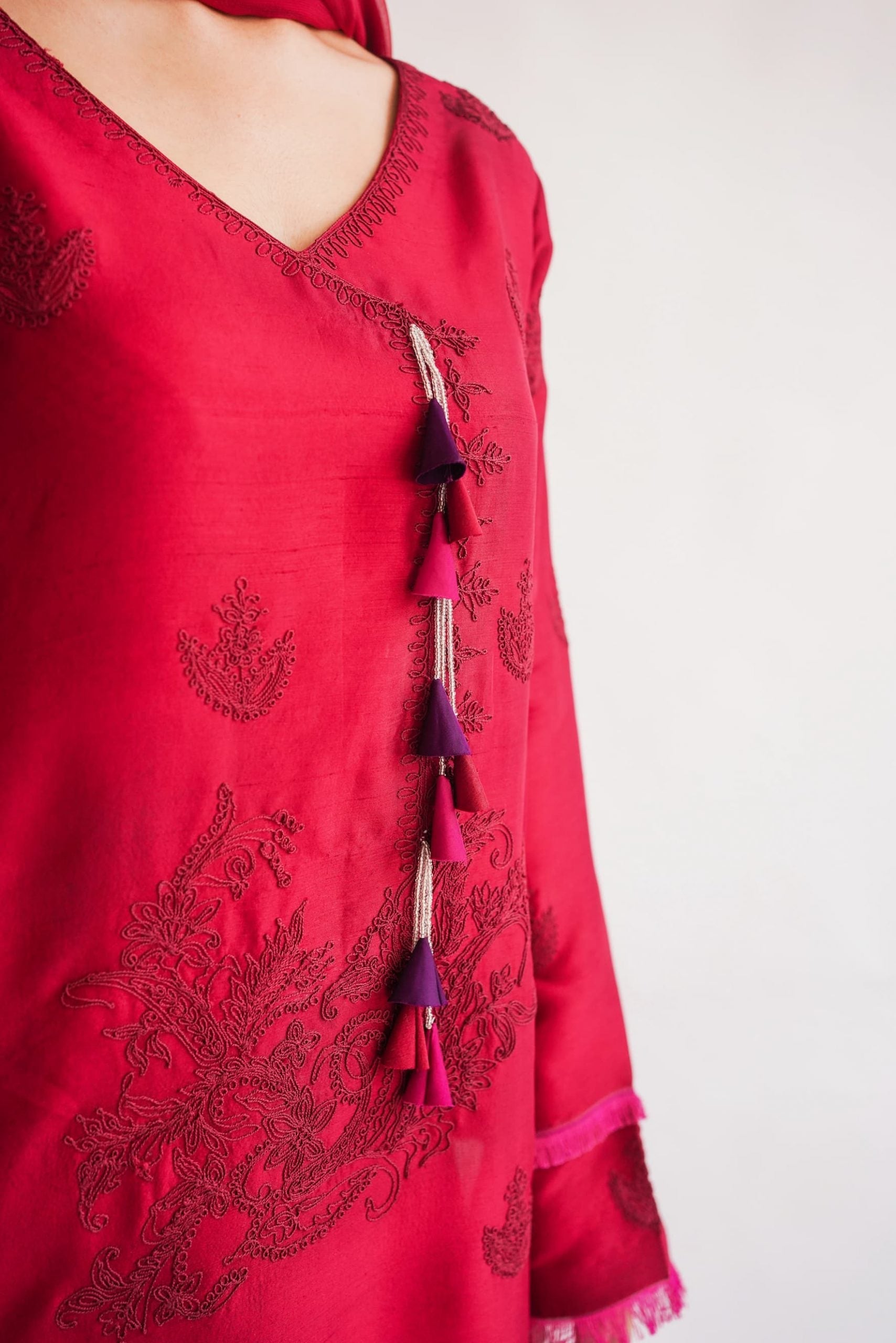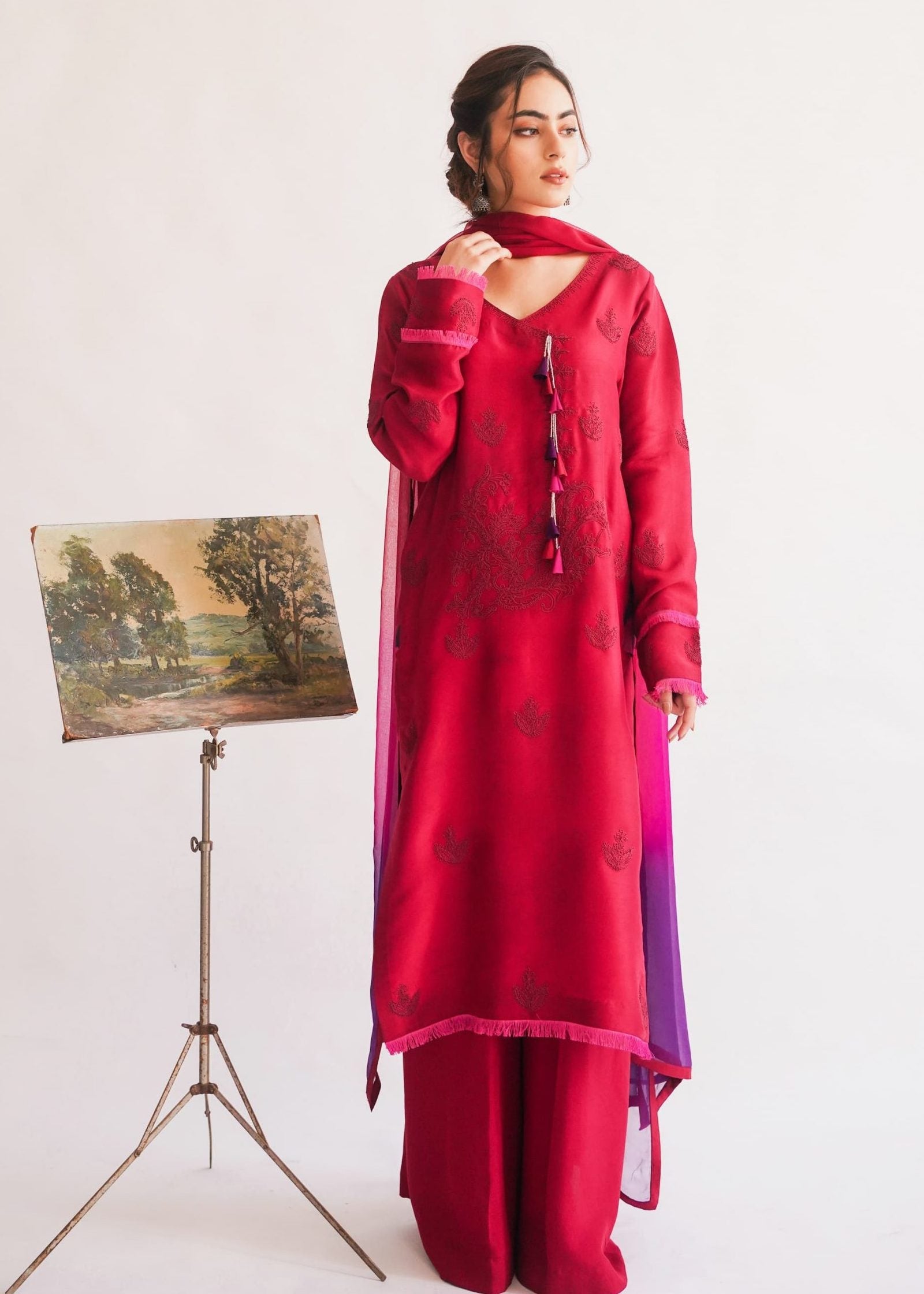 Ayanna is a vibrant, deep crimson set that emanates elegance and sophistication. Adorned with beautiful embellishments and an innovative, graceful neckline, the raw silk shirt is an exquisite tribute to modern style with a hint of a traditional trace. Paired with monochromatic trousers and a chiffon dupatta portraying a gradient of red, pink, and purple shades, this stunning set depicts a harmonious symphony of charm and glamor.