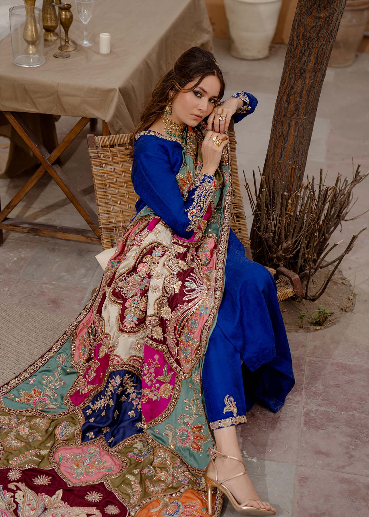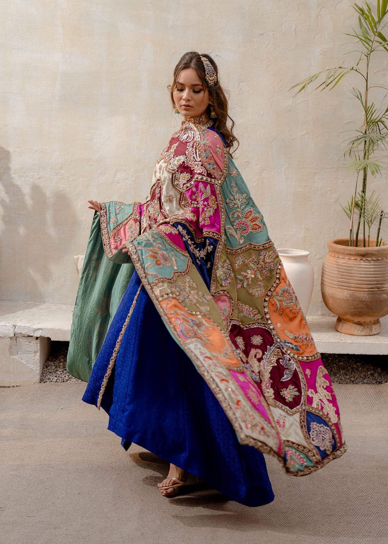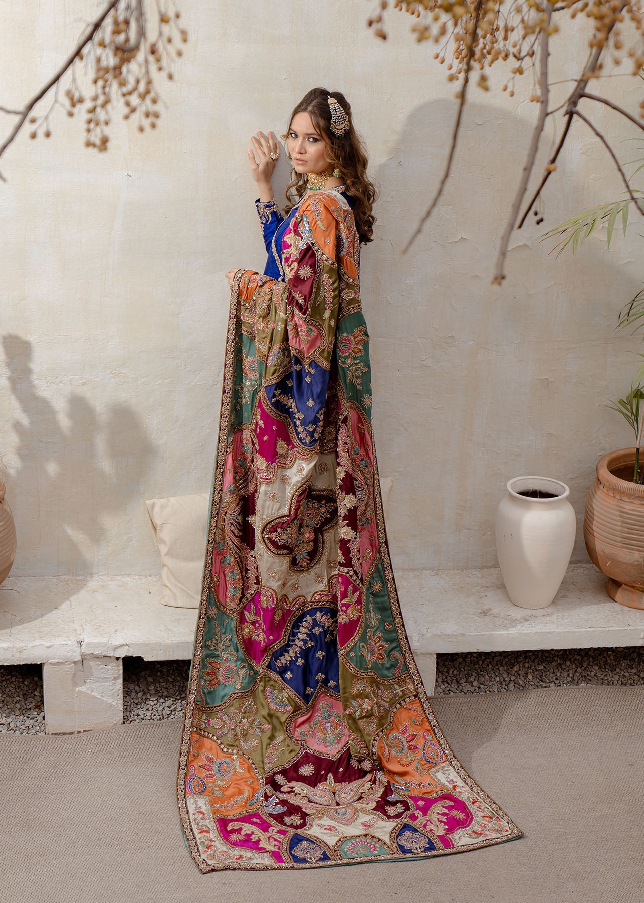 Ayla is a captivating canvas of sublime blue, is adorned with intricate floral embroidery over a patch work, featuring alluring shades of blue, green, rust, and ivory. The detailed composition, serving as the canvas, adds a uniquely exquisite dimension to the shawl. This artistic masterpiece is complemented by a contrasting deep-hued embroided dress, adorned with traditional marori embroidery motifs, making it a design equivalent to a work of art.