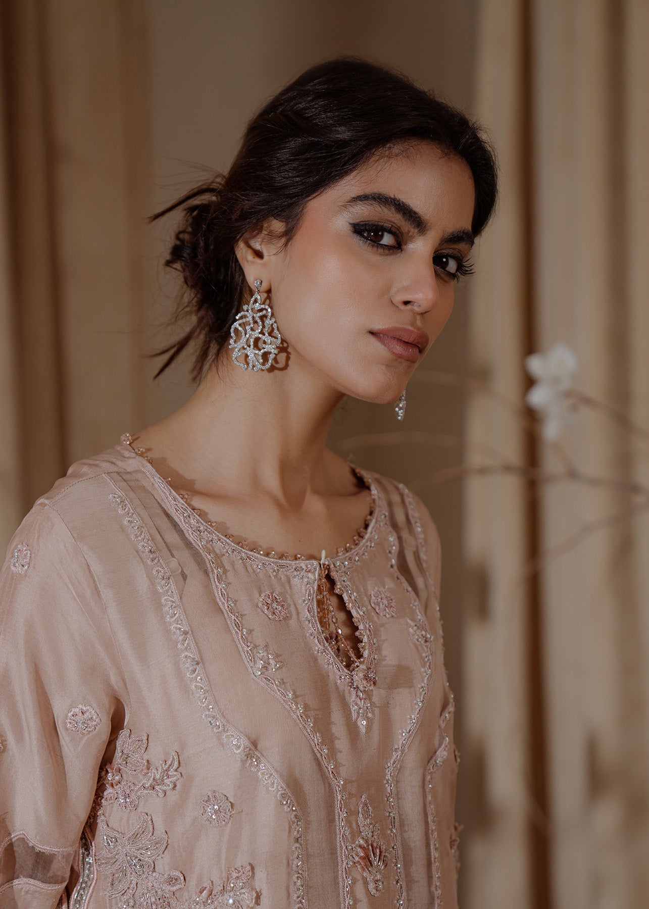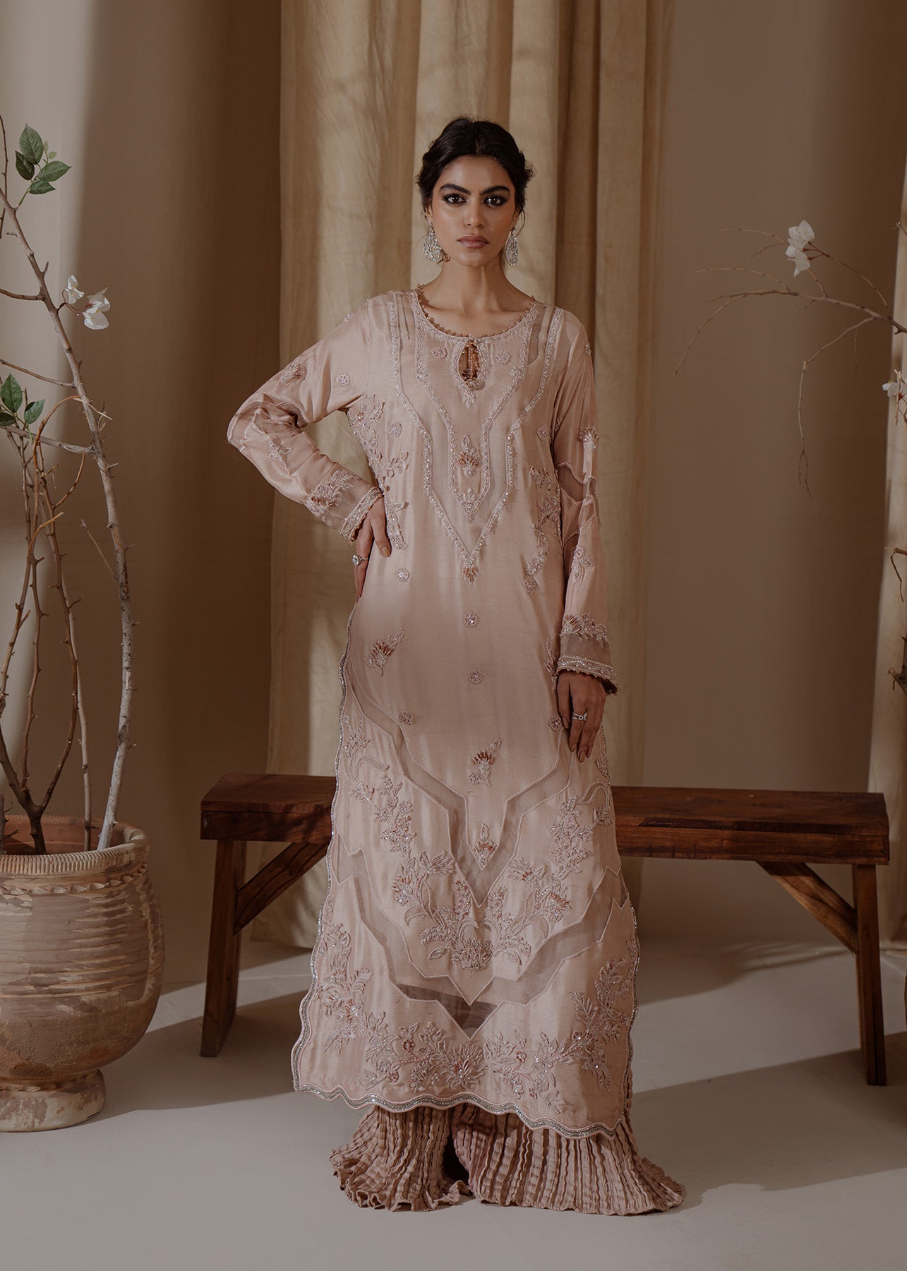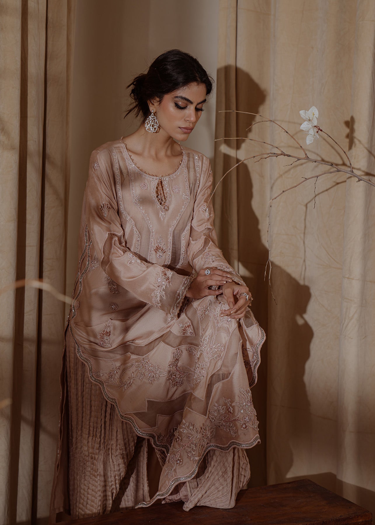 A contemporary take on a classic kaftan silhouette, cut from raw silk in an elegant shade of chai pink. Silver embellishments over 3-D thread work floral motifs add a touch of uniqueness to the look, making it effortlessly classy.