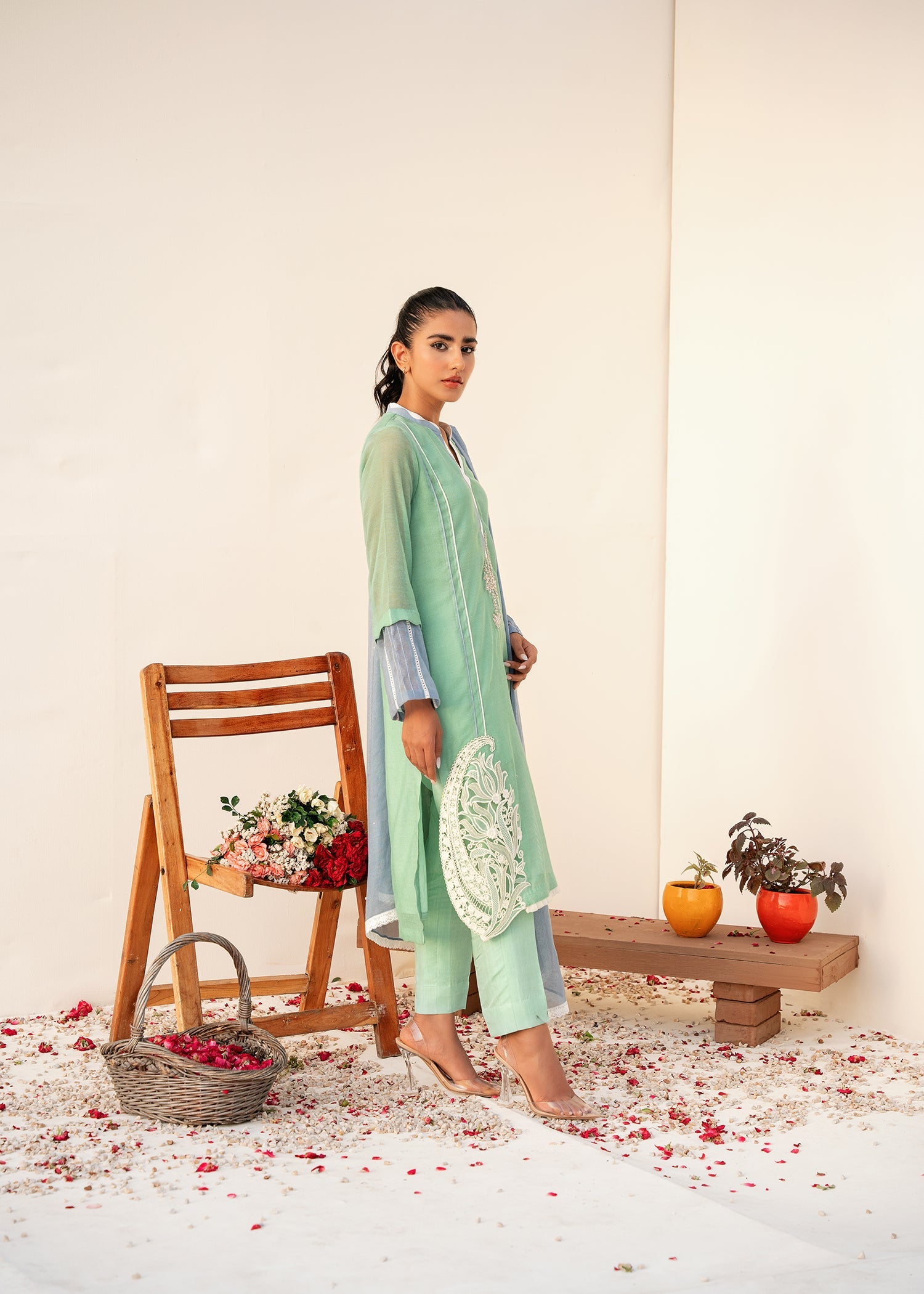 Azal is a mint green, which is a cool and refreshing shade. It adds a subtle and soothing touch to the overall look. The bottom of the shirt features cutwork embroidery that adds a delicate and intricate design to the dress, creating a beautiful visual effect.