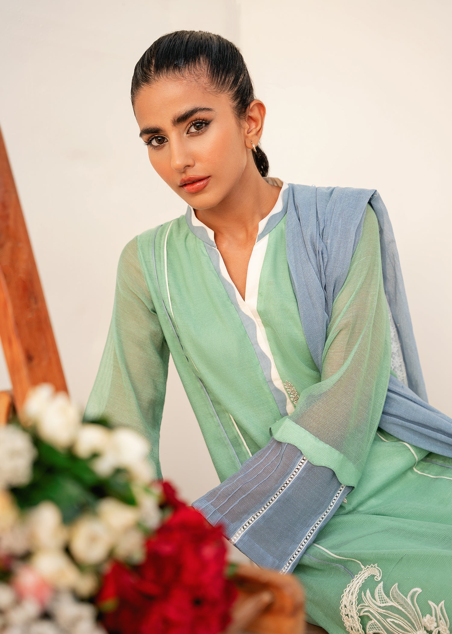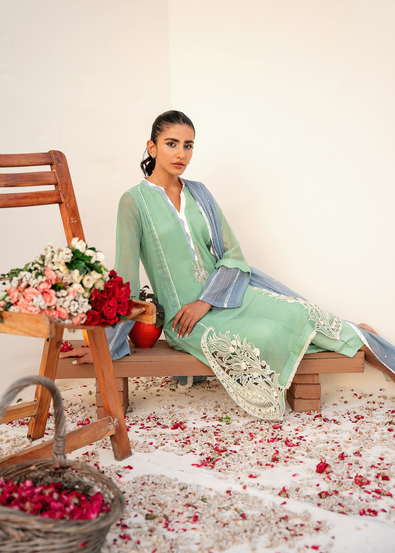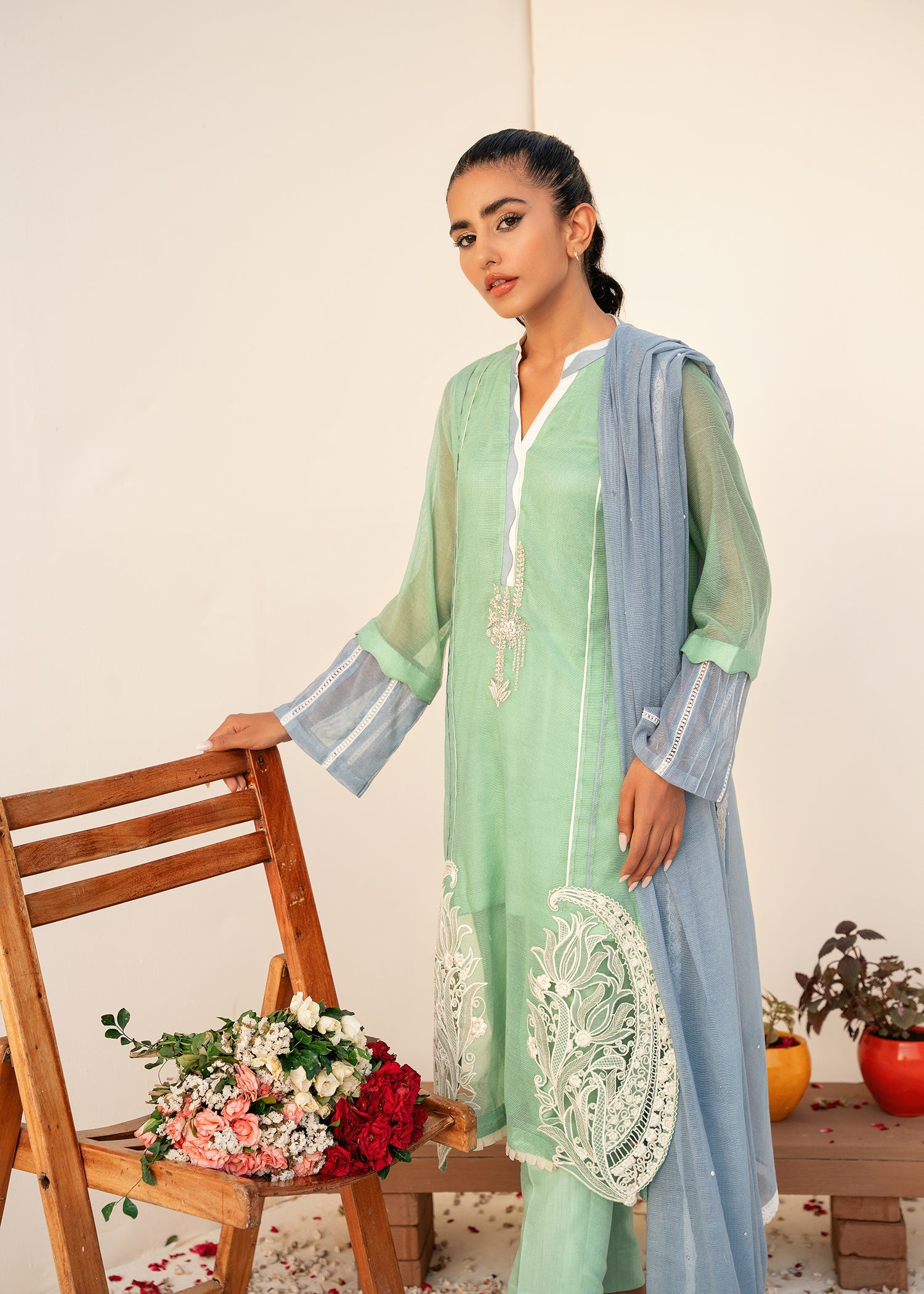 the neck line is enhanced with hand embrioded motif and scalloped details, paired with contrasting ice blue duppata.