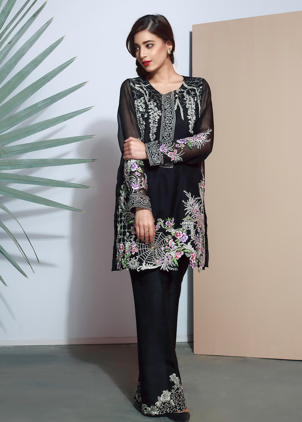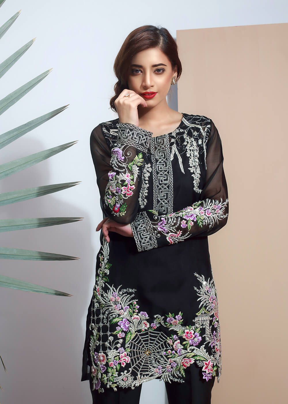 Be a stunner in this beautifully embellished black organza shirt. An amalgamation of silver and pink embroidery, pearls, sequins and crystals. The hem of the shirt is a result of delicate cutwork. Pair it with embroided black bell trousers.