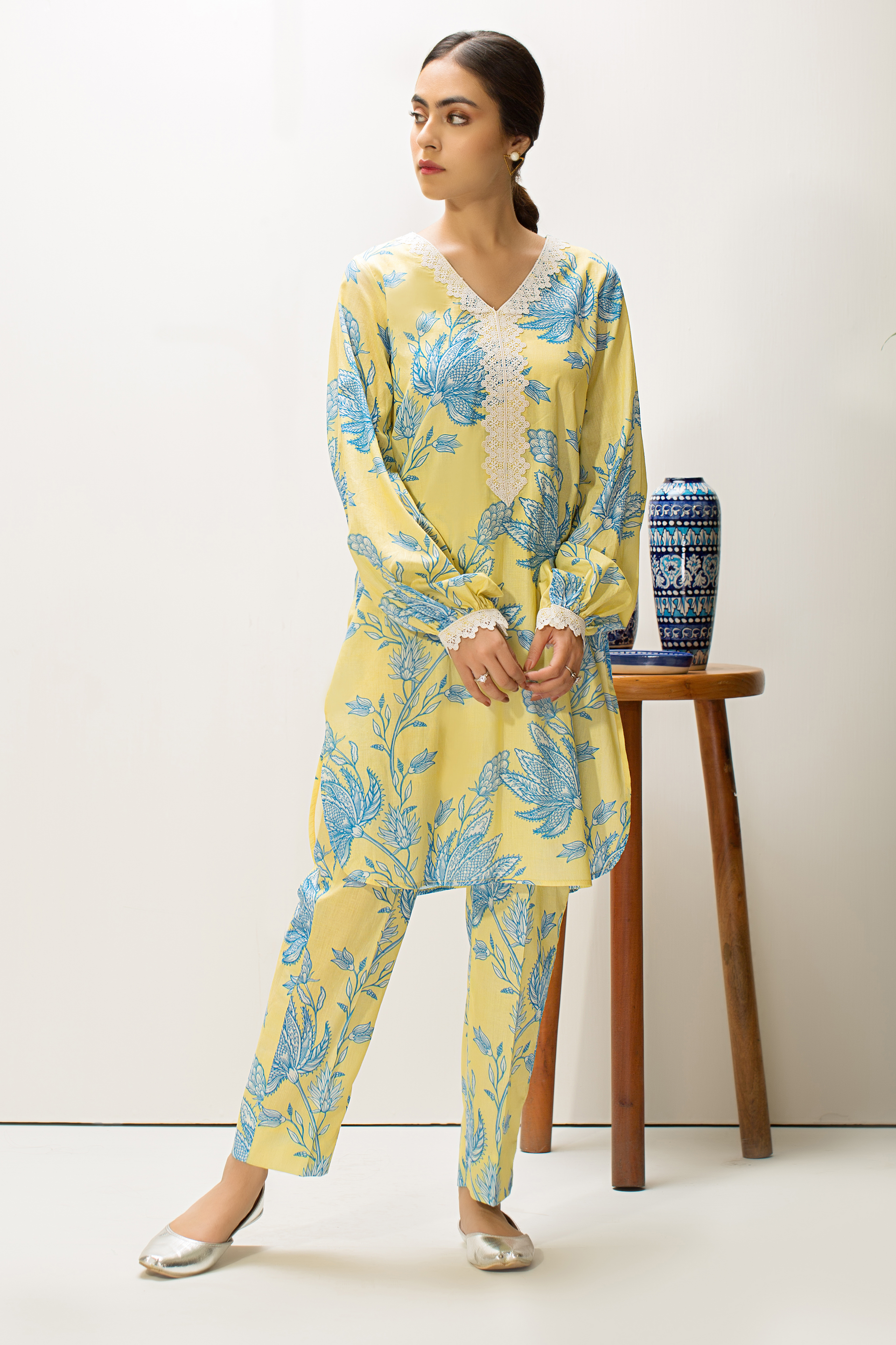 A breezy canary yellow lawn silhouette is the perfect balance of print on print. Finished with a scallop lace detailing on the sleeves and neckline.