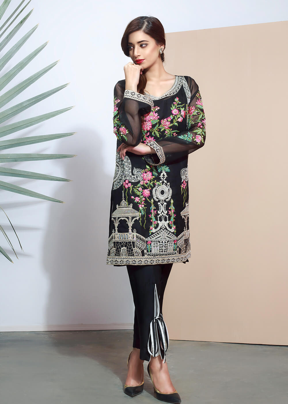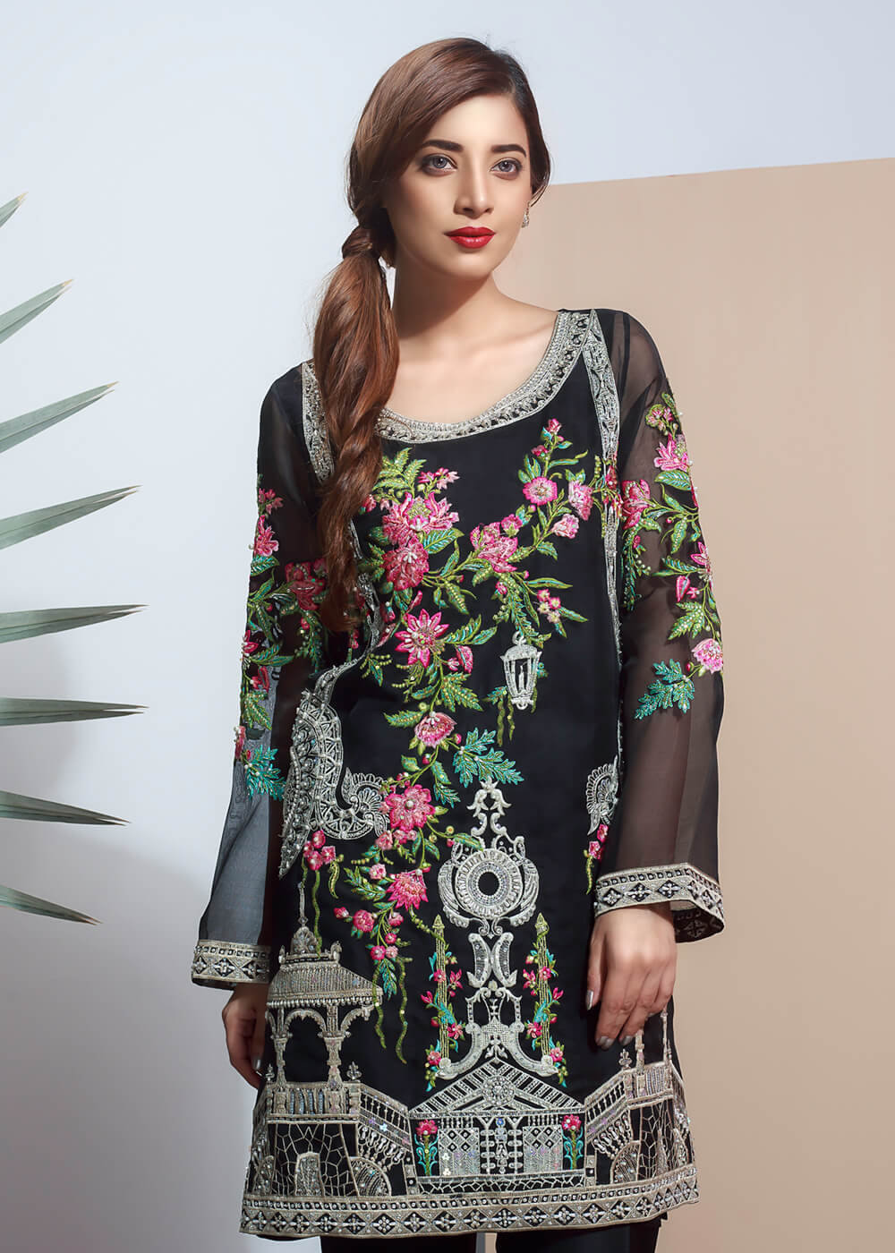 Black Organza shirt with floral embroidery, embellished with pearls, sequins, and crystals.