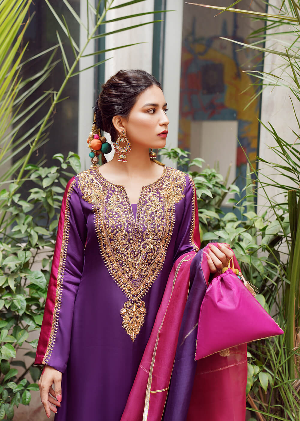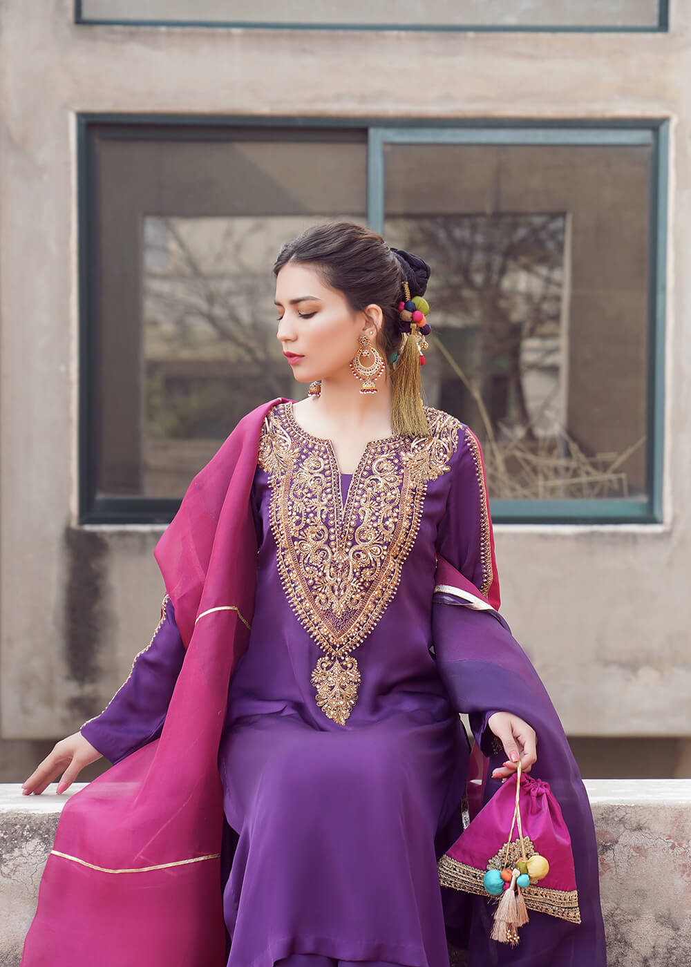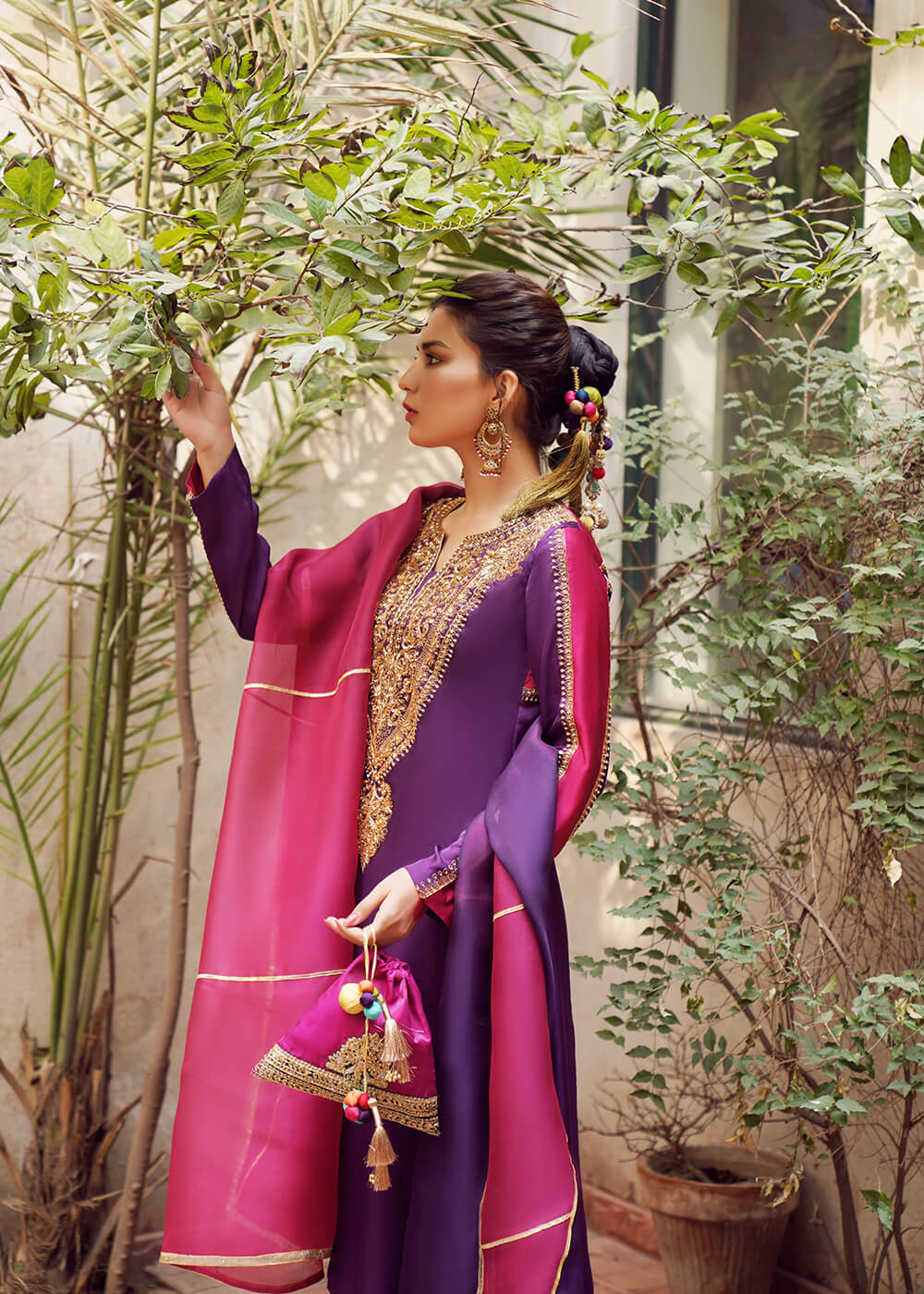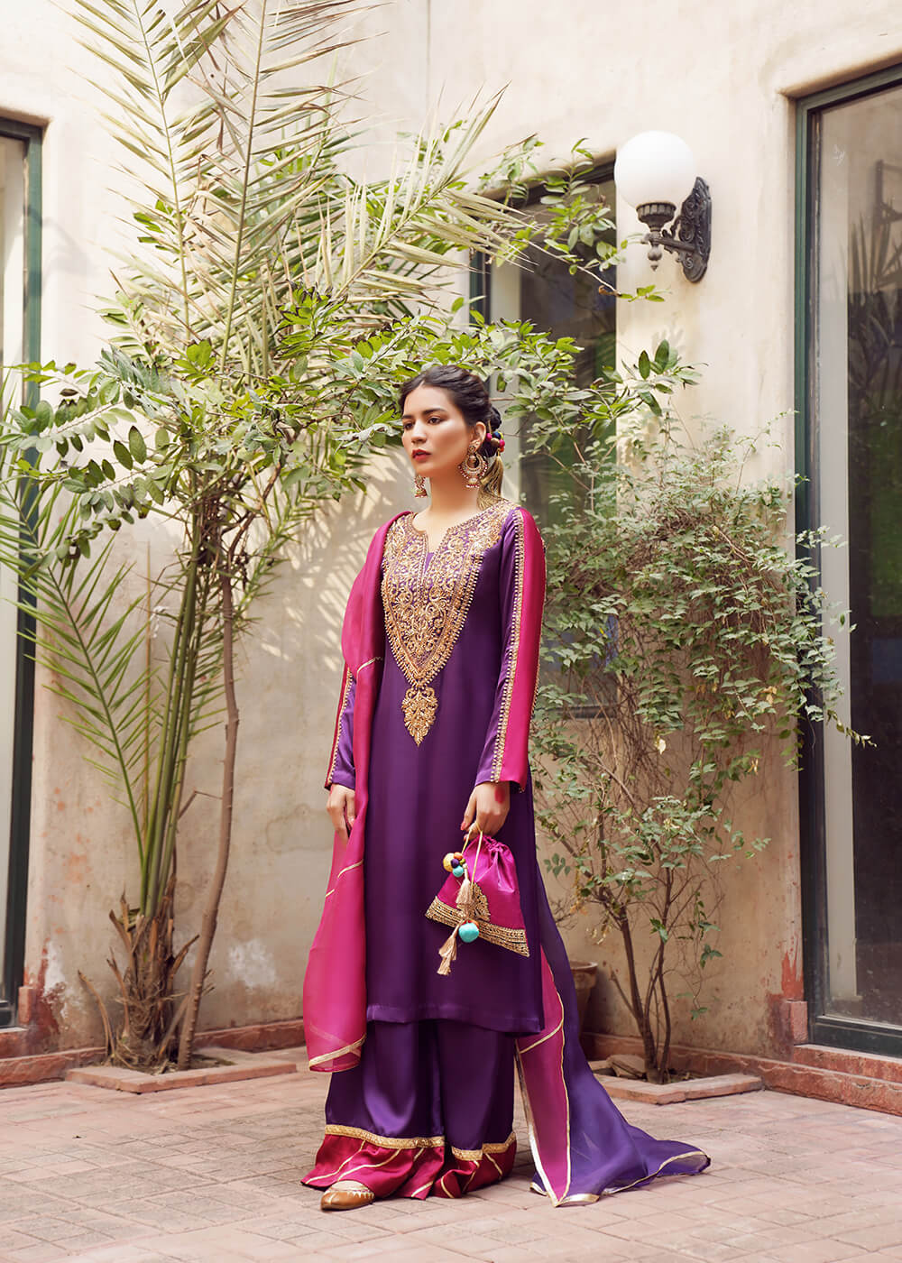 A classically elegant ensemble with a rich color palette, ‘Diba’ features intricate Marori embroidery on neck and sleeves on hues of magenta. Paired with a flared sharara style two tonal pants and an organza dupatta, this classic attire will make you stand out from the crowd.