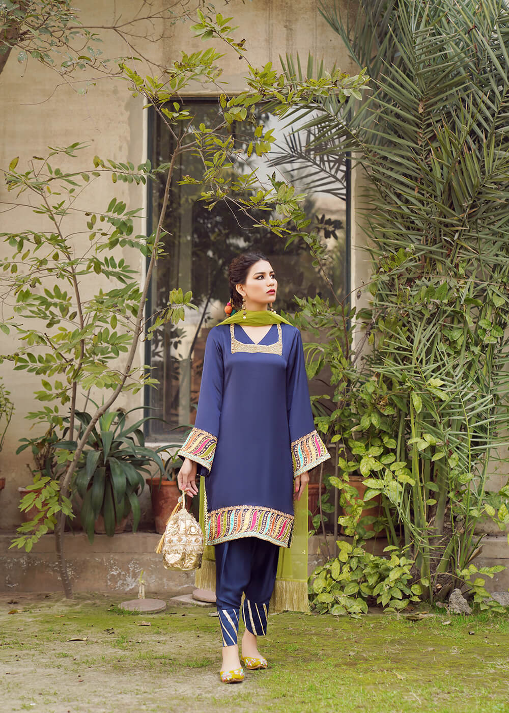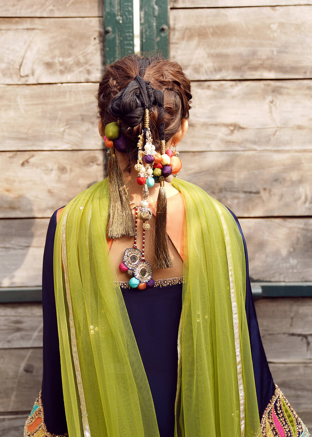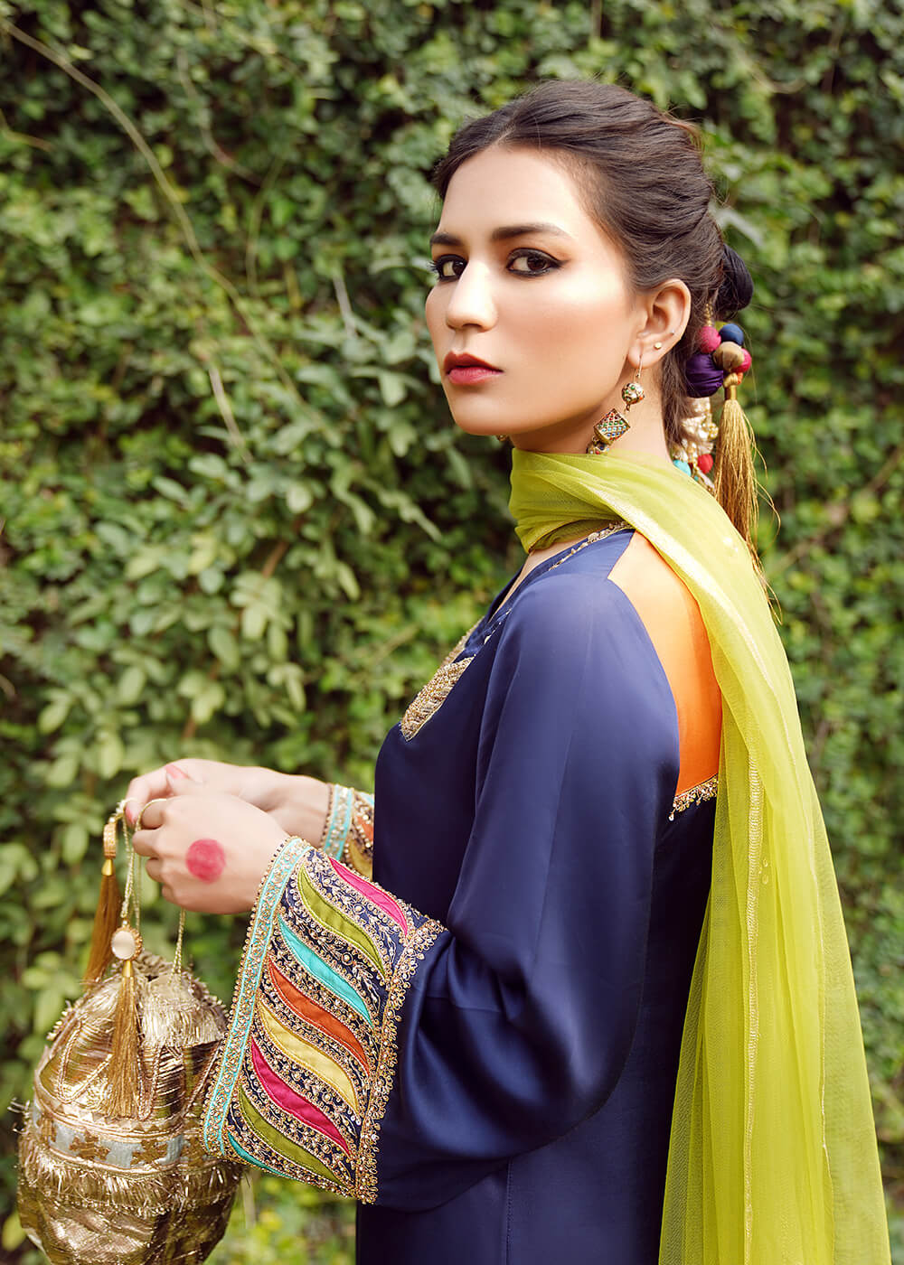A deep blue base adorned with a classic chatta patti concept put together in innovative shapes and sizes, ornamented with marori embroidery on the ghera and sleeves. Paired with a gorgeous contrasting dupatta and beautiful gotta Patti embellished shalwar.