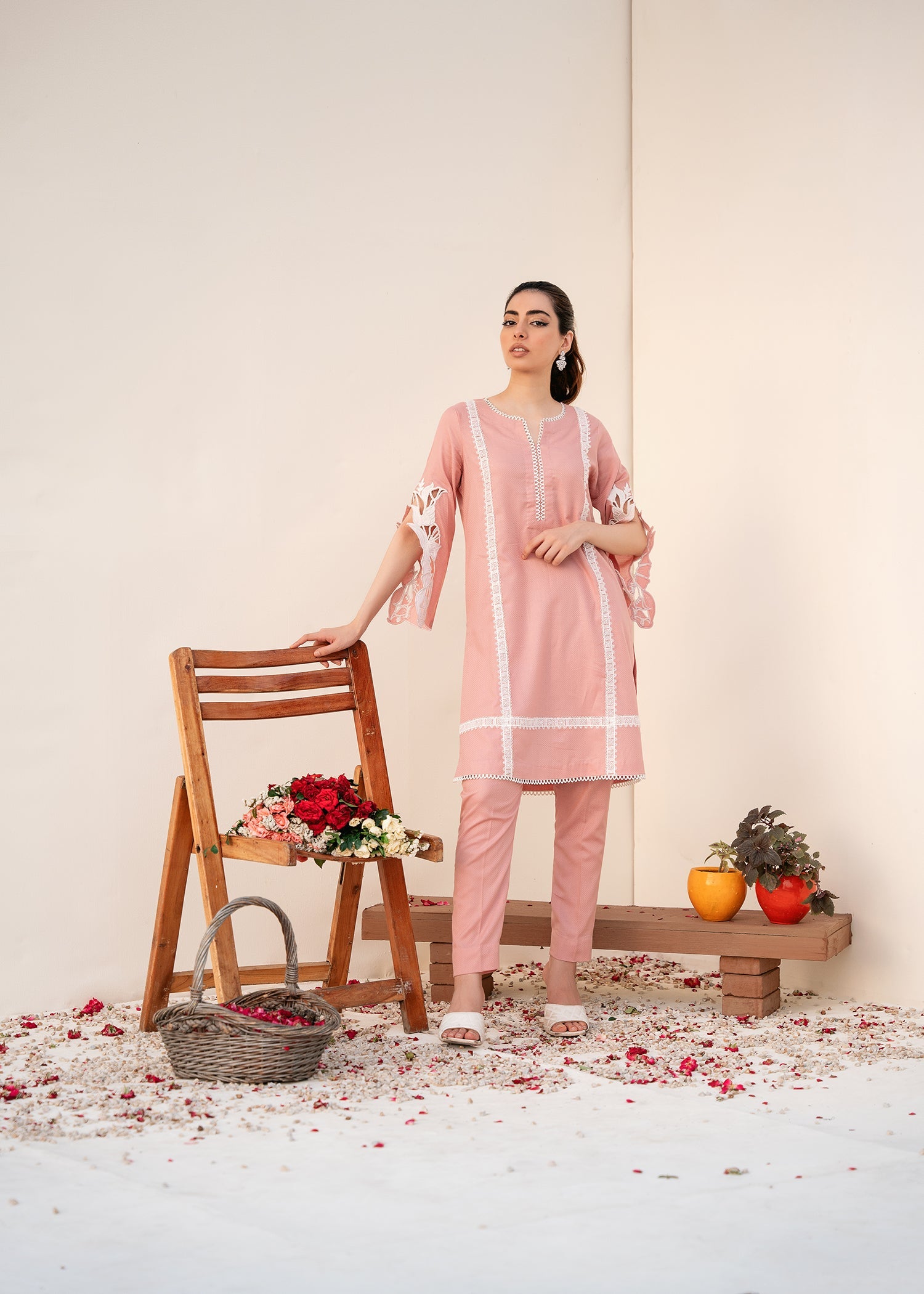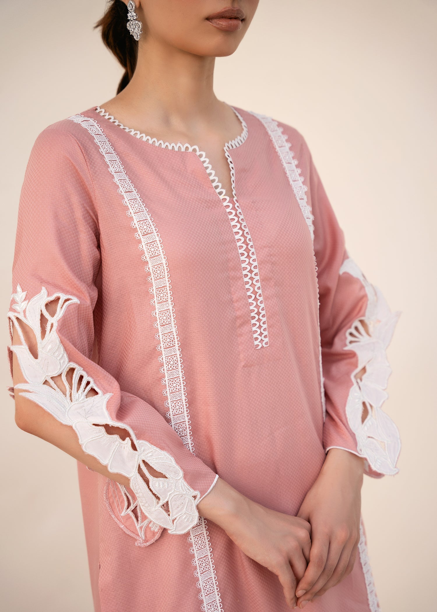 The dress features intricate cutwork embroidery on the sleeves, which adds a contemporary touch to the traditional design. The lace details on the neckline and side panels provide an elegant and feminine accent, elevating the overall aesthetic of the dress.