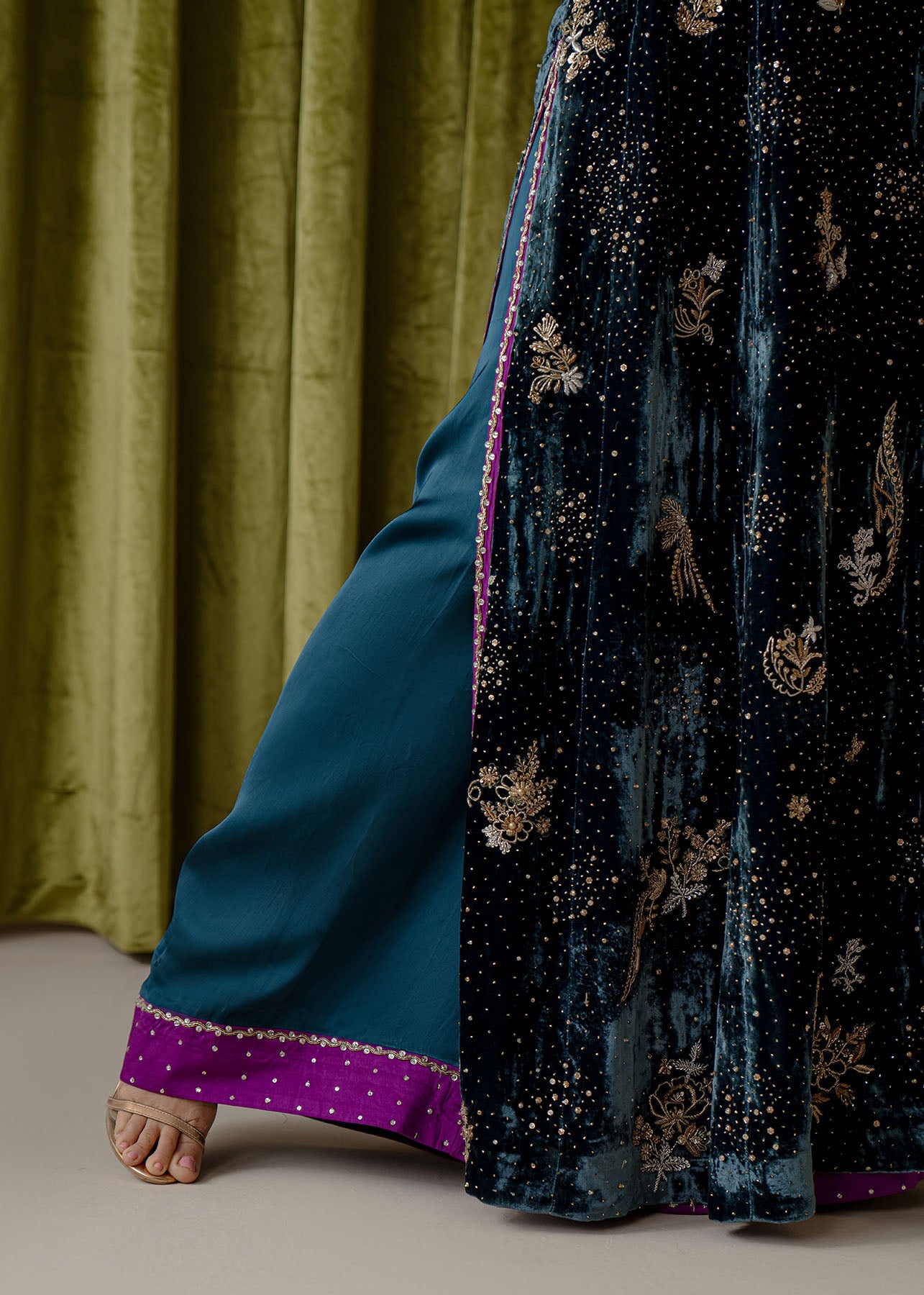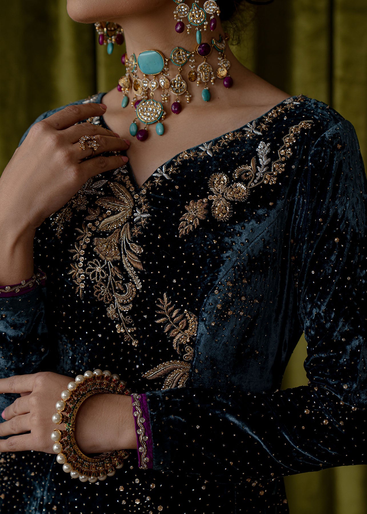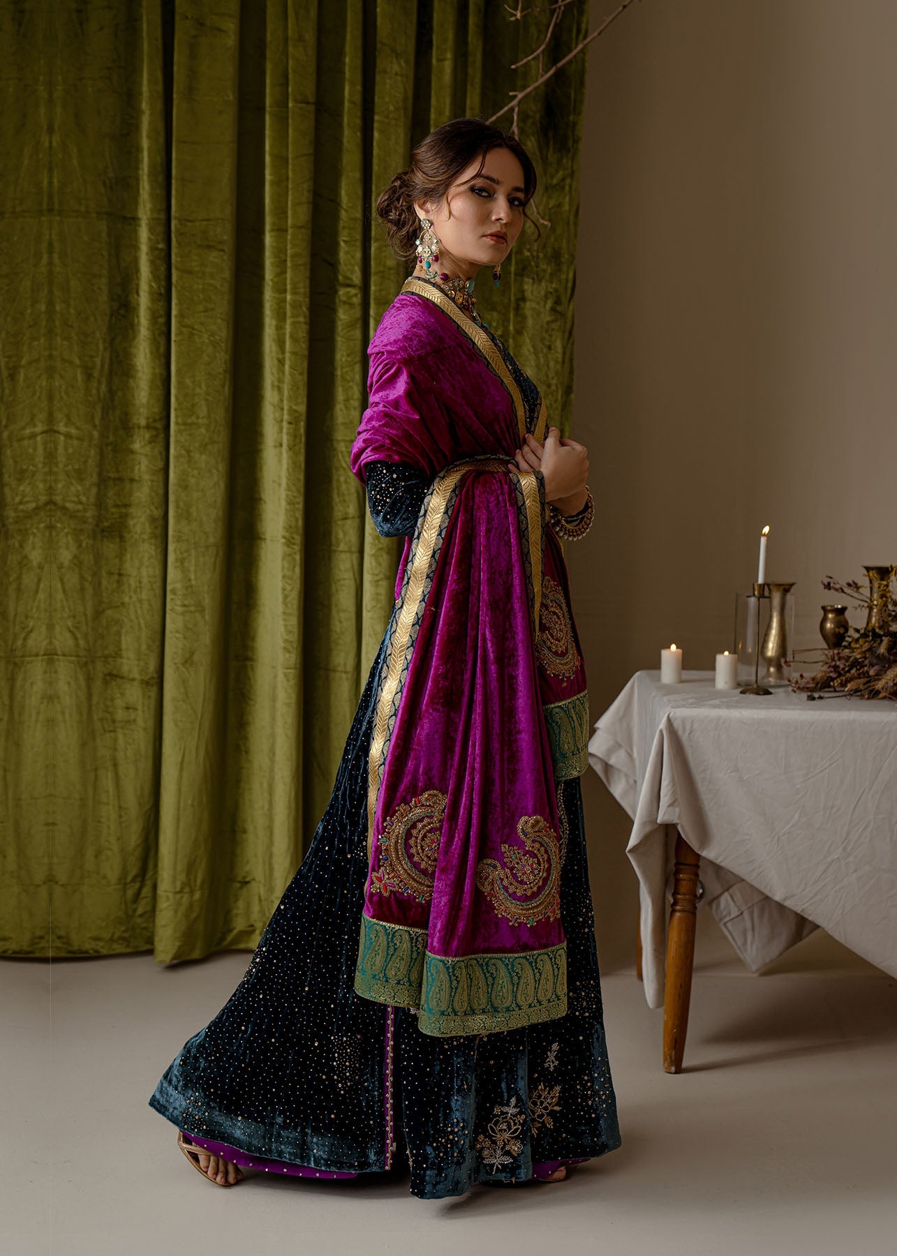 Embrace the spirit of this season's festivities with this long flaired velvet shirt rendered with delicate zardoze work. Paired with embroided silk trousers and an contrasting embroided valvet dupatta finished with banarasi borders and gotta detailing.