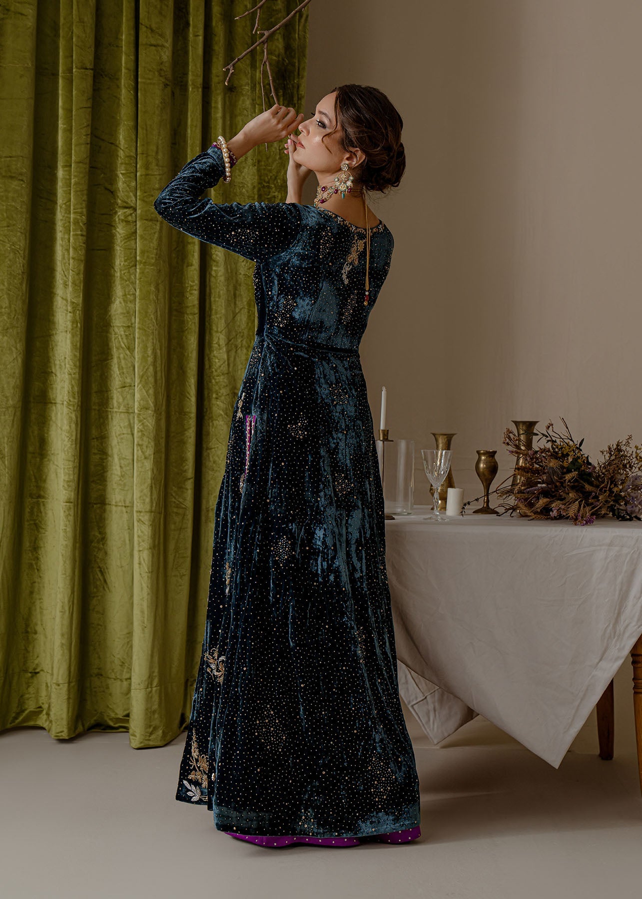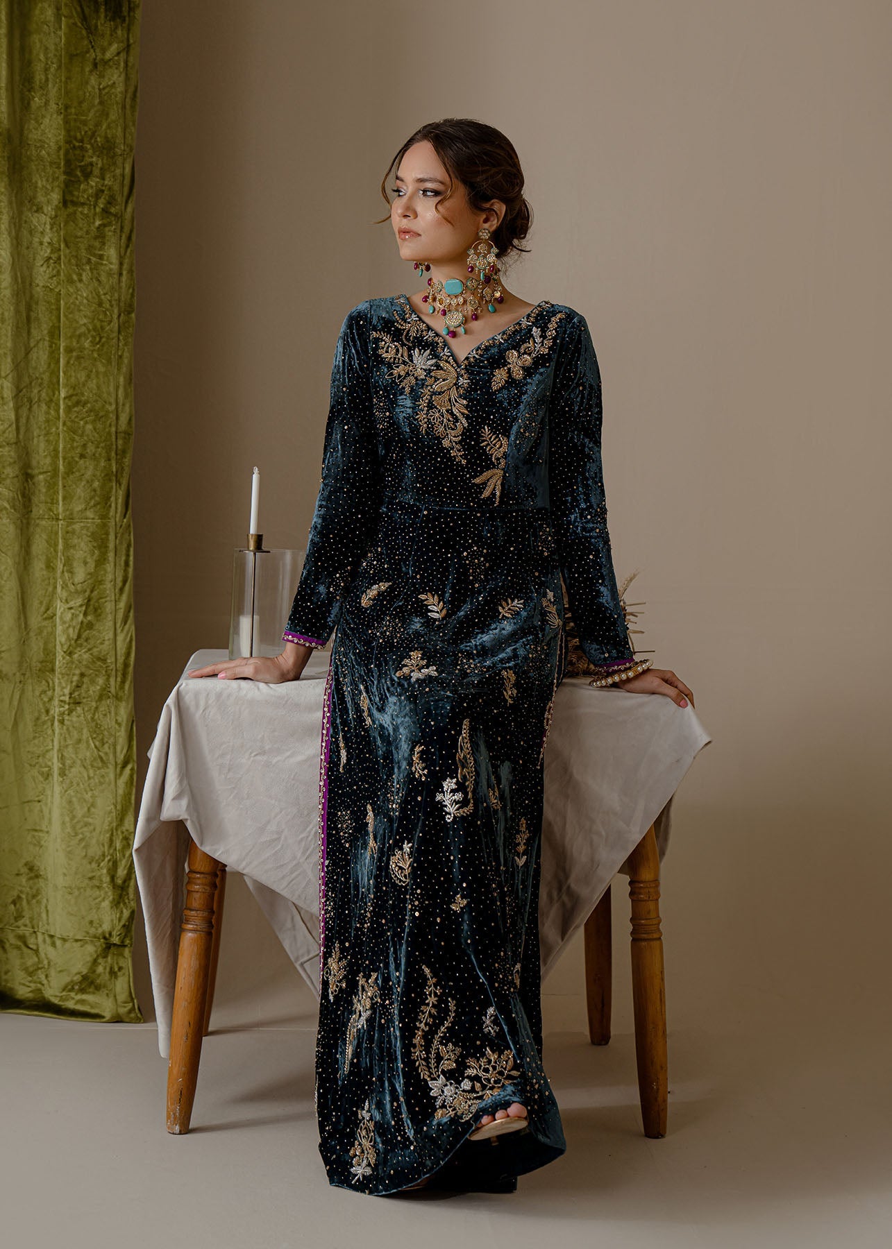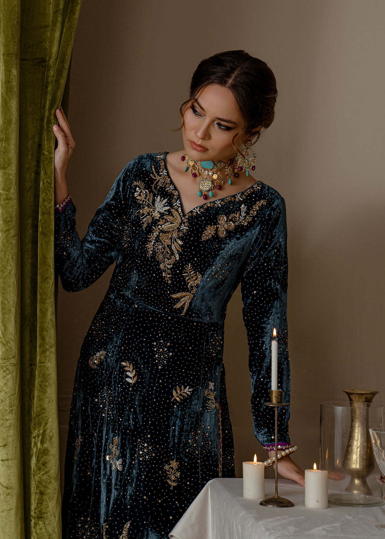 Embrace the spirit of this season's festivities with this long flaired velvet shirt rendered with delicate zardoze work. Paired with embroided silk trousers and an contrasting embroided valvet dupatta finished with banarasi borders and gotta detailing.