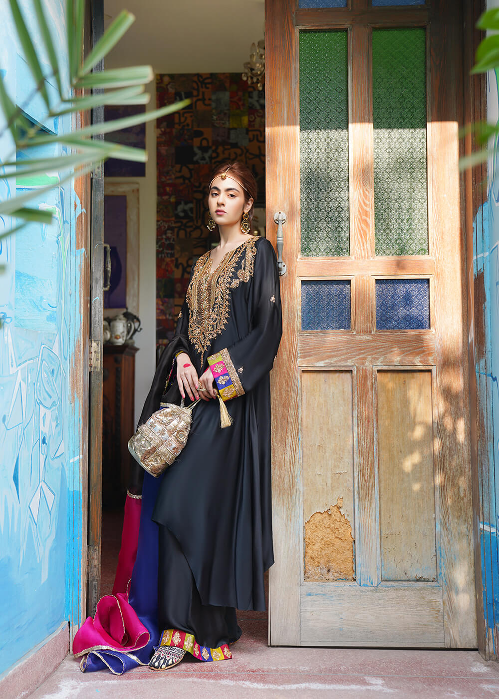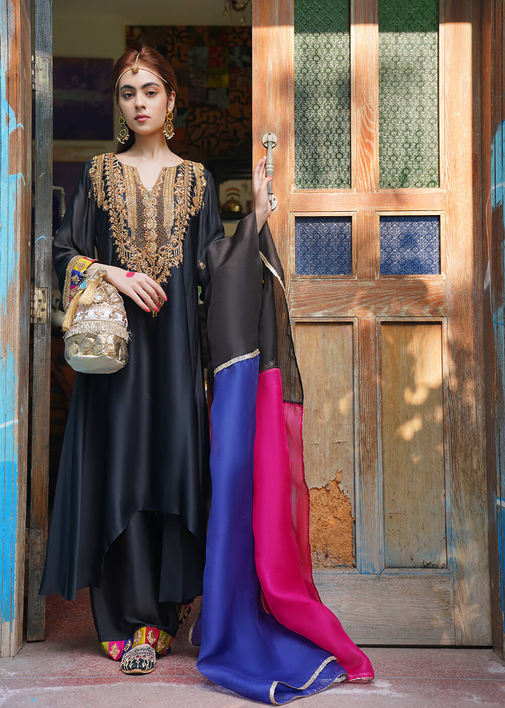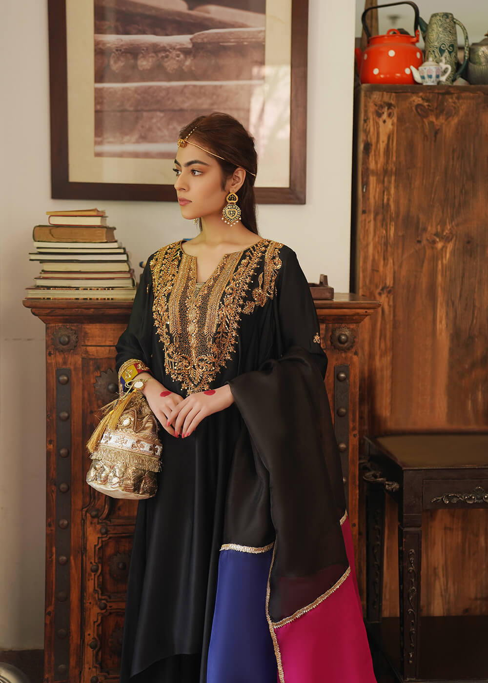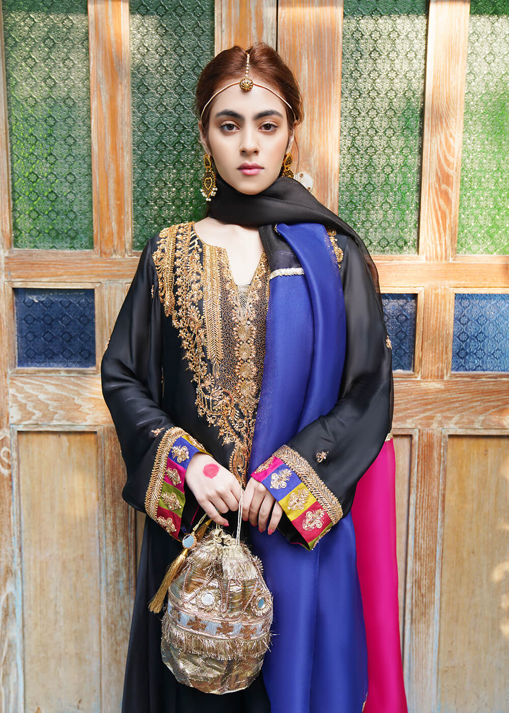 Laila, synonymous of “daughter of the night” features a black ensemble with delicate marori embroidery on the neck with voluminous ghera and beautiful chatta patti and marori detailing on sleeves and pants. Paired with a three-tonal gotta dupatta, this statement design is definitely going to turn heads this season.