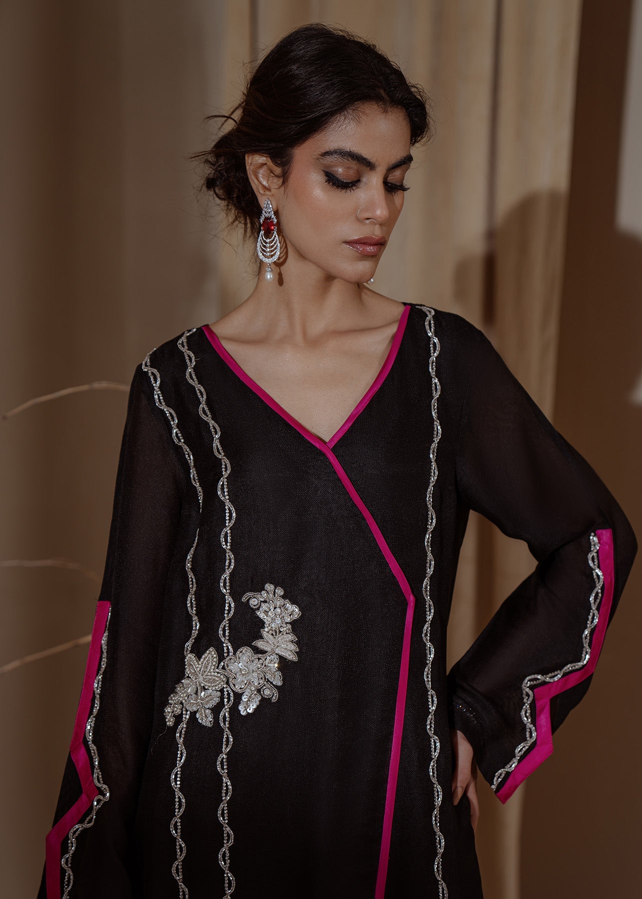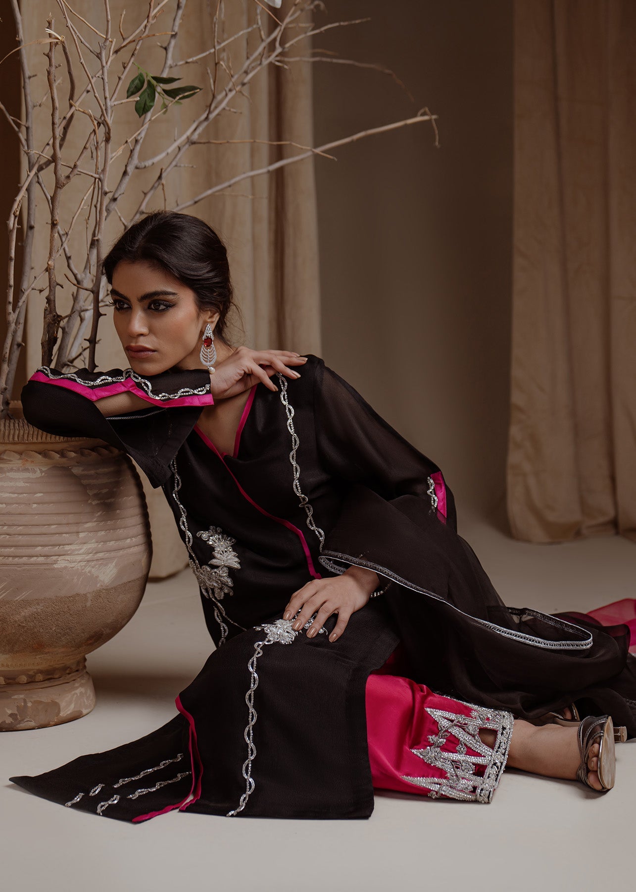 Adorn yourself in this black silk net A-symetric shirt embellished with silver zardozi work. a contrasting silk izaar with zardoze and cutwork embellishments complements the look.