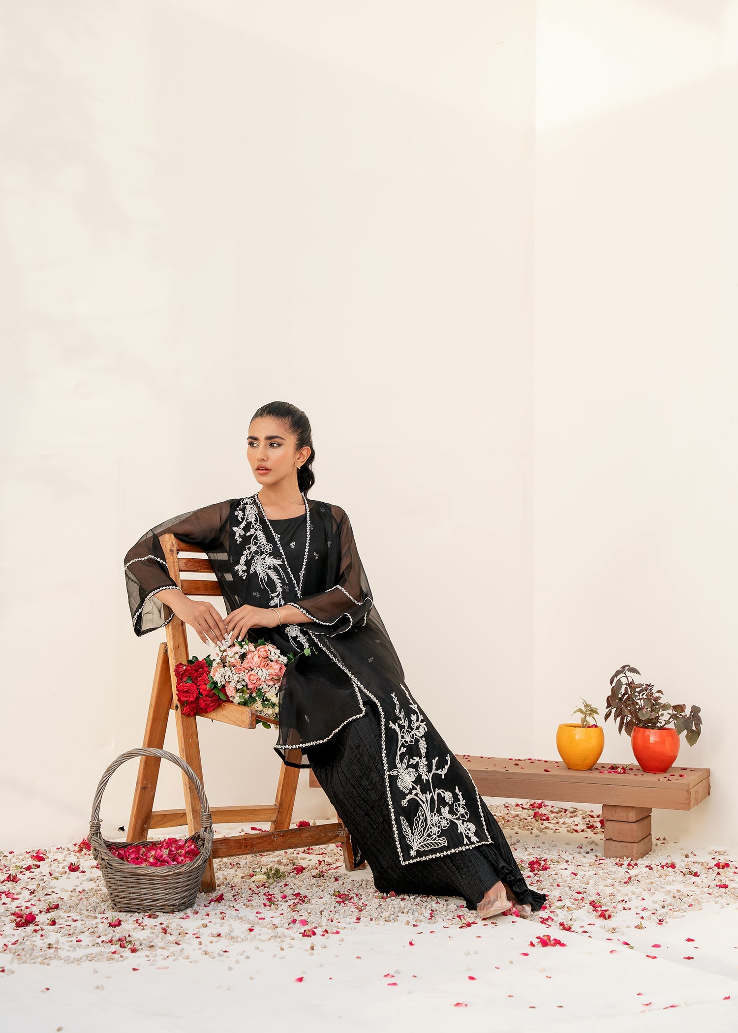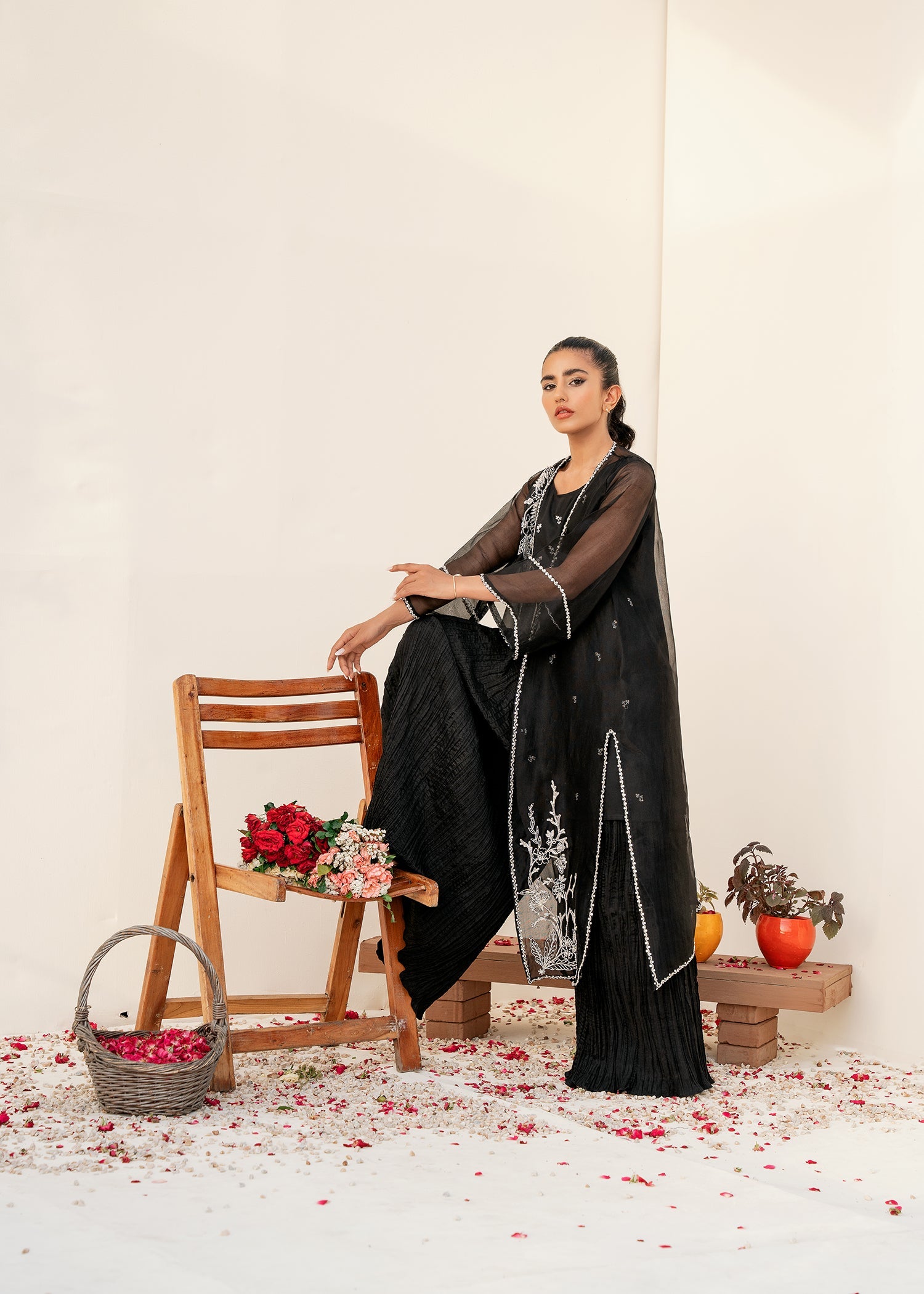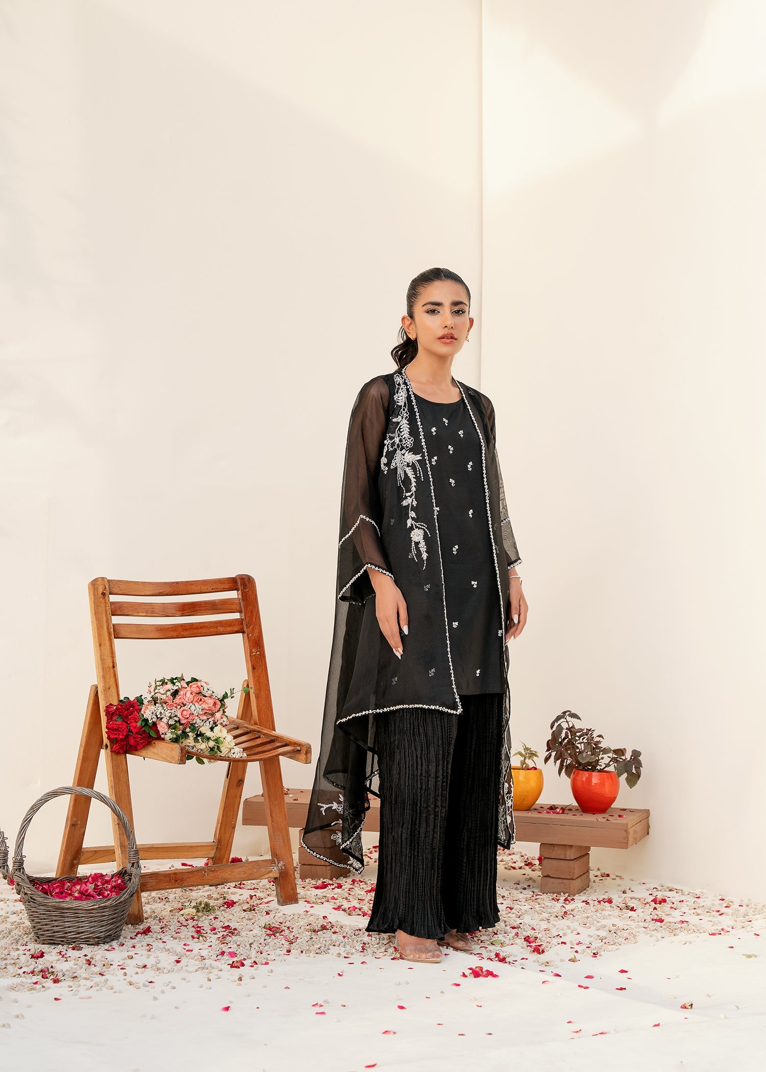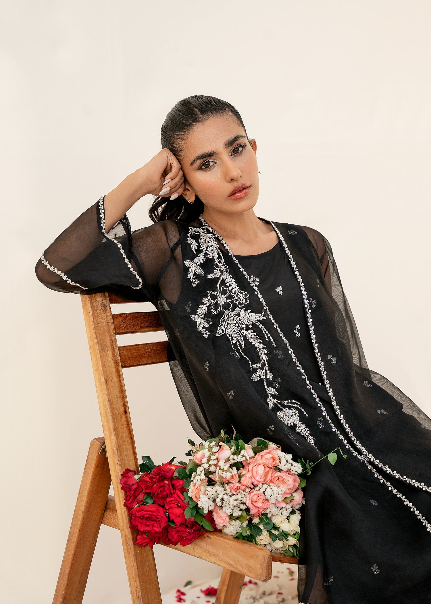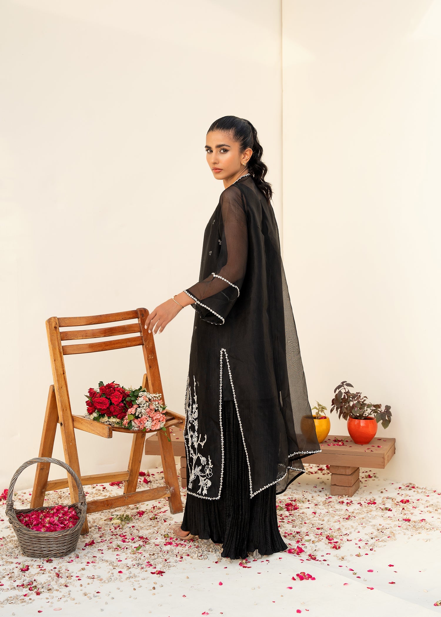 Meral, a front open A-symmetric organza shirt gives a sheer and delicate appearance, which can create a sense of sophistication and glamour. The hand embroidery on the shirt adds intricate details and enhances the overall design. The embellished under shirt provides an additional layer of detail featuring beadwork, sequins and crystal embellishments.