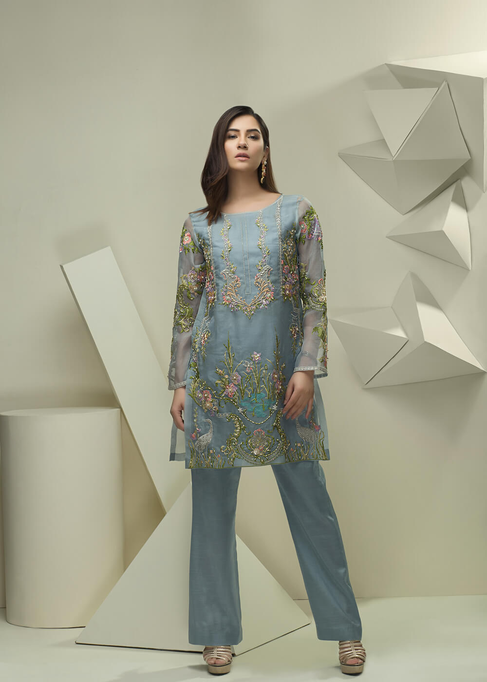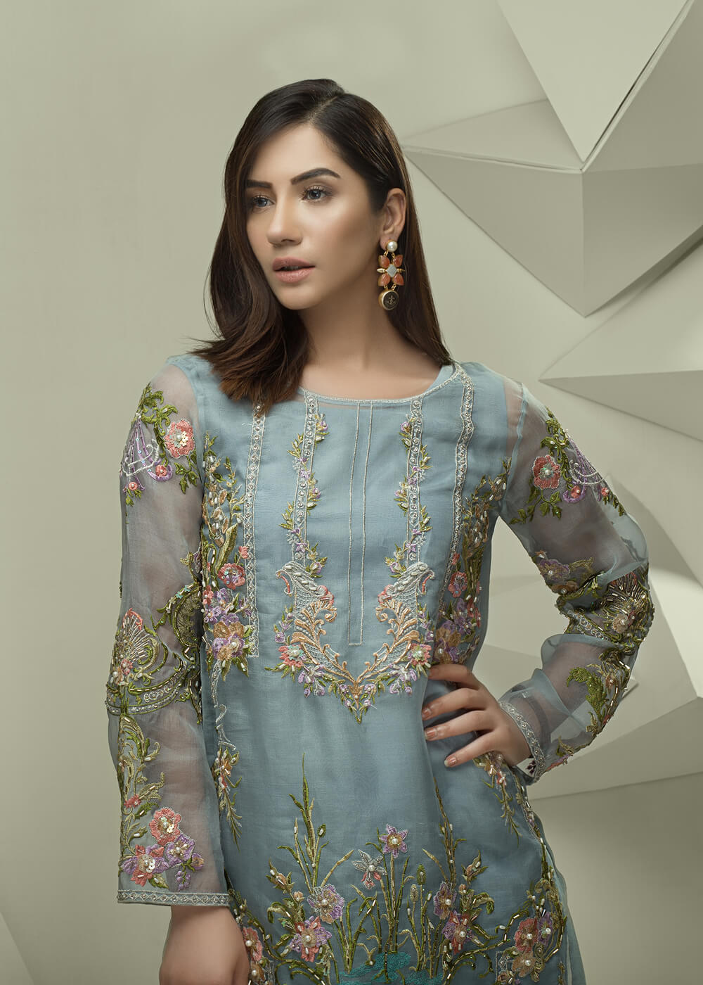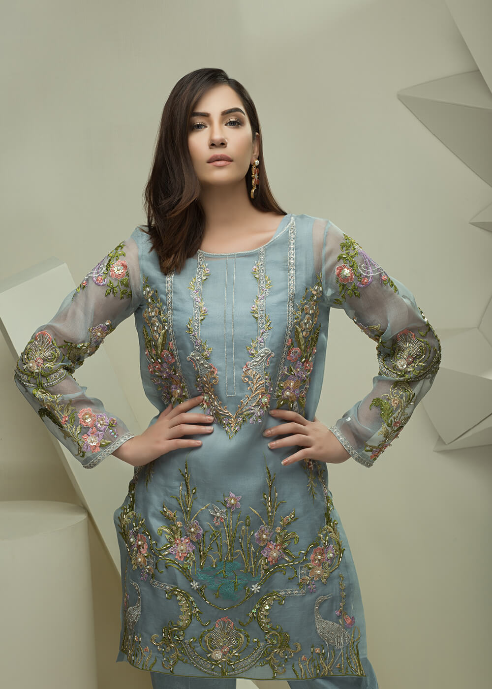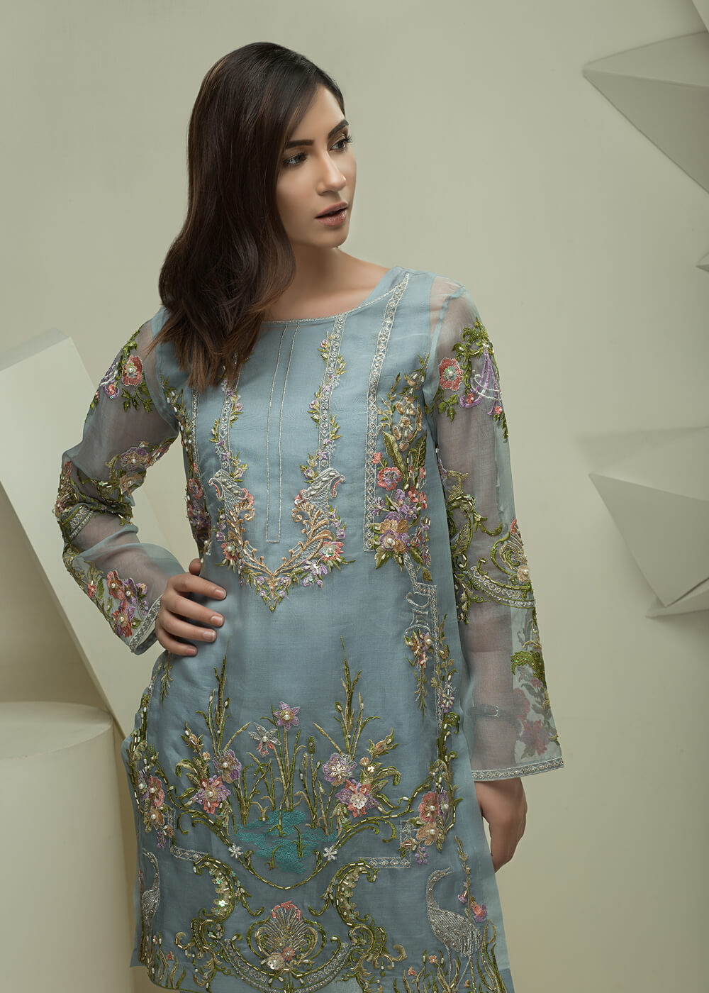 Hand embroidered organza shirt featuring elaborate handwork along the neckline. In addition to that, the handwork runs along the hemline and sleeve as well. The floral patterns on the shirt are adorned with crystals, pearls and sequins. The outfit is paired with bell bottoms. An outfit that’ll make you stand out in a crowd!