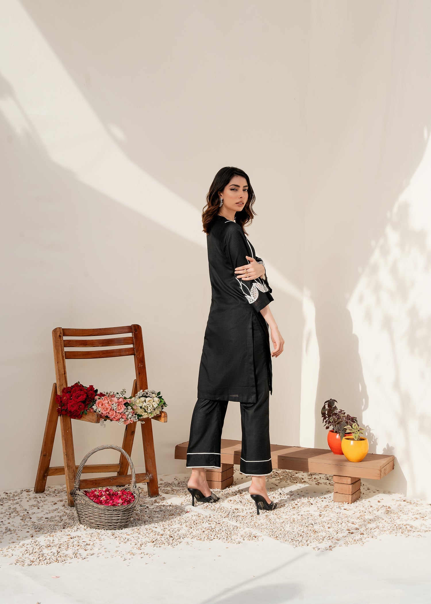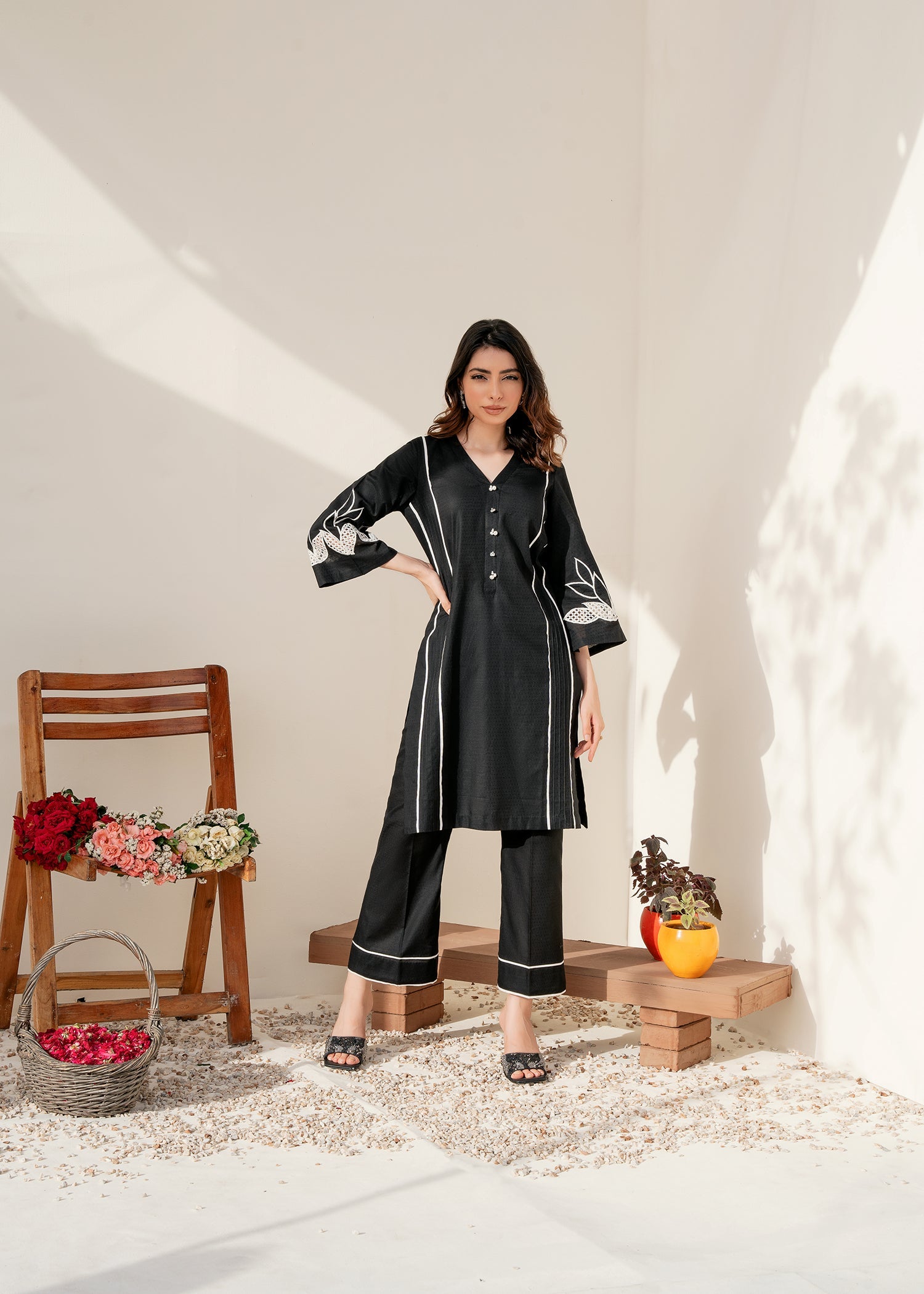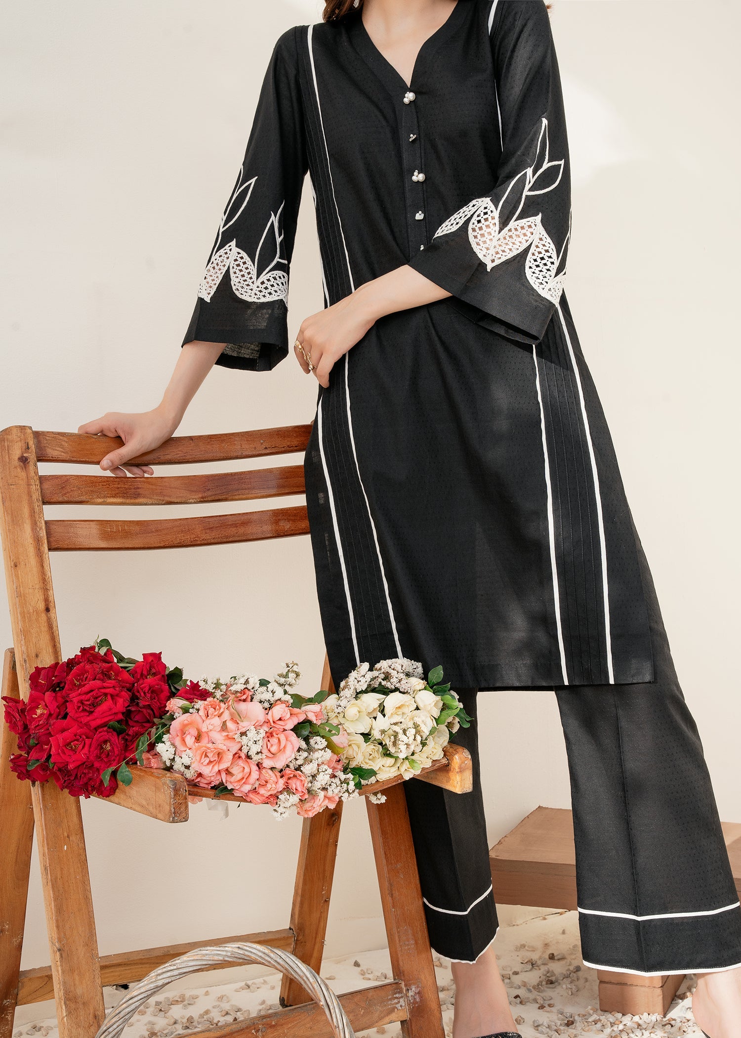 The Black color on the lawn shirt is enhanced with bold and edgy embroidery on the sleeves, creating a striking visual contrast against the black fabric, making it stand out.