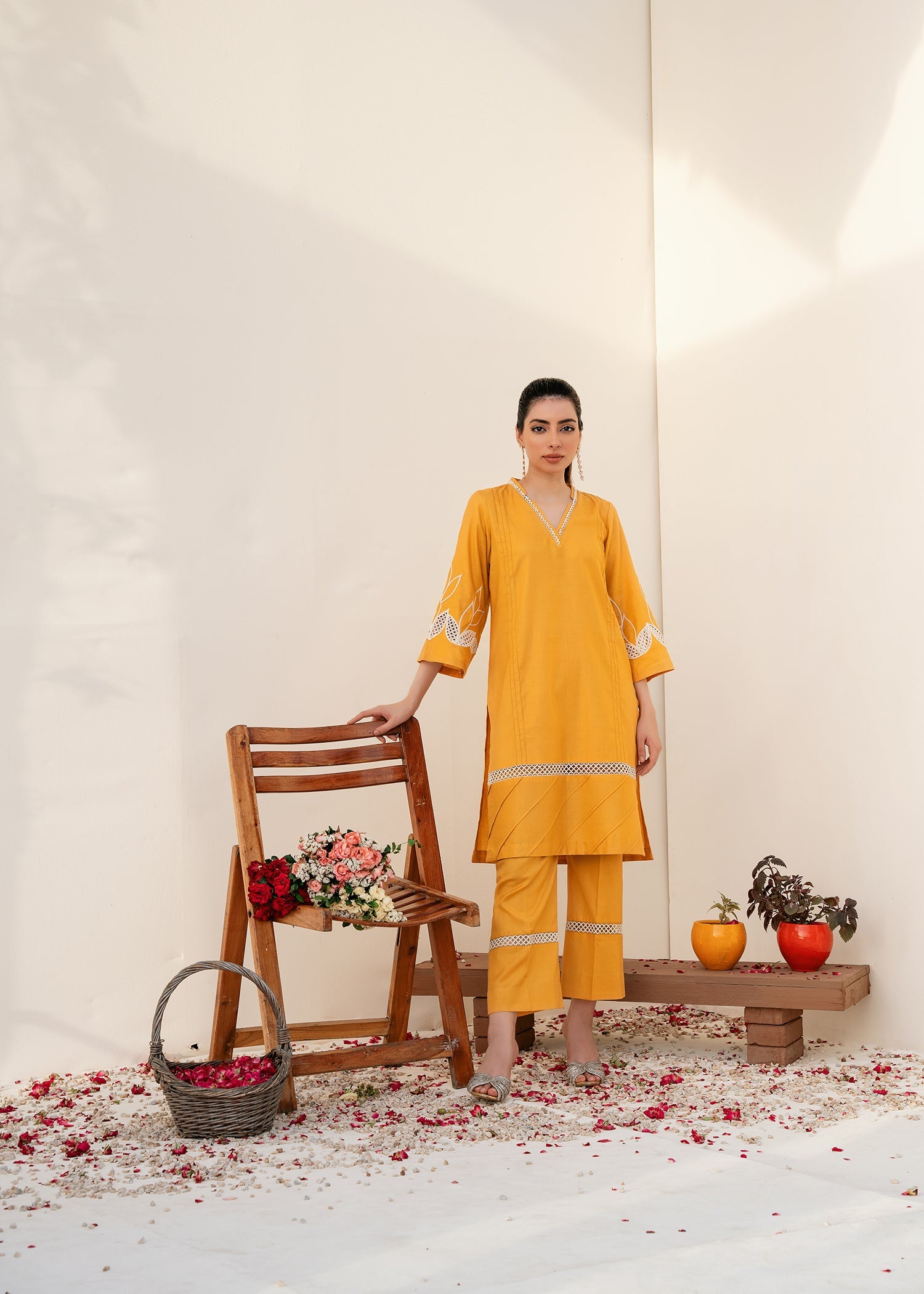 To complete the ensemble, the shirt is paired with matching mustered pants with piping details similar to the ones on the shirt, creating a cohesive and coordinated look.