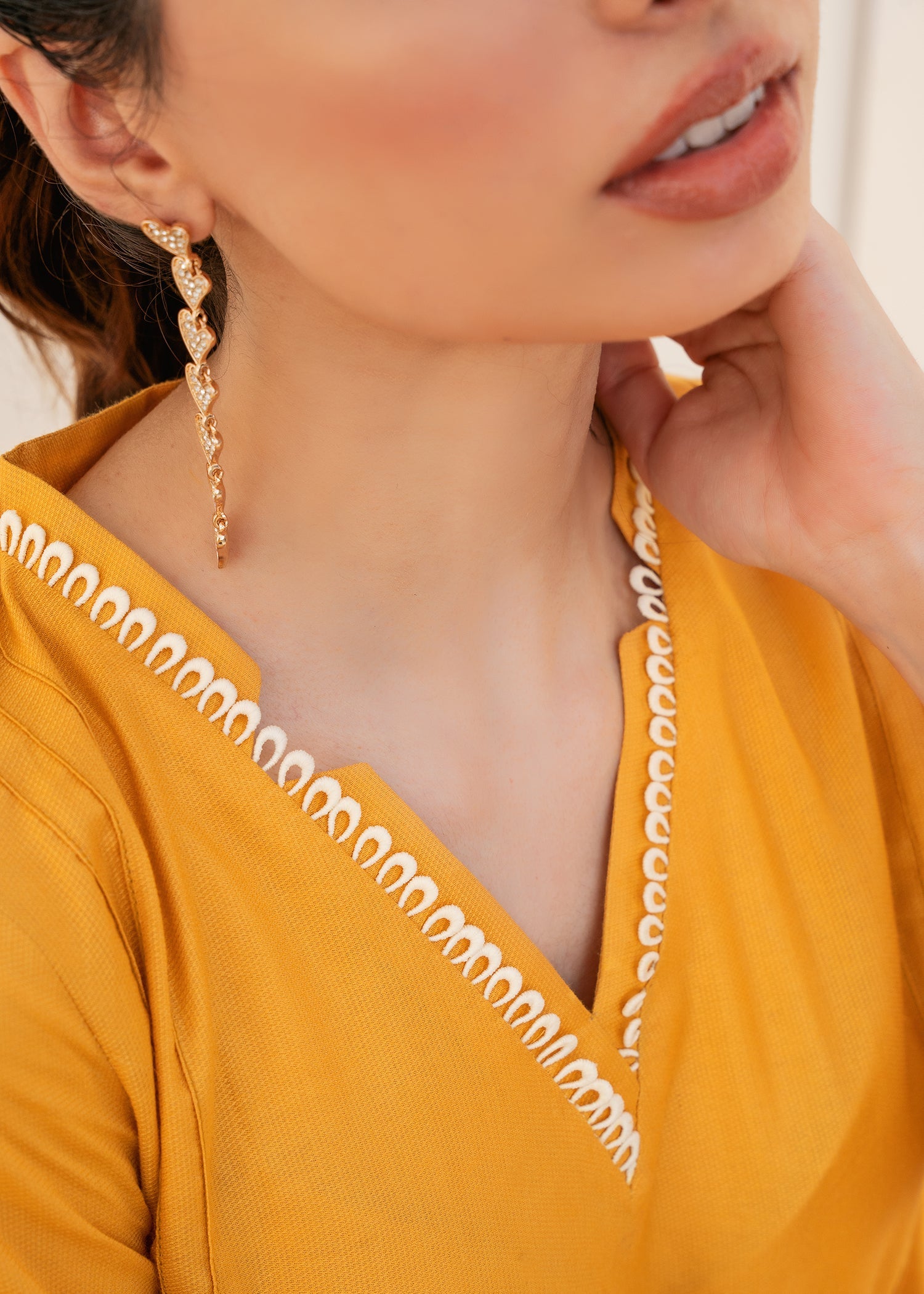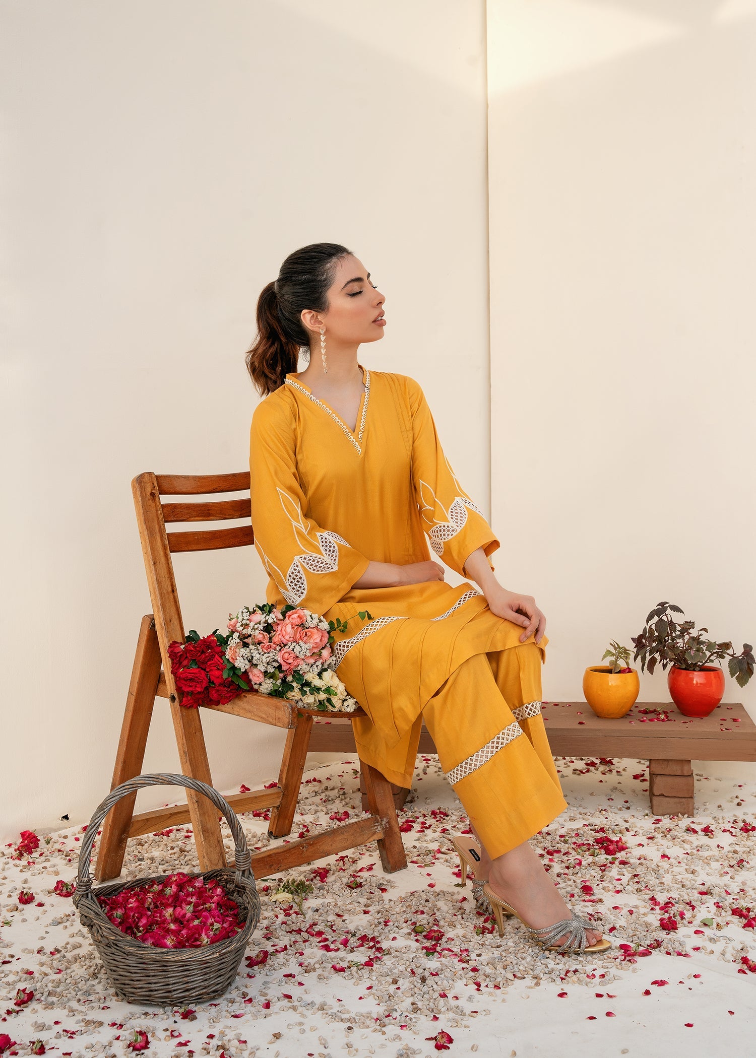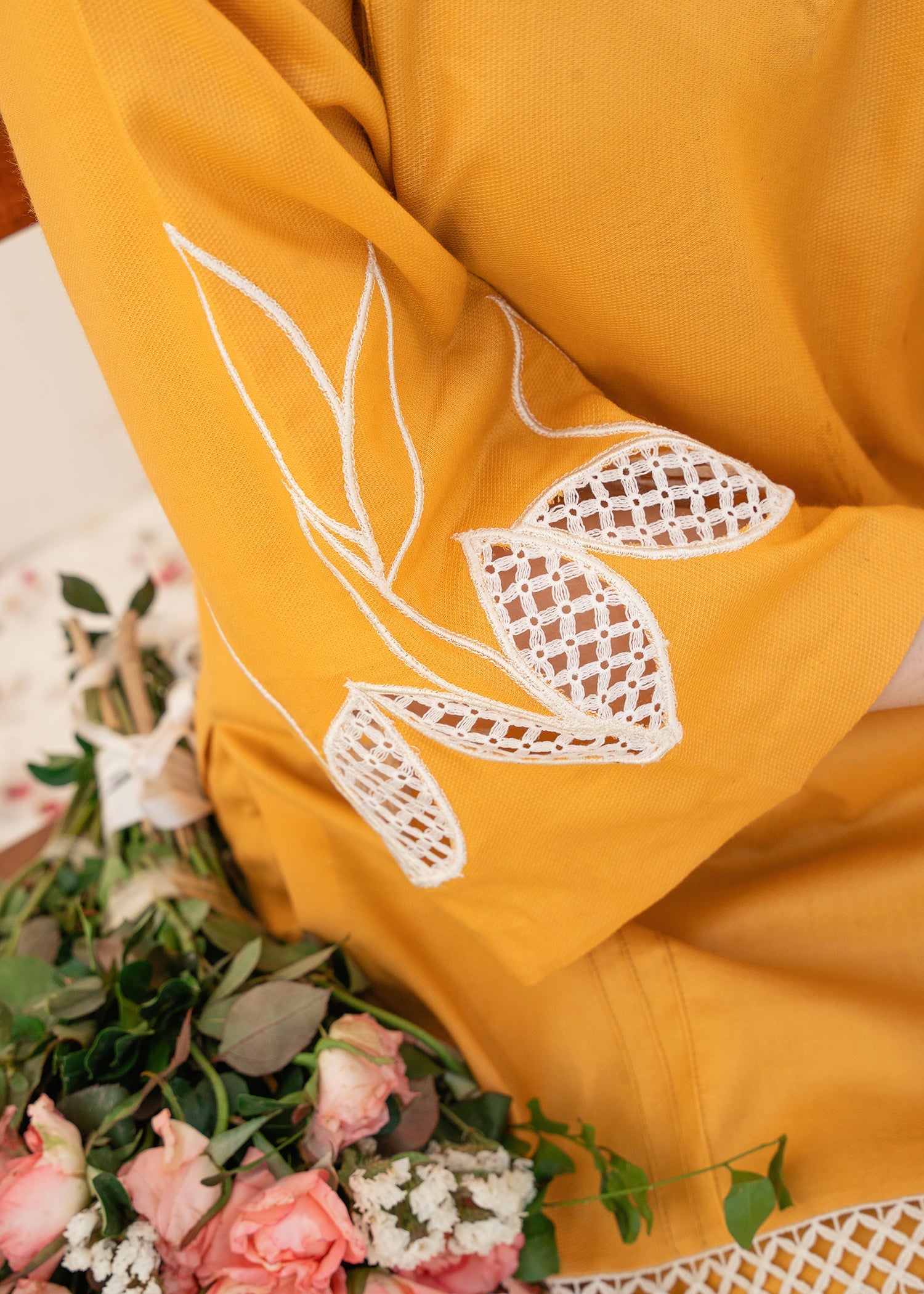 The mustered color on the lawn shirt is enhanced with bold and edgy embroidery on the sleeves, creating a striking visual contrast against the black fabric, making it stand out.