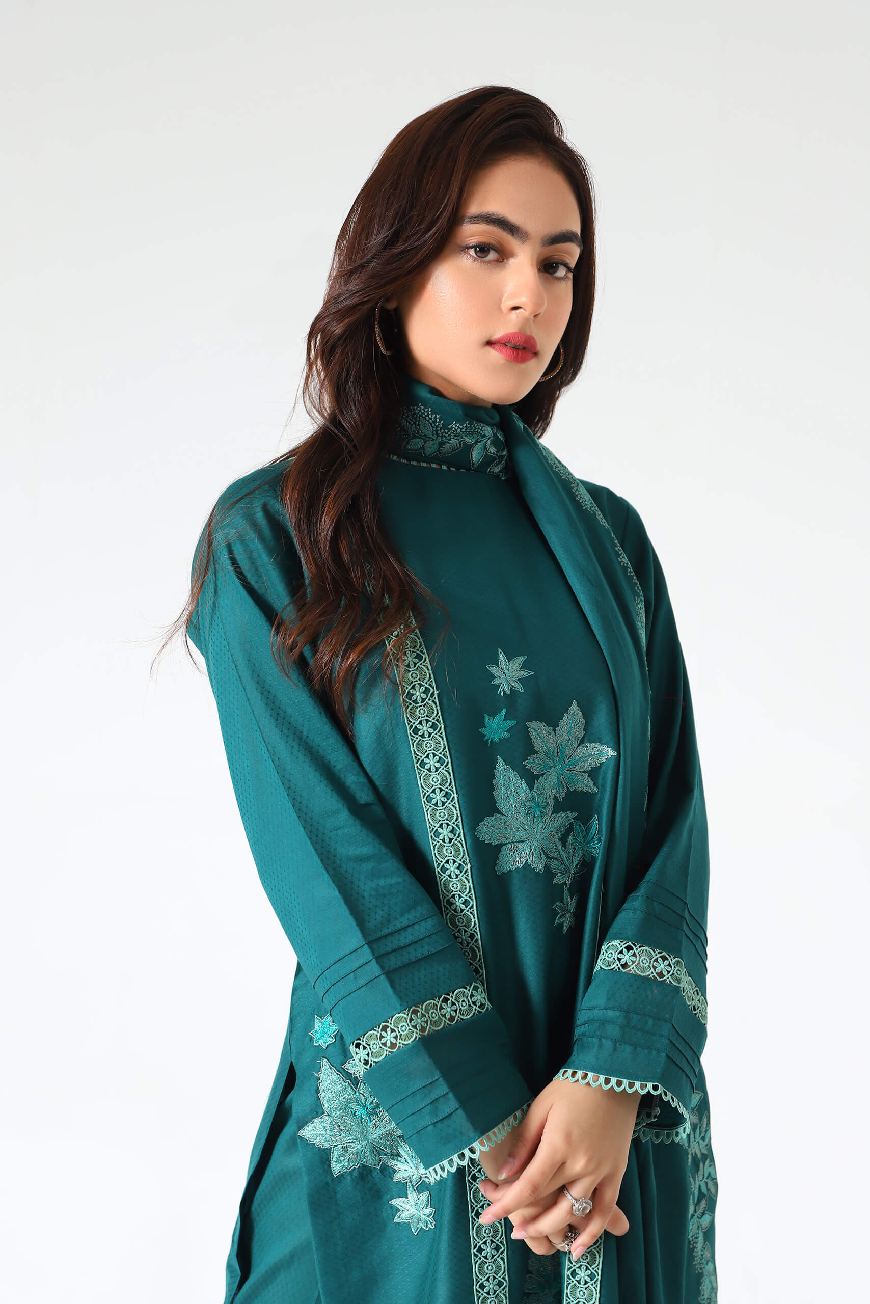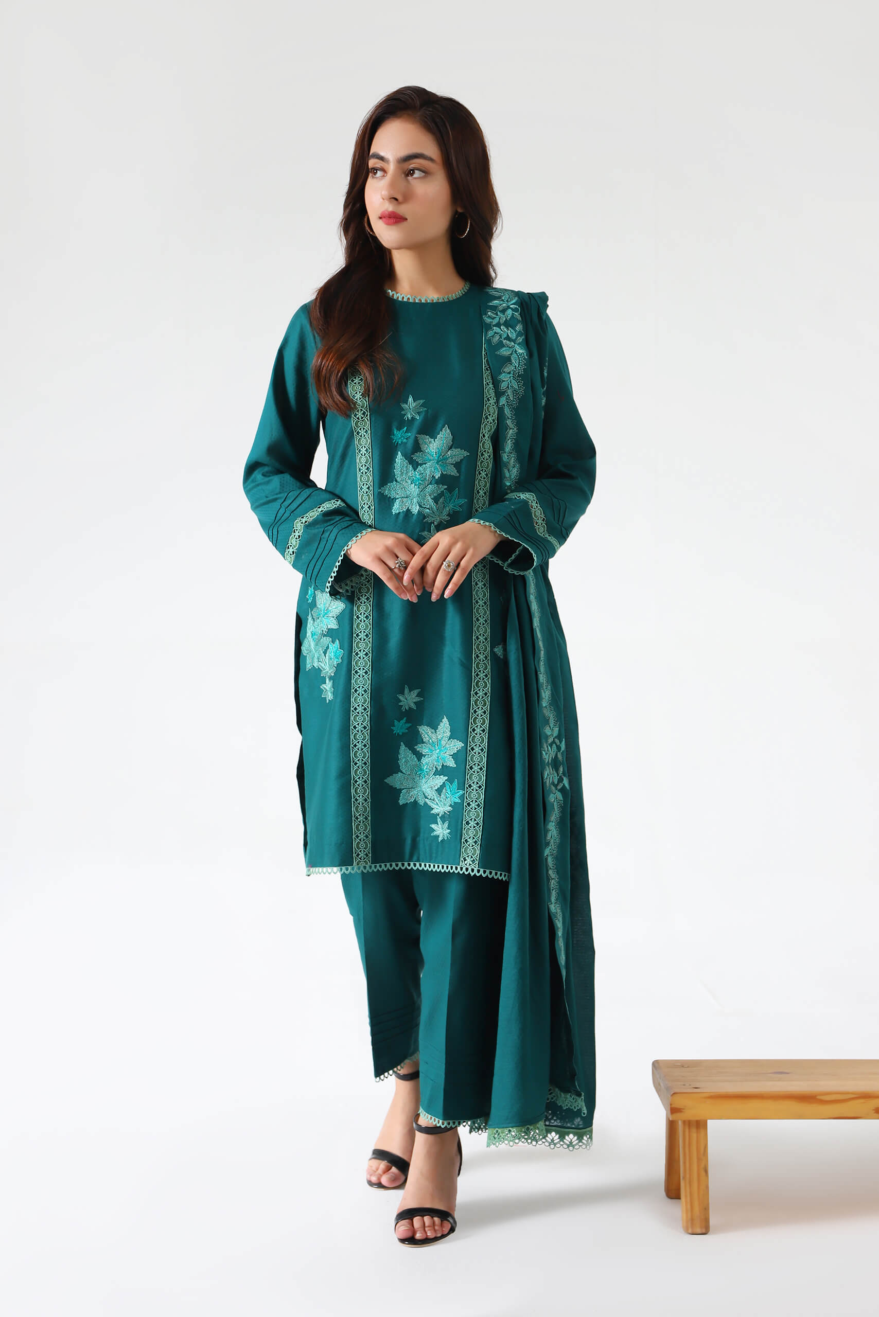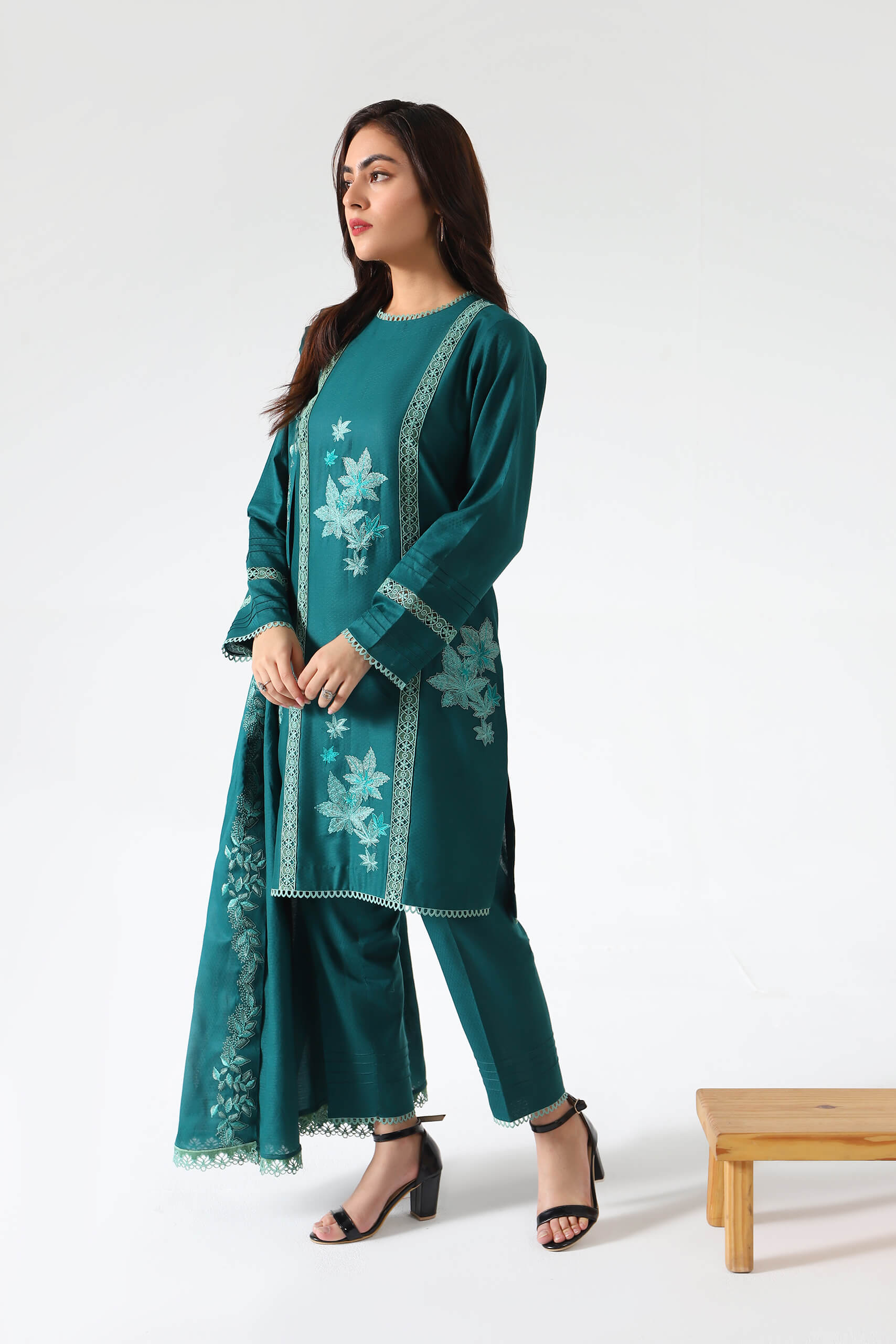 A teal shade on lawn is rendered with different shades of teal embroidery. The lace details on sleeve and front of a shirt just. A matching teal embroided duppata with lace at the bottom paired with corded pants make this dress a perfect option for the evening wear.
