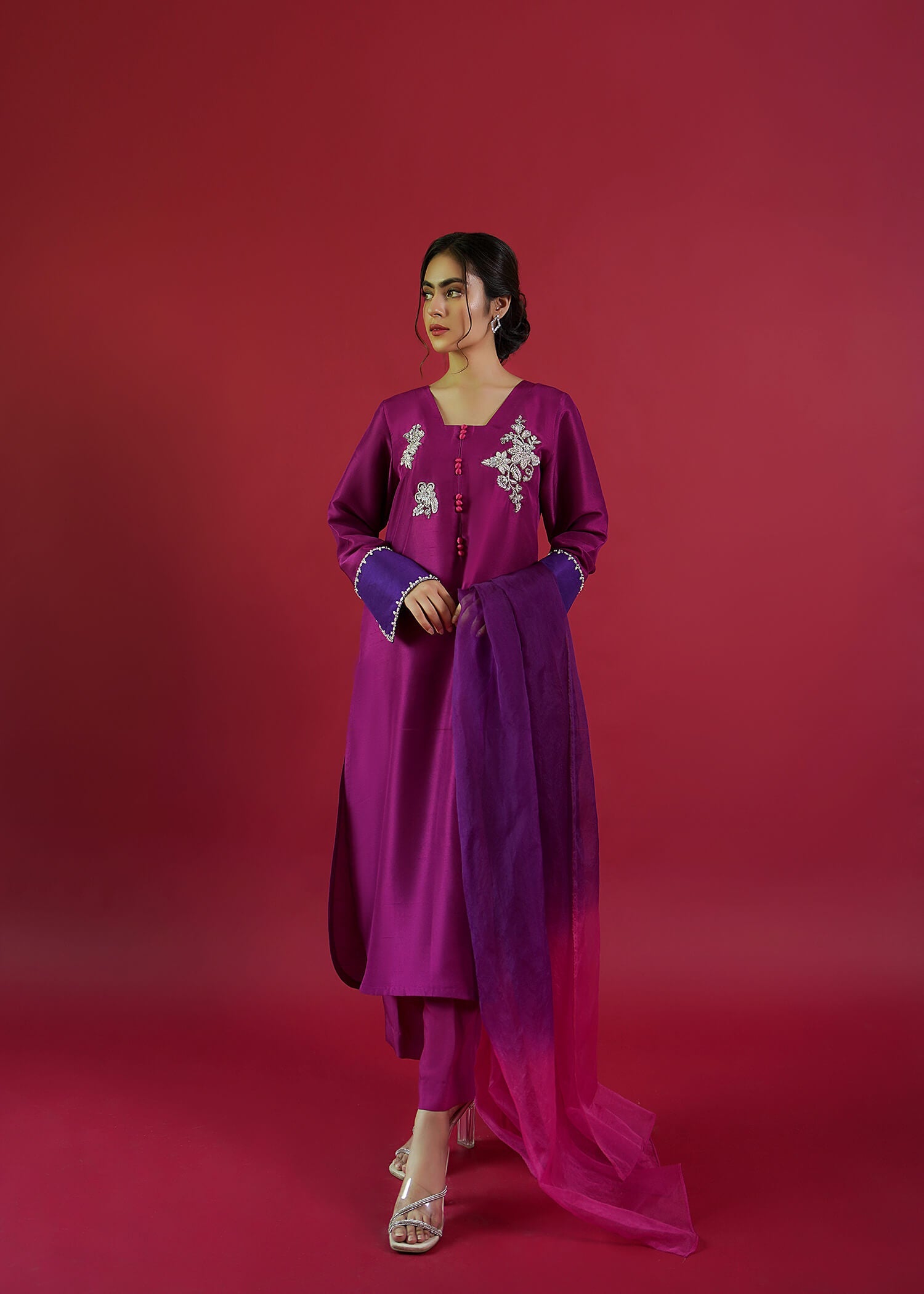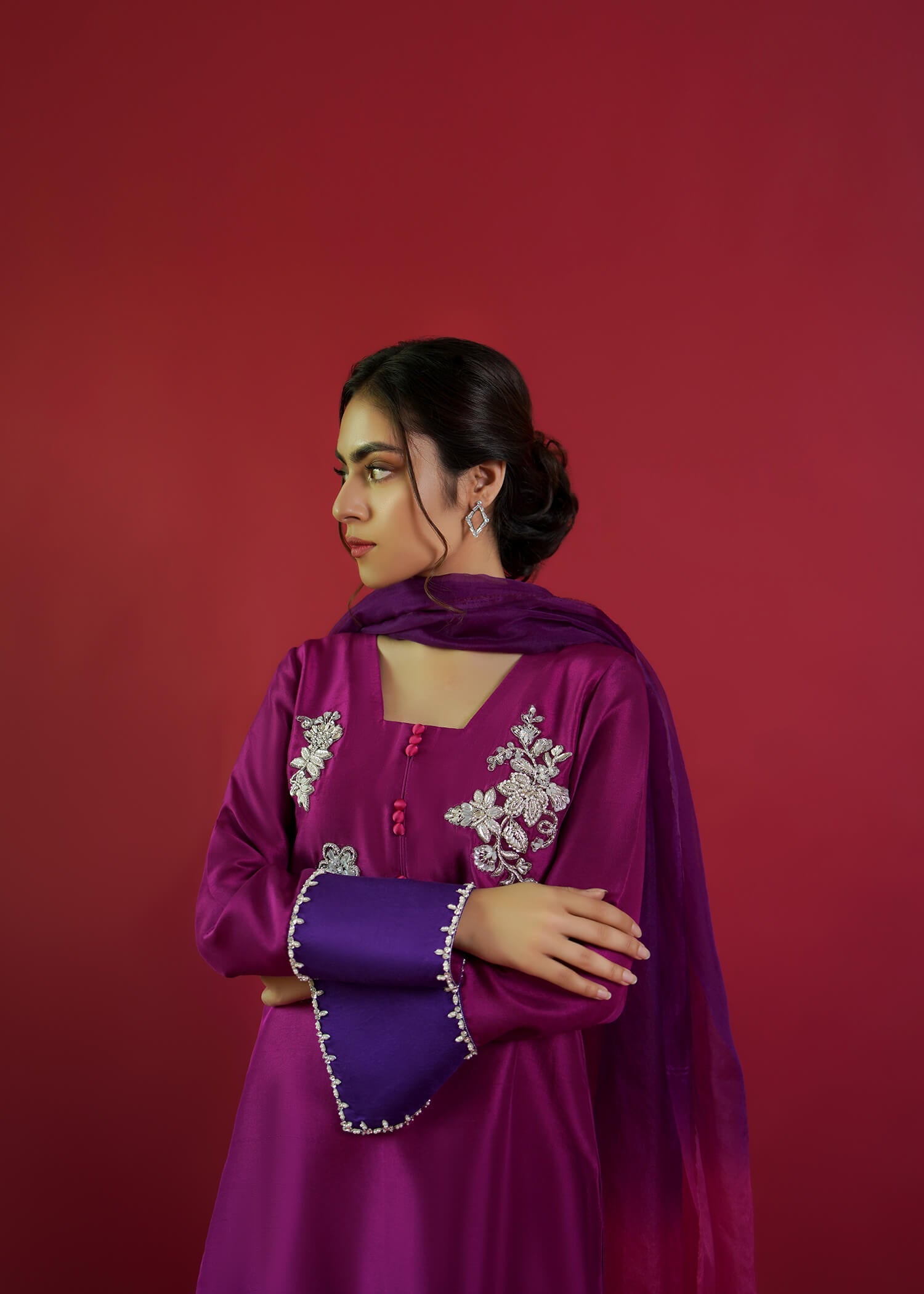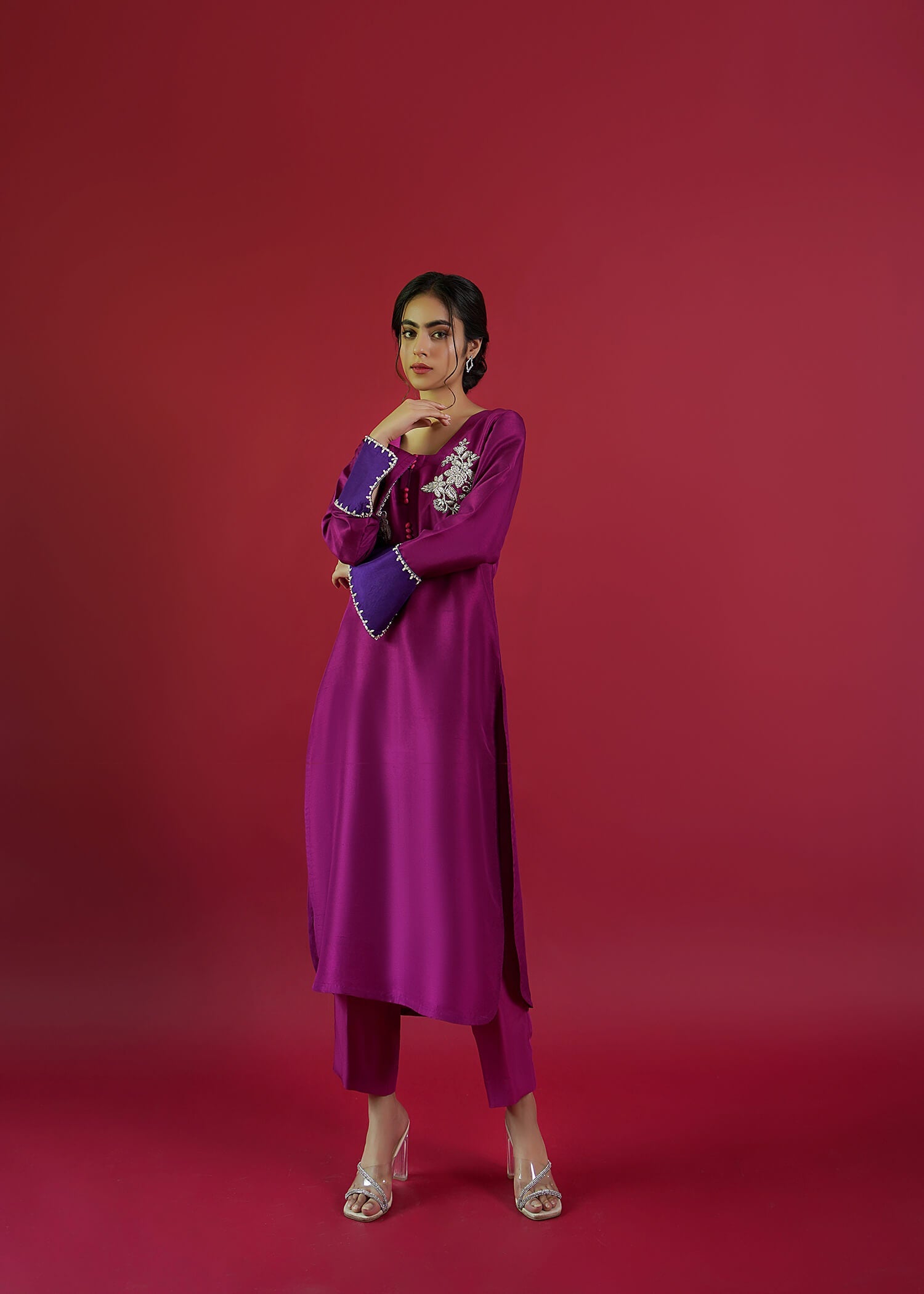 Pure Raw Silk, Pants: Pure Raw Silk, Details: Hand-embroidered motifs on the neck and a contrasting patch on the sleeve with hand embellishments