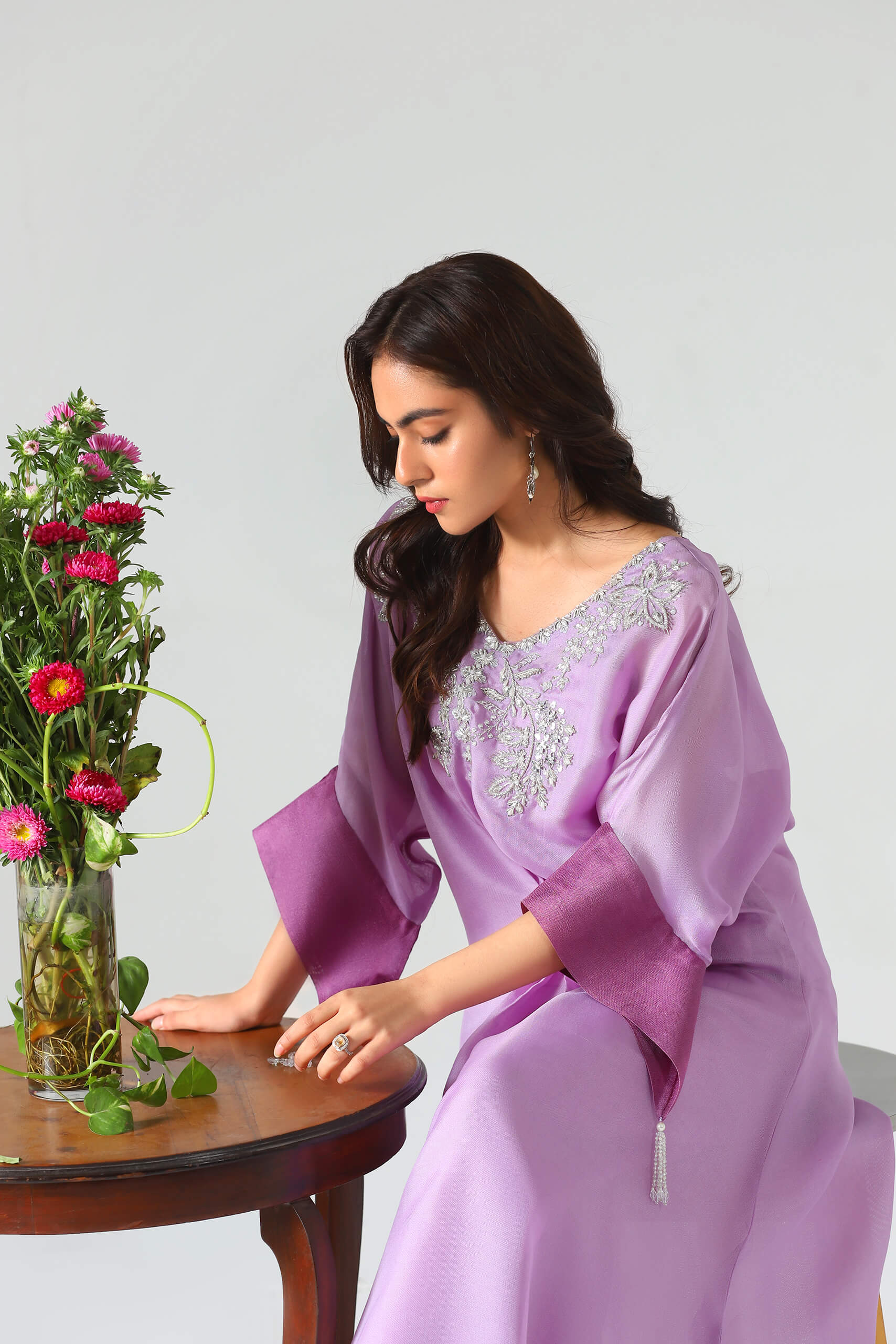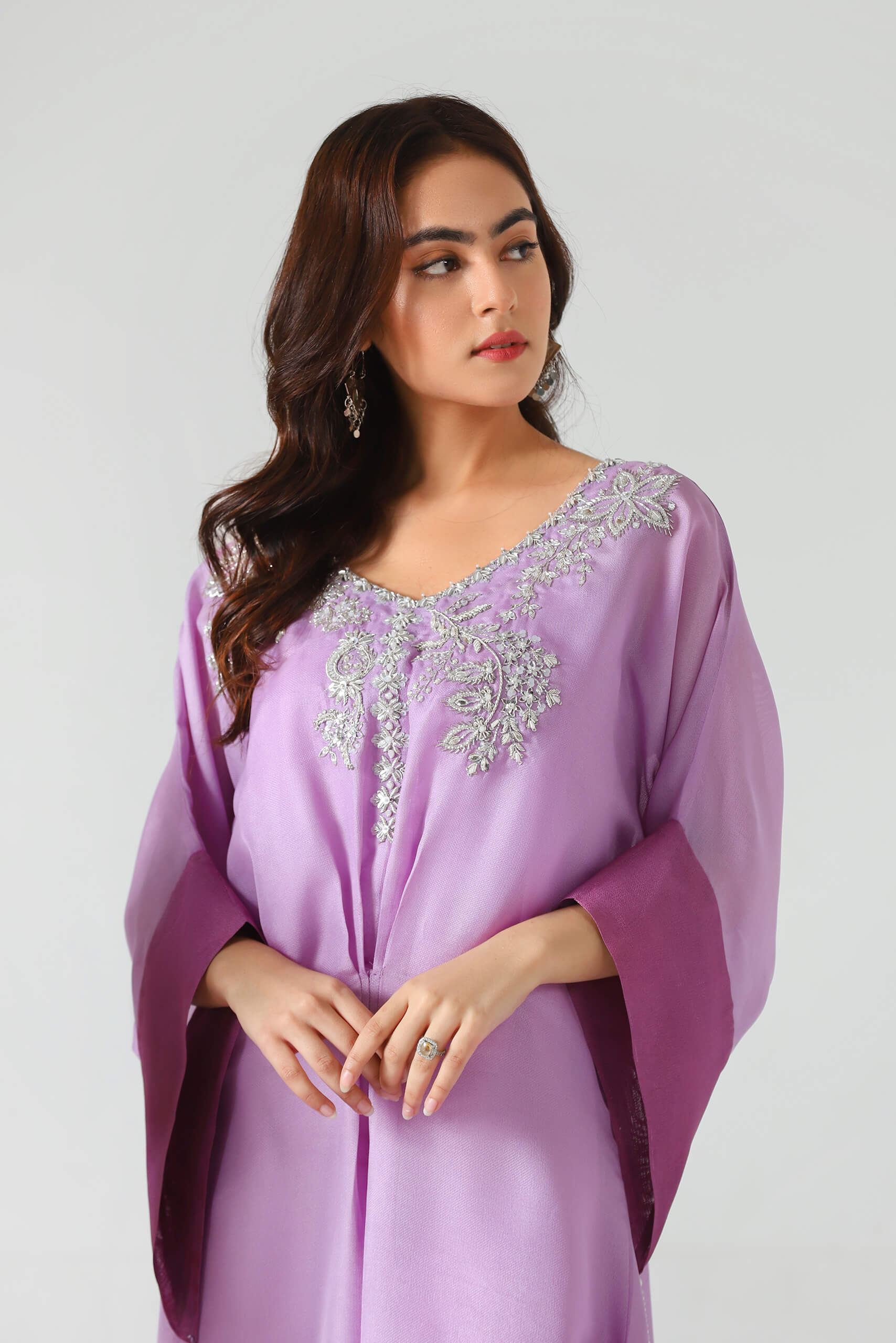 Misaal is a beautiful long Kaftaan in shades of Lilac, rendered with beautiful hand embroidery on a pure silk net fabric. the pure viscose silk pants complete the look, thus making it perfect choice for the festivities.