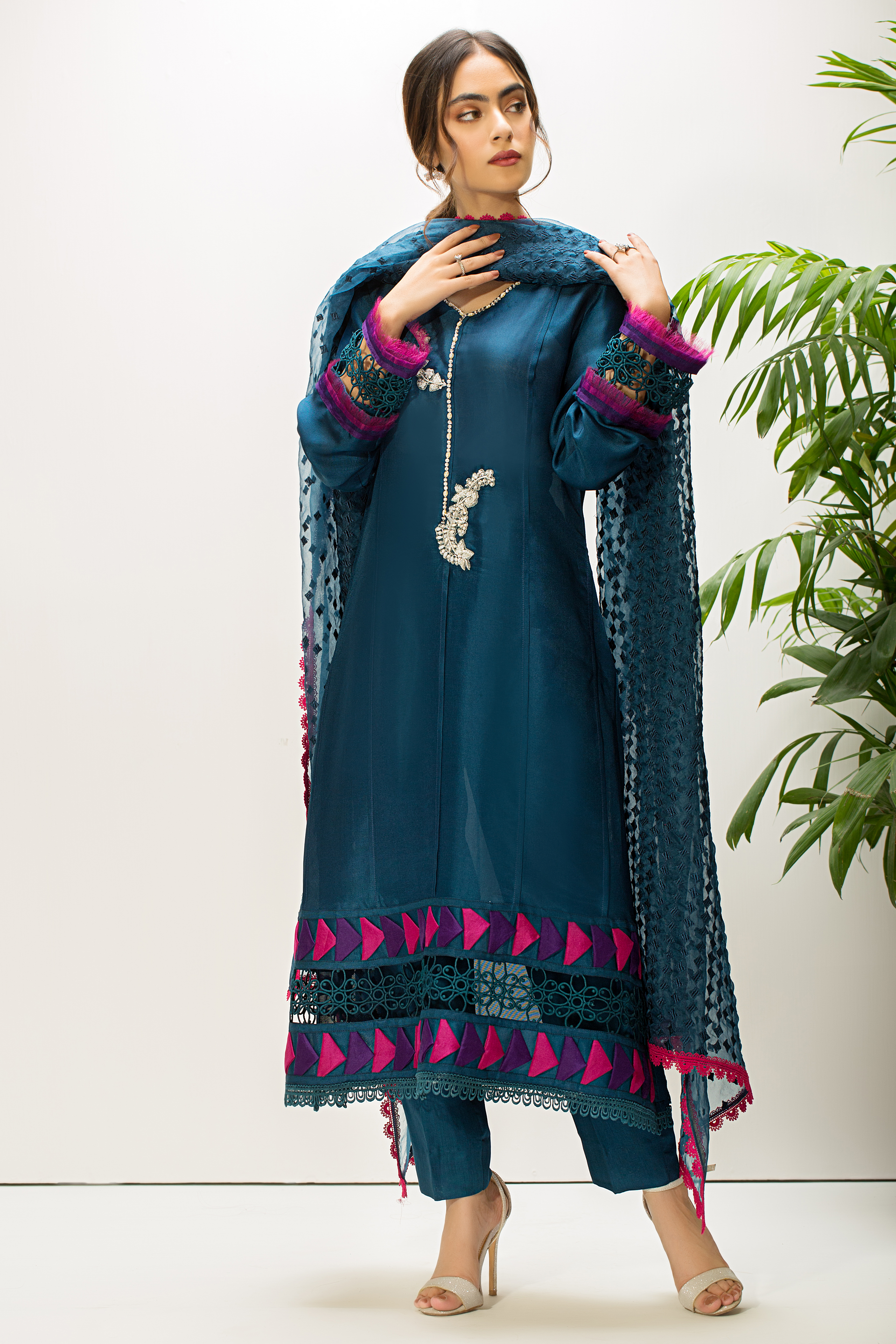 This teal silk net flared shirt with contrasting fabric trimmings on daman and sleeves is enhanced with beautiful hand embroidered motifs on neckline. The relaxed silhouette is an elevated with embroidered dupatta thus giving it a versatile occasion wear look.
