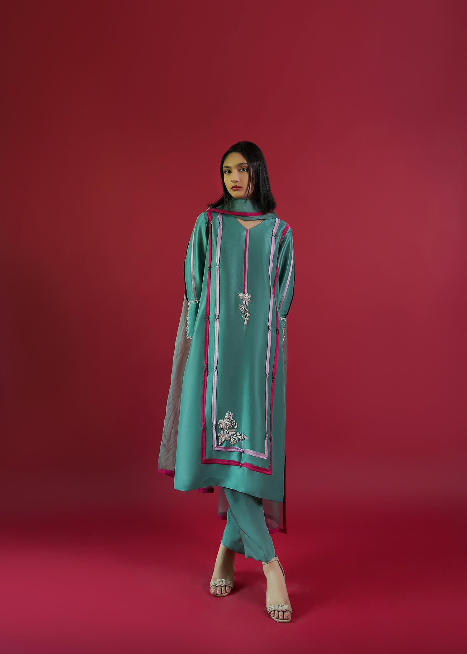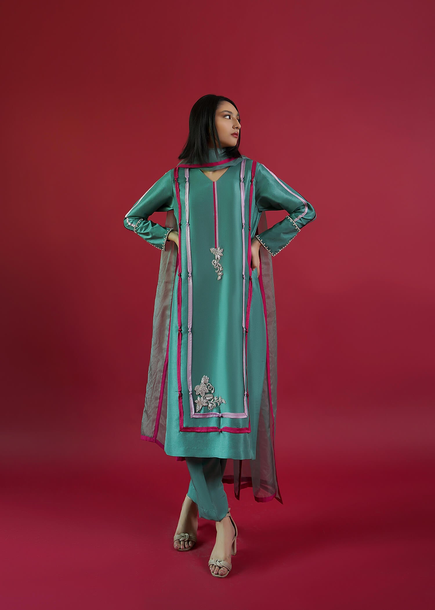 Pure Raw Silk, Dupatta: Organza, Pants: Pure viscose Silk, Details: Hand embroidered motifs on the ban and daman with contrasting intricate fabric detailing on shirt and sleeves.