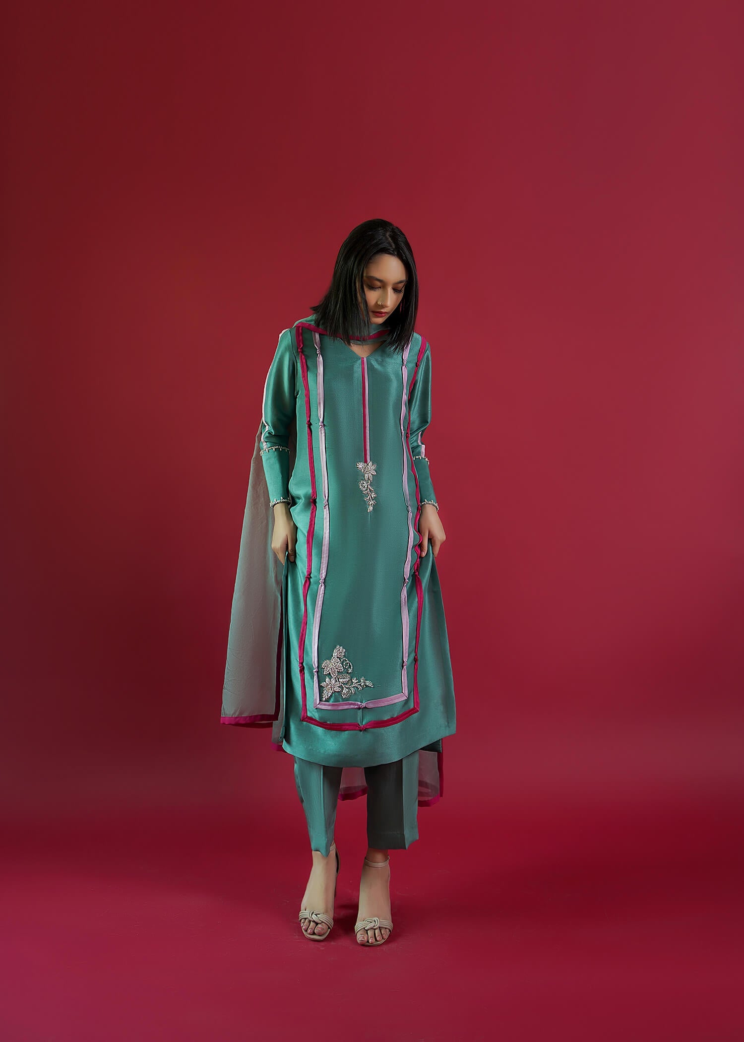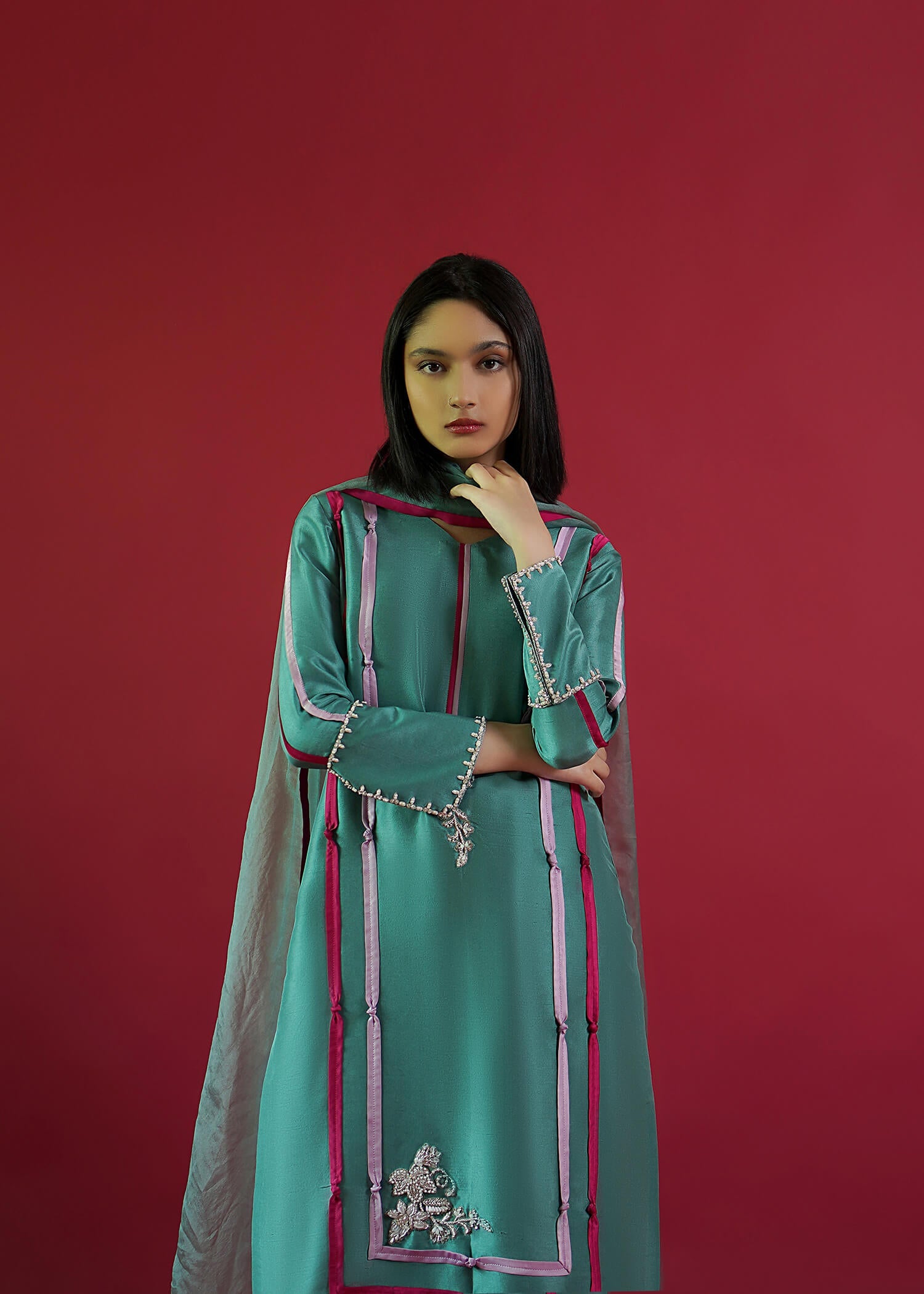 Natalia is an exquisitely inspirational silhouette on a pure raw silk base for the shirt and pants curated masterfully with hand-embellished motifs on the ban and daman along with contrasting fabric embroidery on the shirt and sleeves. It comes with a striking organza dupatta and pure raw silk pants manifesting the eternal beauty for your celebrations.