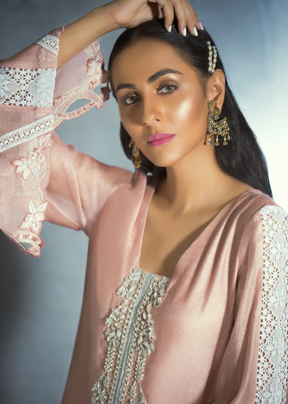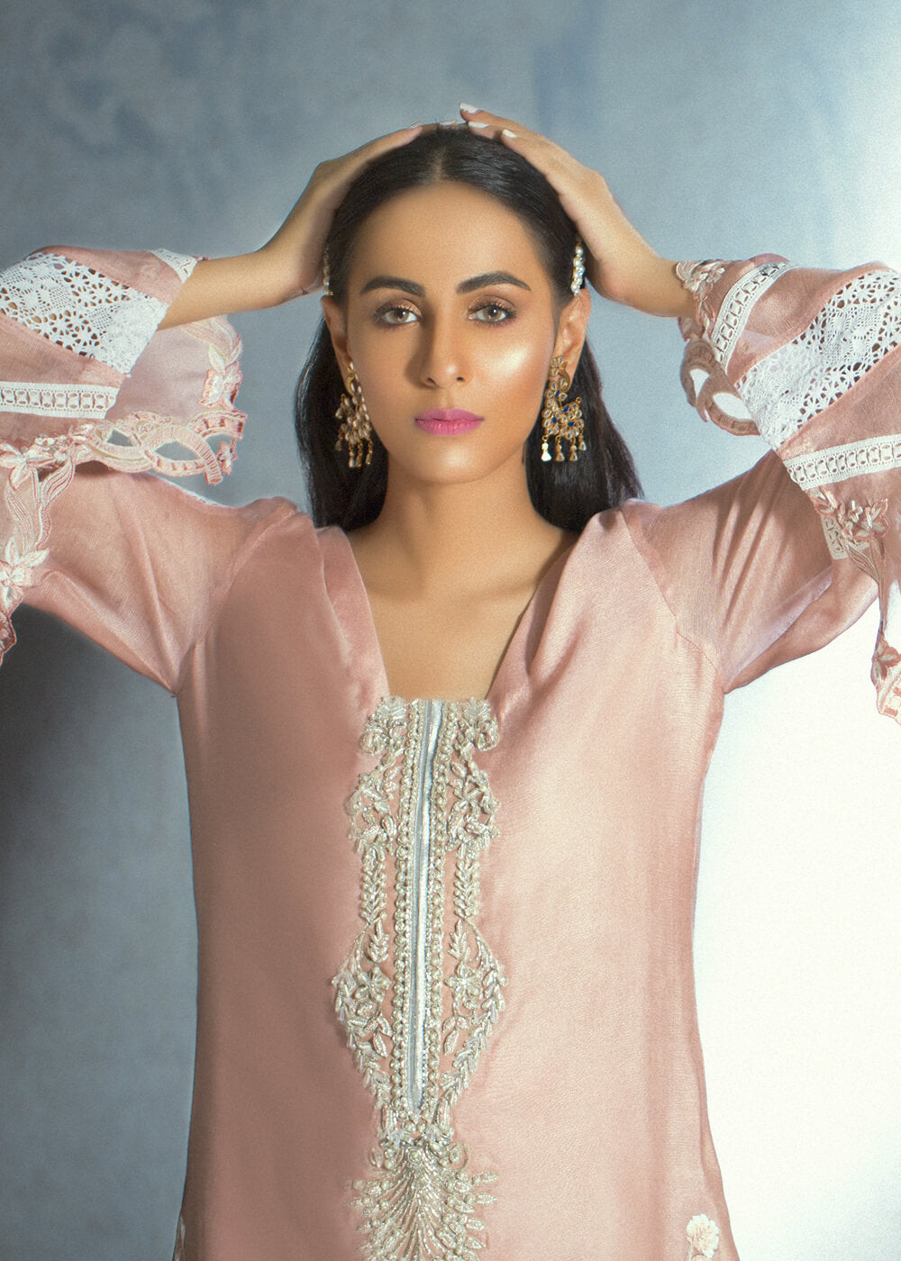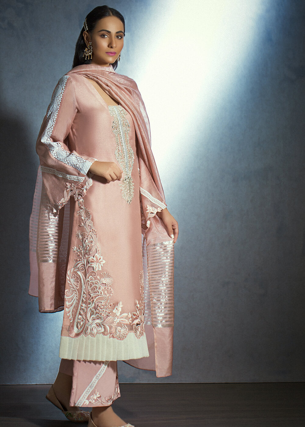 A gorgeous shade of tea pink serves as the canvas for Nauroz. This long flattering qameez with cut work embroidery on the sides and beautiful hand embroided neckline over a cotton net shirt gives it a regal look. The organza trims at the ghera with cotton net zari duppata and embroided trousers complete the look.