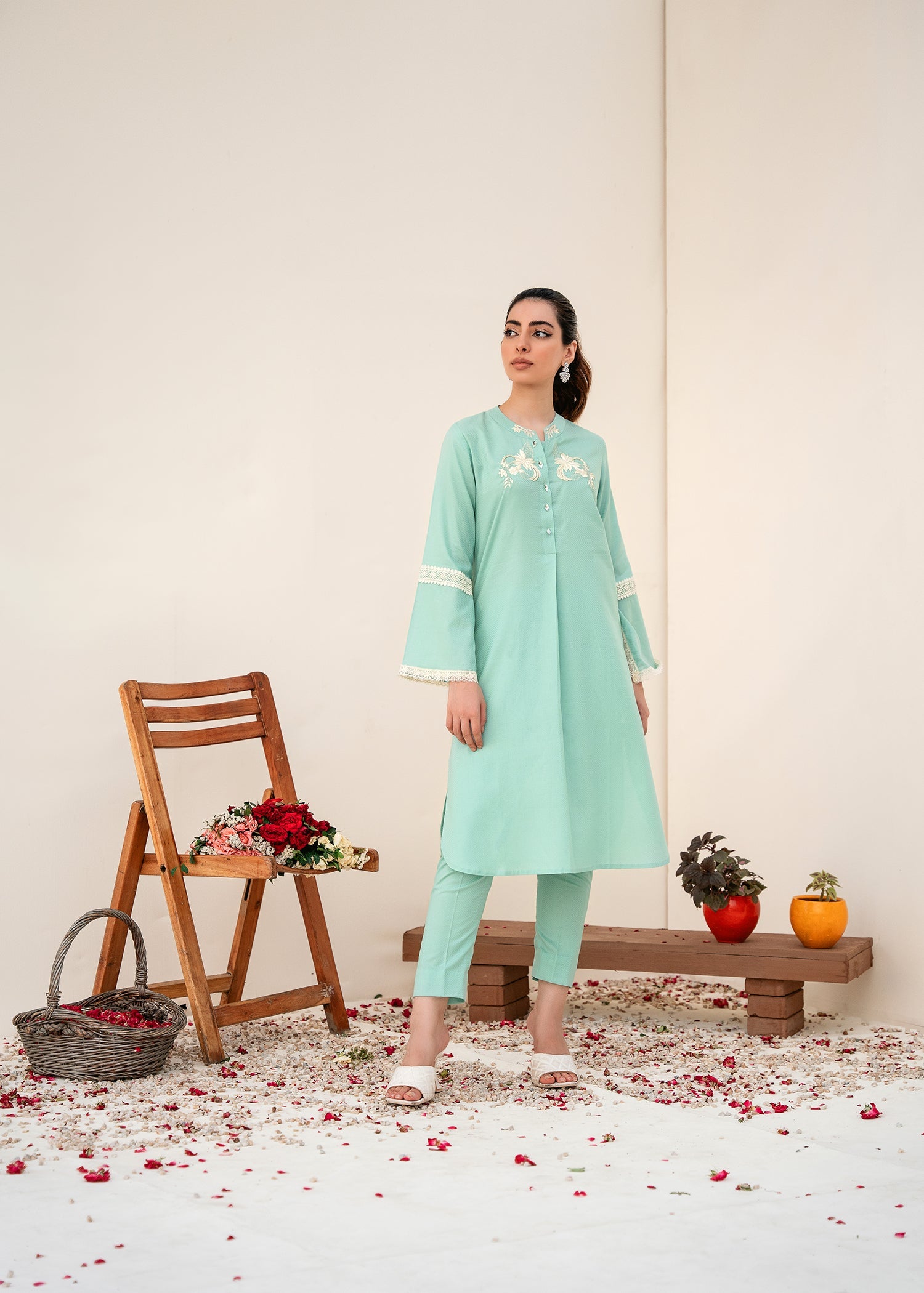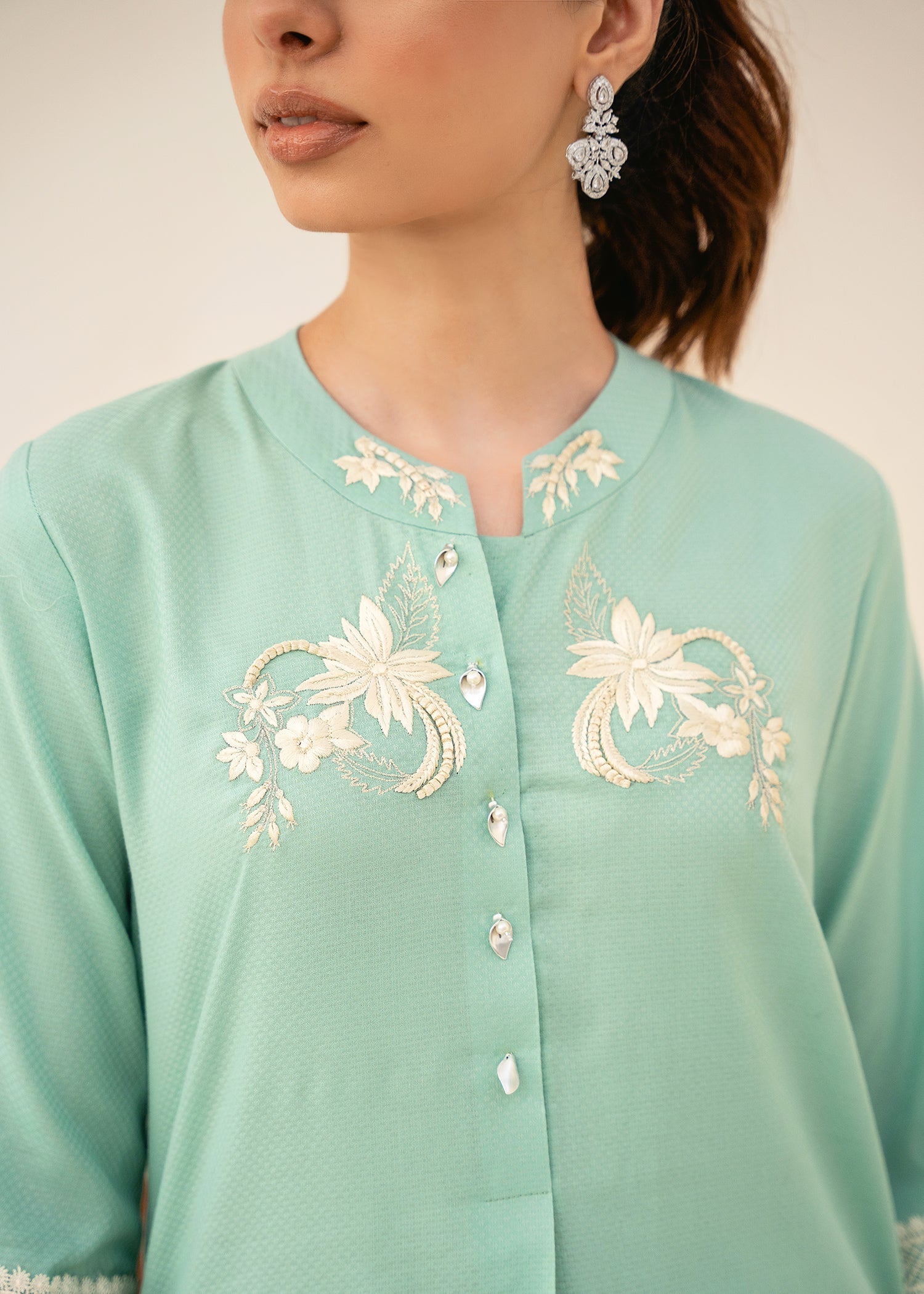 The dress features high-quality aqua-colored fabric that has a beautiful sheen, adding a touch of sophistication to the ensemble. The neckline of the dress is adorned with exquisite embroidery motifs with sleeves featuring lace details thus adding a feminine and graceful touch.