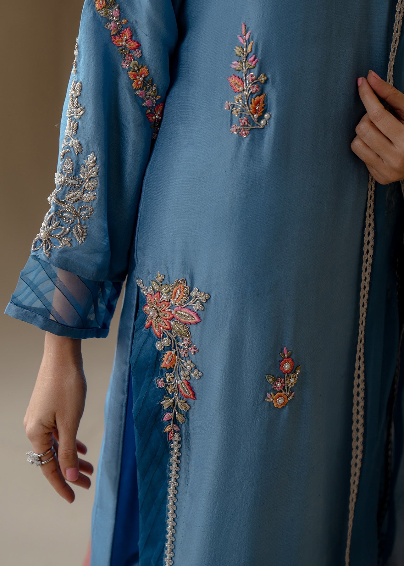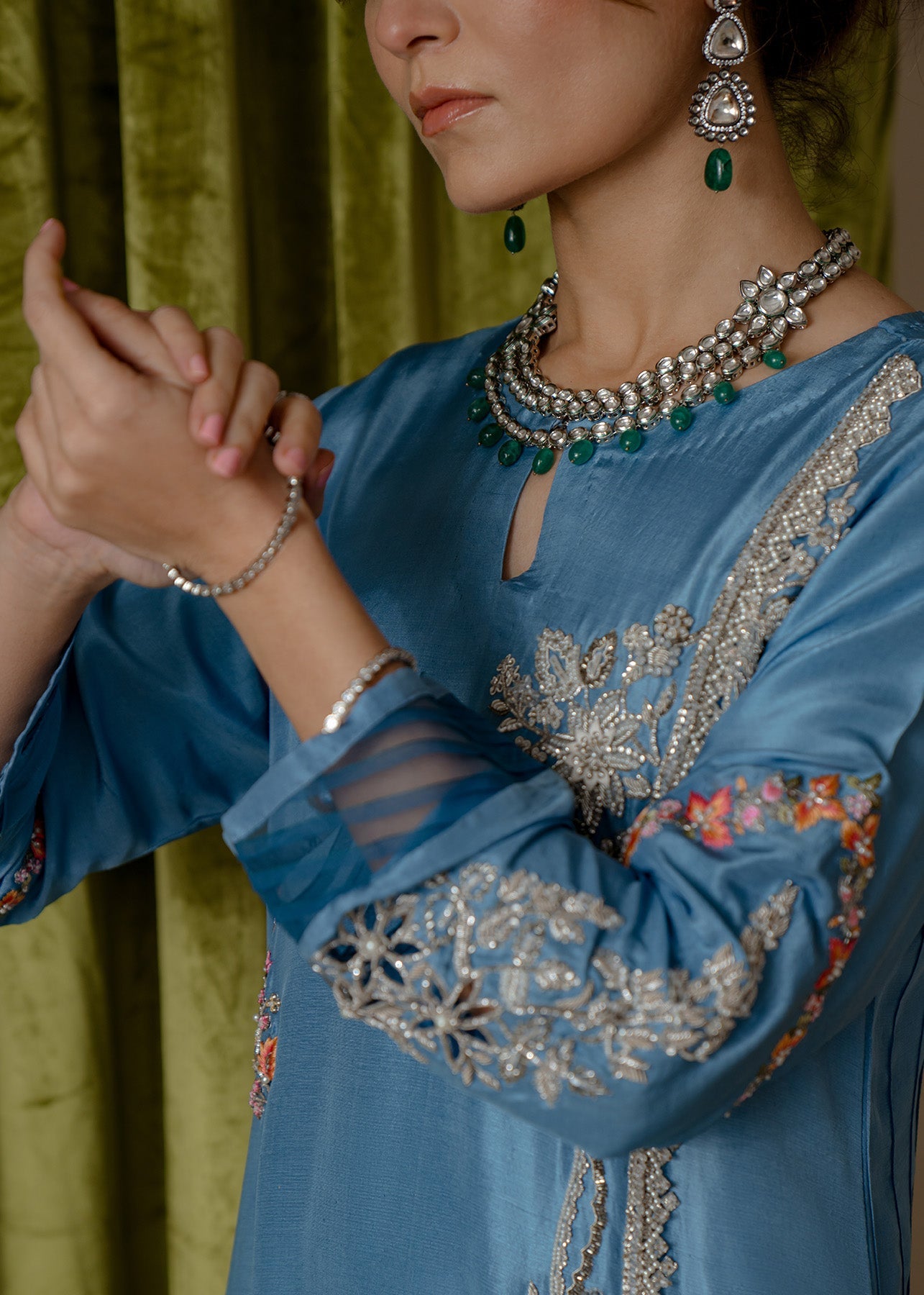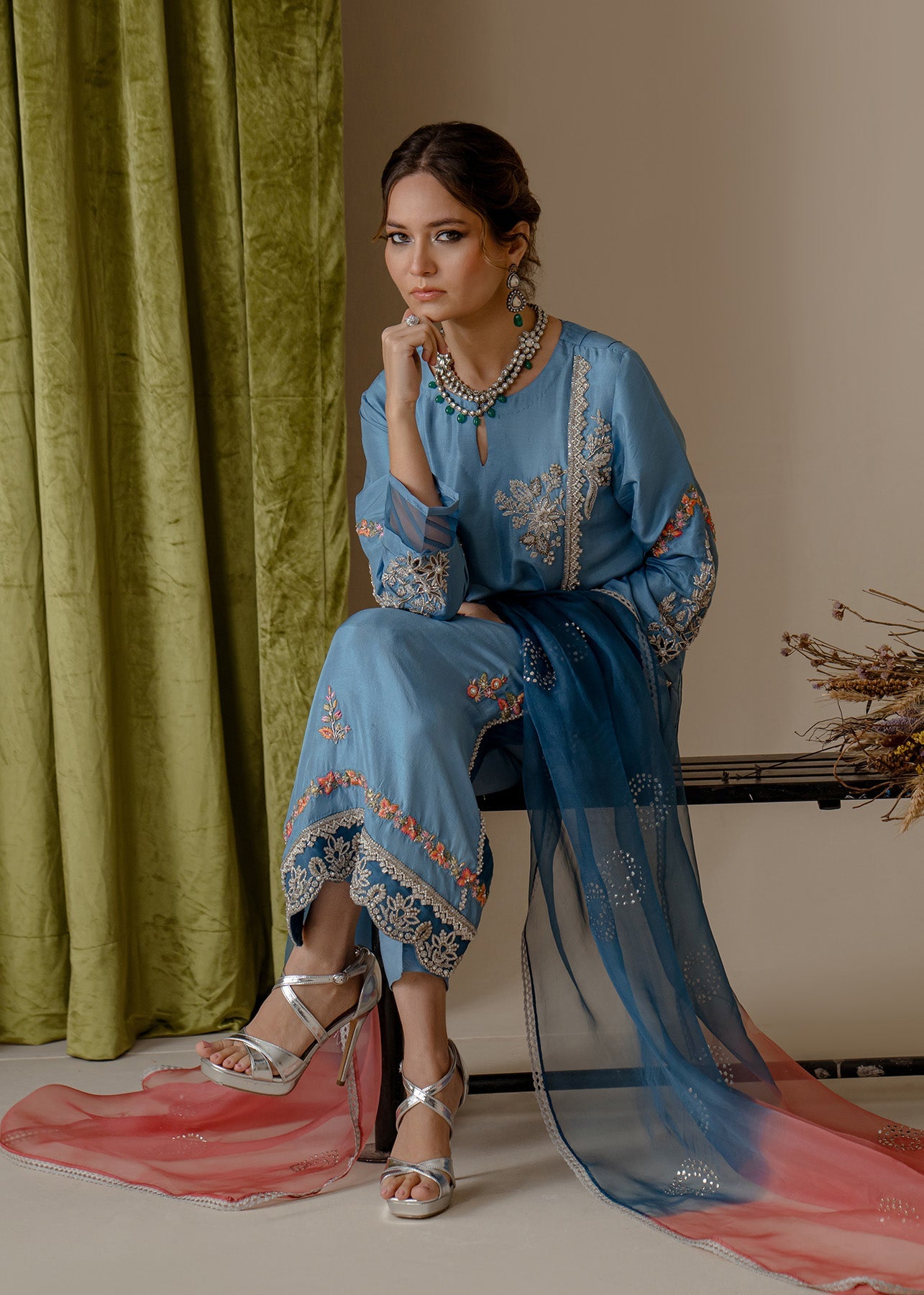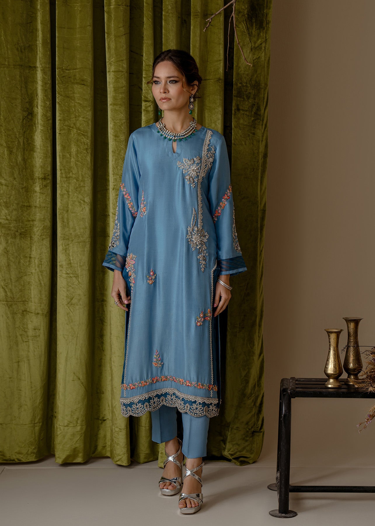 A long straight rawsilk shirt is adorned with beautiful hand embriodery in silver zardoze and contrasting delicate resham work. The shirt is paired with viscose silk pants and kamdani orgenza duppata, just giving it a tradiontail yet edgy flair to the entire look.